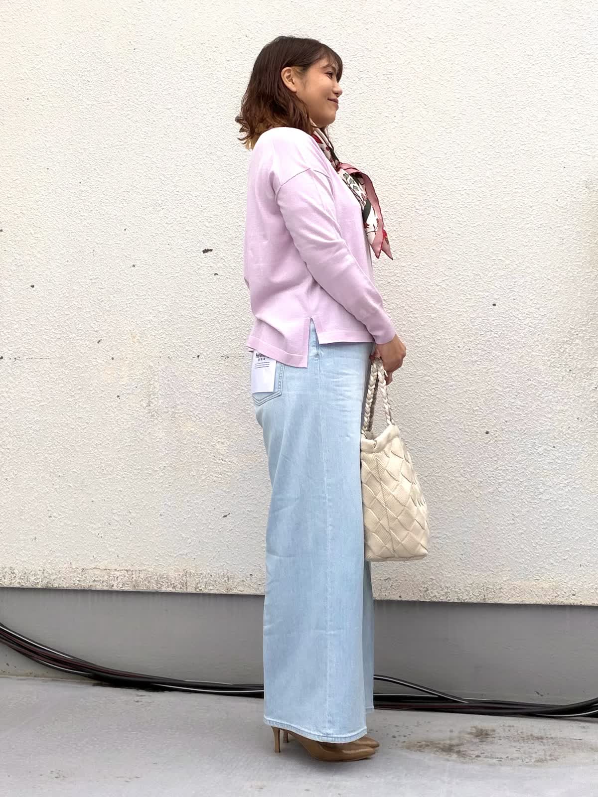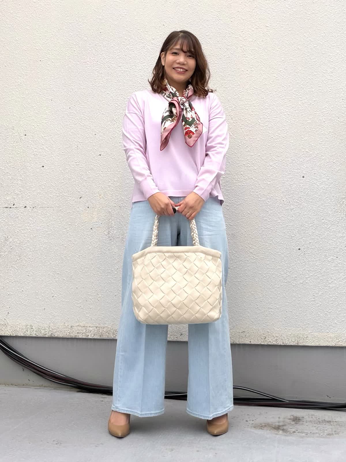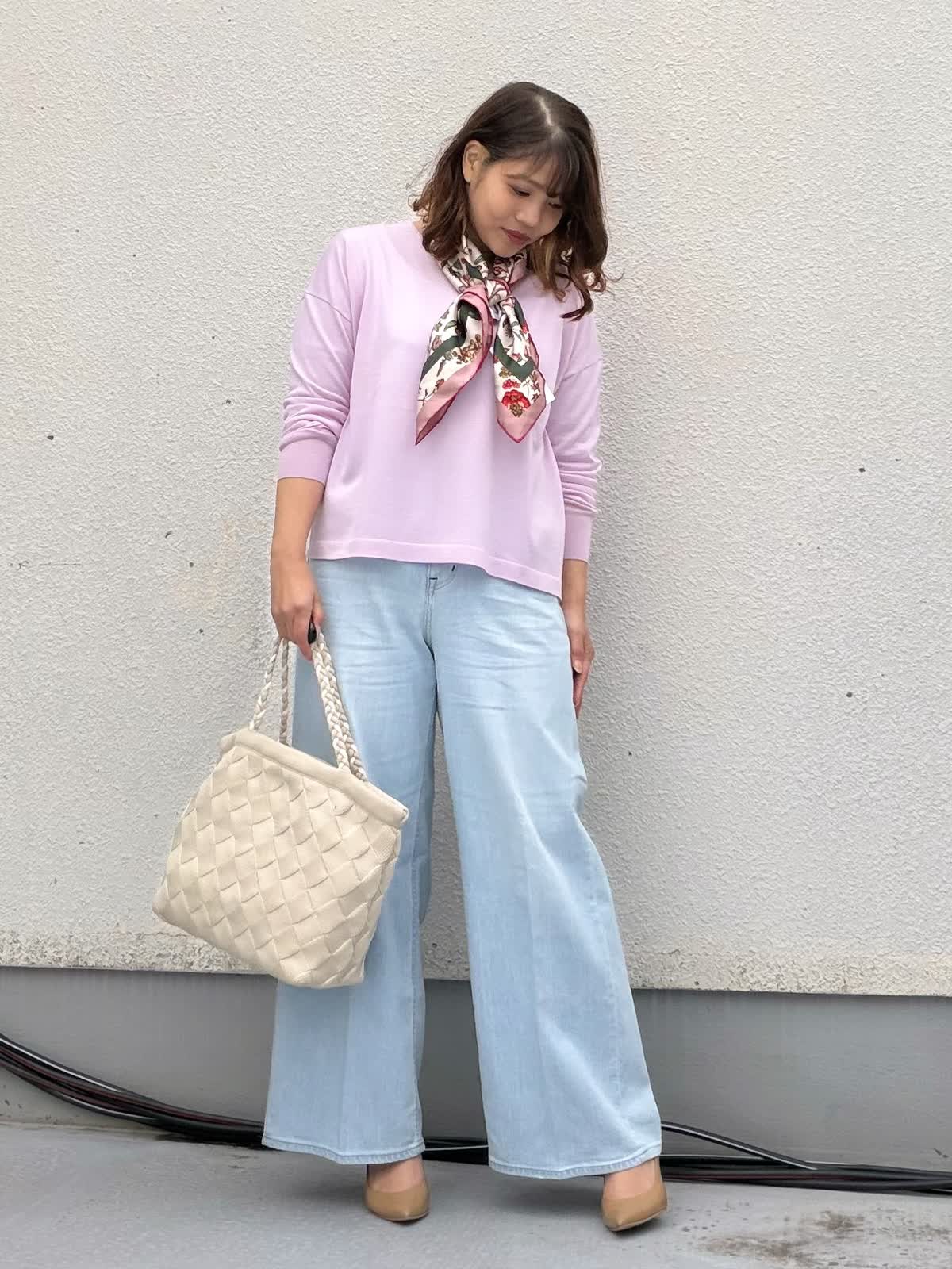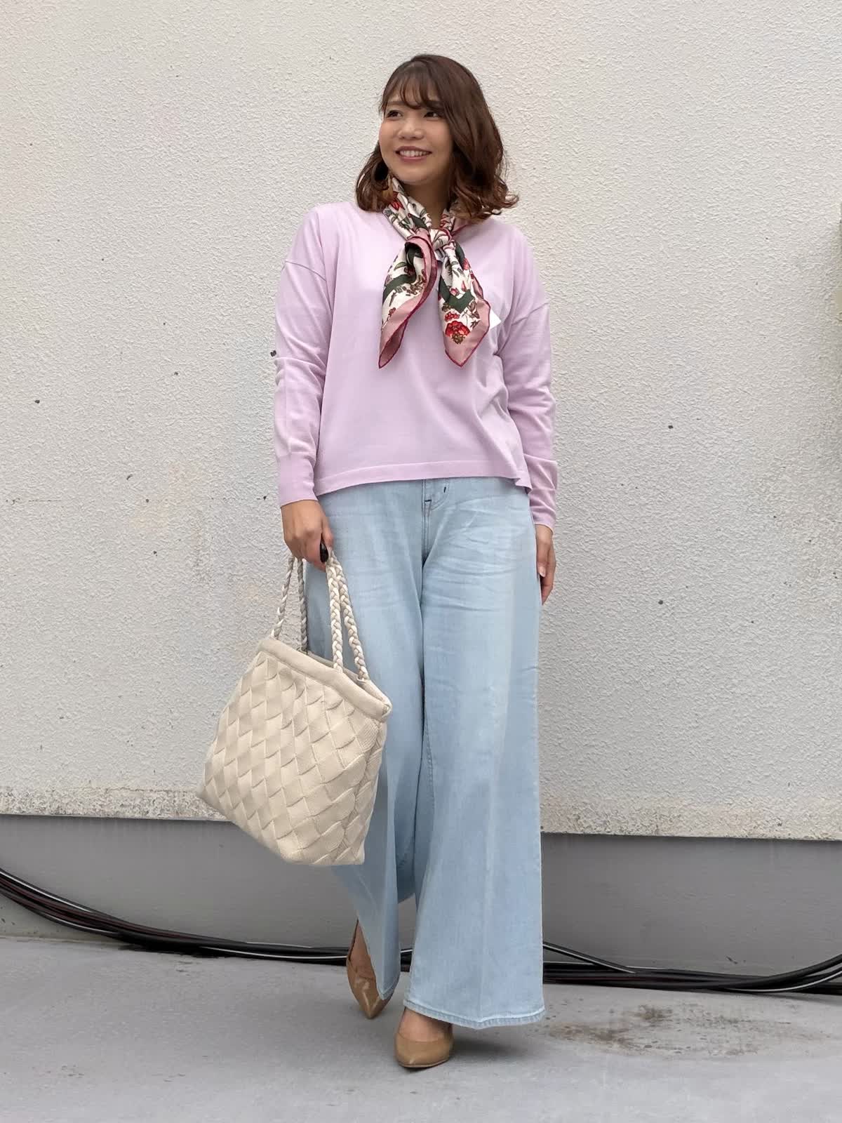 【着用アイテム:カラー/サイズ】 ニット:ラベンダー/9号 パンツ:サックス/11号 淡いピンクのニットは、柔らかな肌映りで顔まわりを明るく見せてくれる一枚。 程よくゆとりのあるシルエットで、身体のラインを拾わずリラックス感がありながらも上品な印象に仕上がります。 首元にはスカーフをプラスすることで、シンプルなニットスタイルに華やかさプラスされます。 視線が上に集まり、スタイルアップ効果も◎ ボトムはライトブルーのワイドデニムを合わせ、春らしい軽やかさを演出。 センタープレス風のシルエットで、カジュアルになりすぎず大人のきれいめカジュアルに。