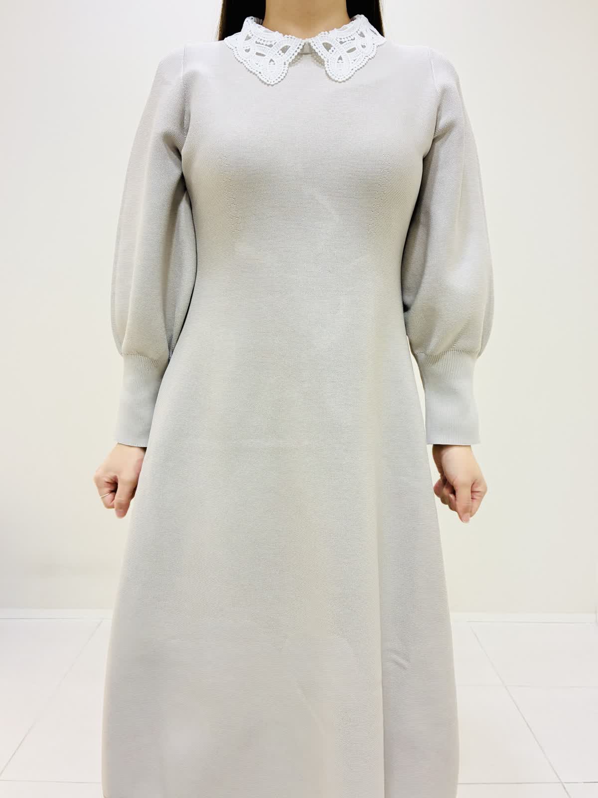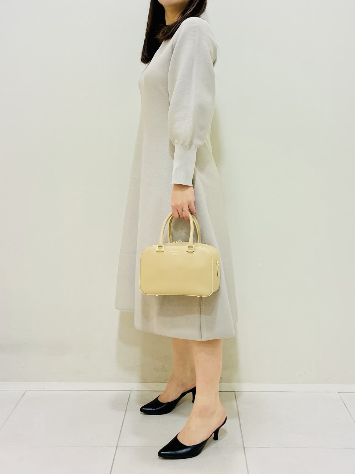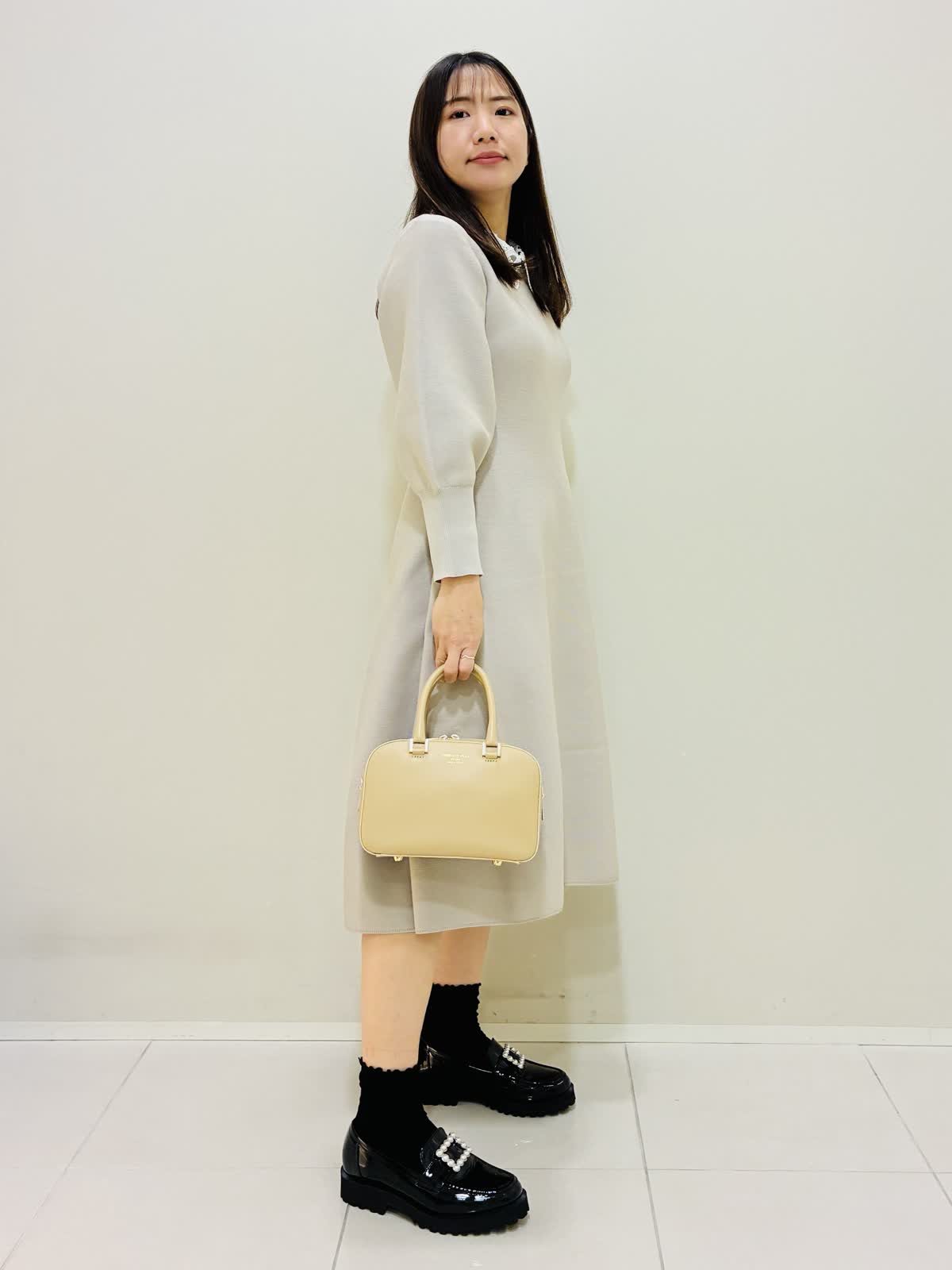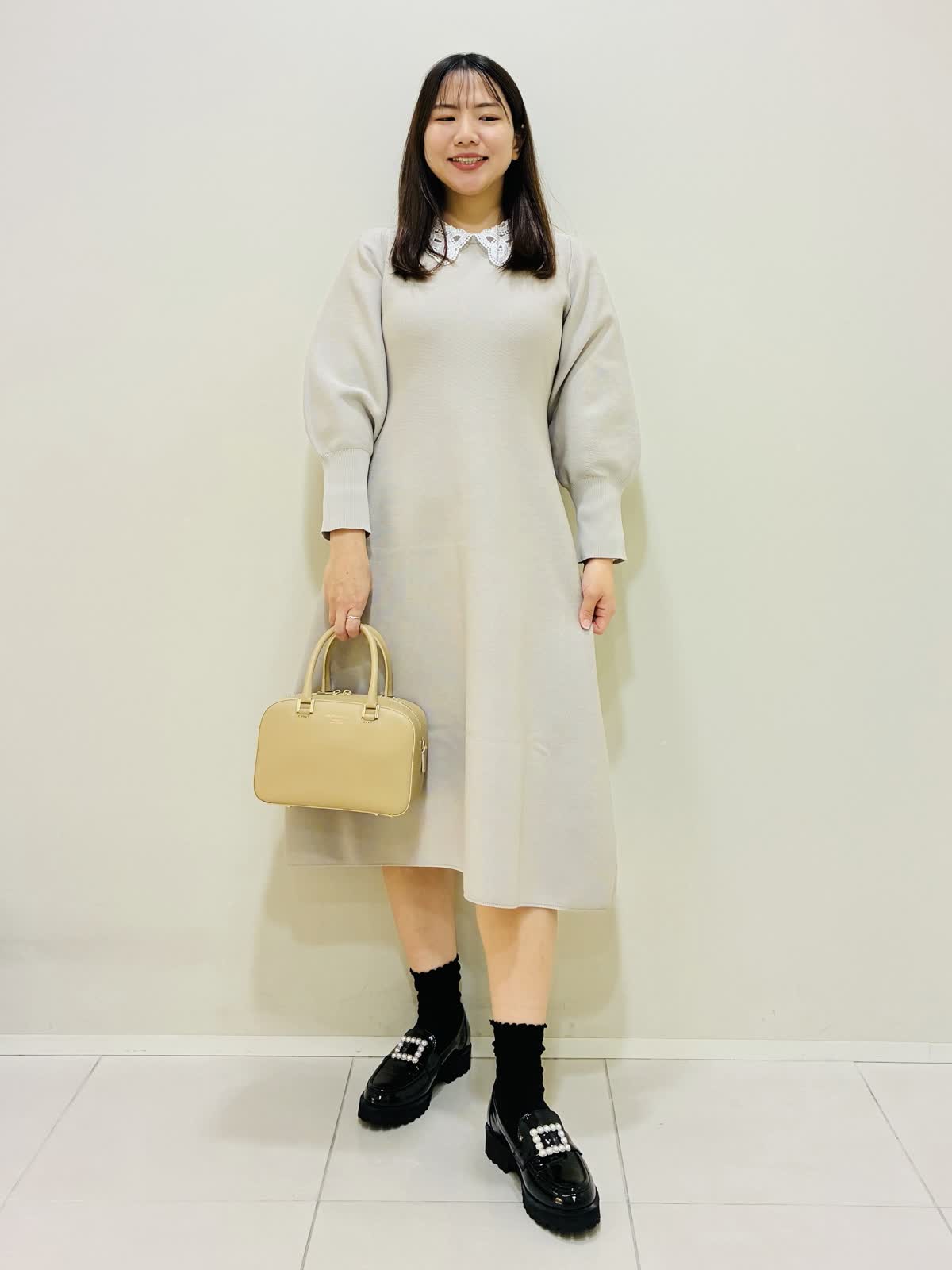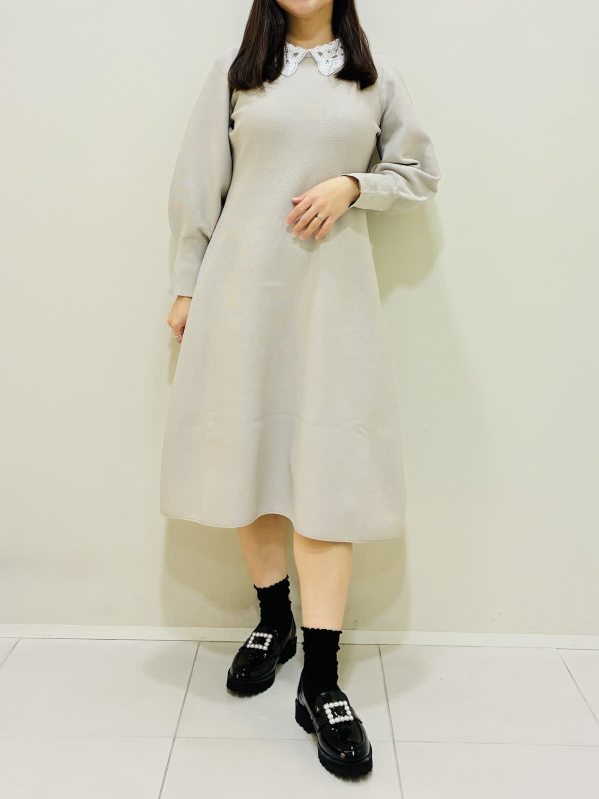 【着用サイズ】 ワンピース:ベージュ:9号サイズ 靴:22(23cm) バッグ:ベージュ 『ニットワンピースコーデ』 ネック後ろの一つボタンで着るタイプのワンピースで、ファスナーではないので伸縮性がすごくあります。 ウエストは高めな位置にあり、すごく楽なのにキレイに見える嬉しいデザインです。 刺繍衿を取り外すと、シンプルなデザインになるのでフォーマルな場面やキレイめに着たい時におすすめです。 ローファーは履き心地も良くピッタリサイズをおすすめします。