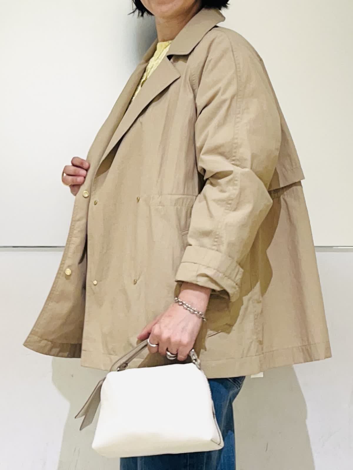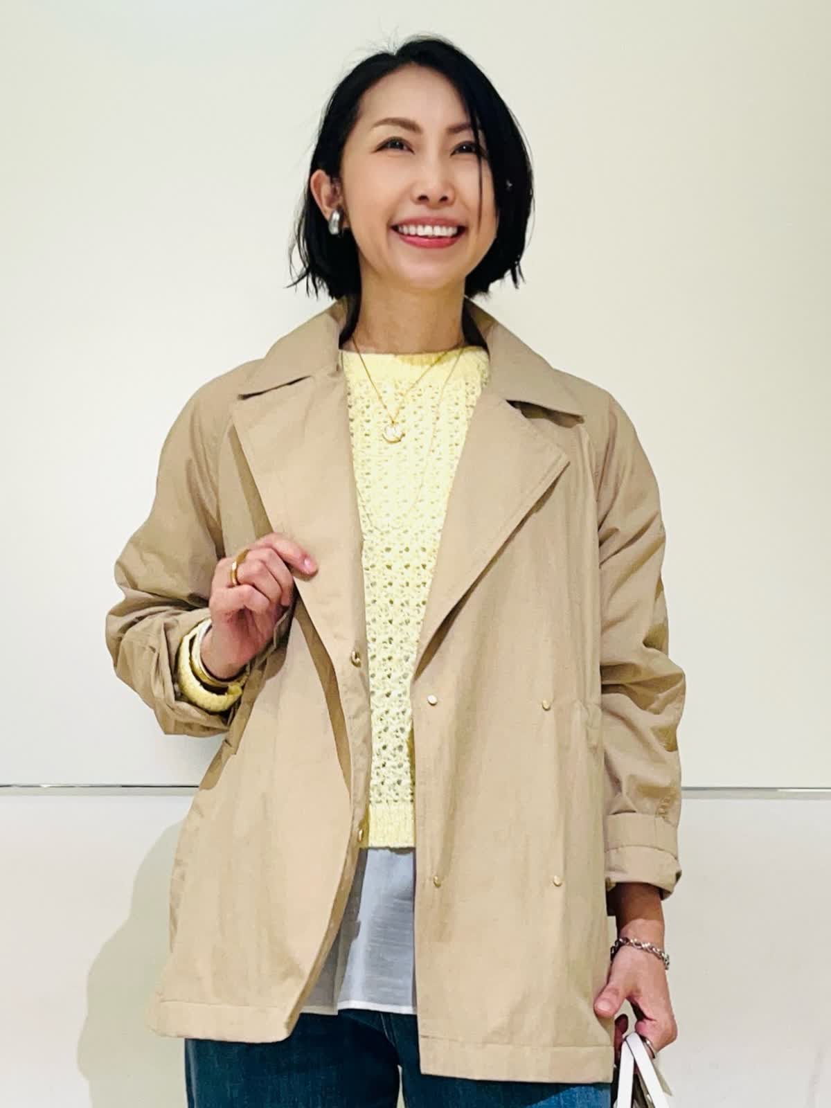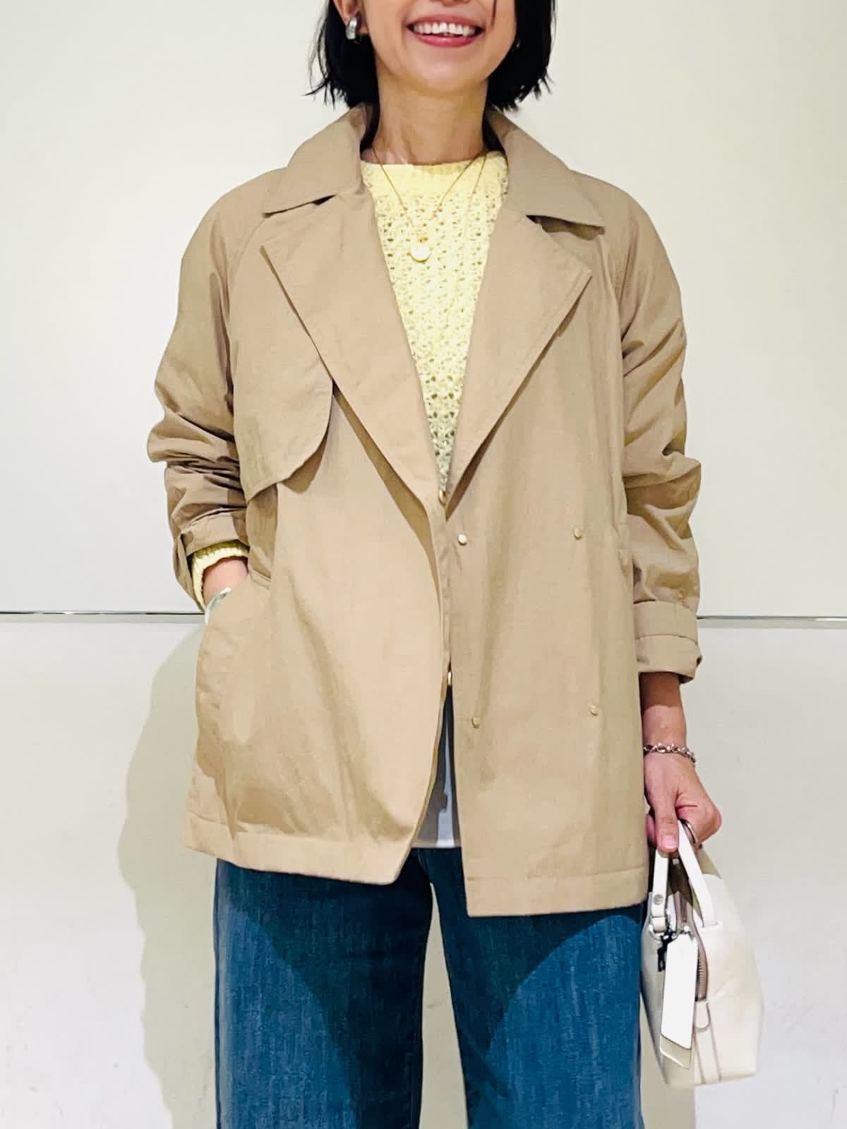 【着用アイテム】すべて9号 【着用カラー】コート:キャメル ニット:イエロー ブラウス:アイボリー パンツ:インディゴ 春のコートスタイリング。テーラードジャケットのようなショートコート。ドライタッチでハリのある素材感で、自分の好きな形で着られるコート。袖口のボタンで袖のデザインを変えたり、ウエストのドロストを絞ってコンパクトに着たりと変幻自在。袖をギュッと捲って、あまり絞らず着流し風にルーズに着る着方がお気に入りです。