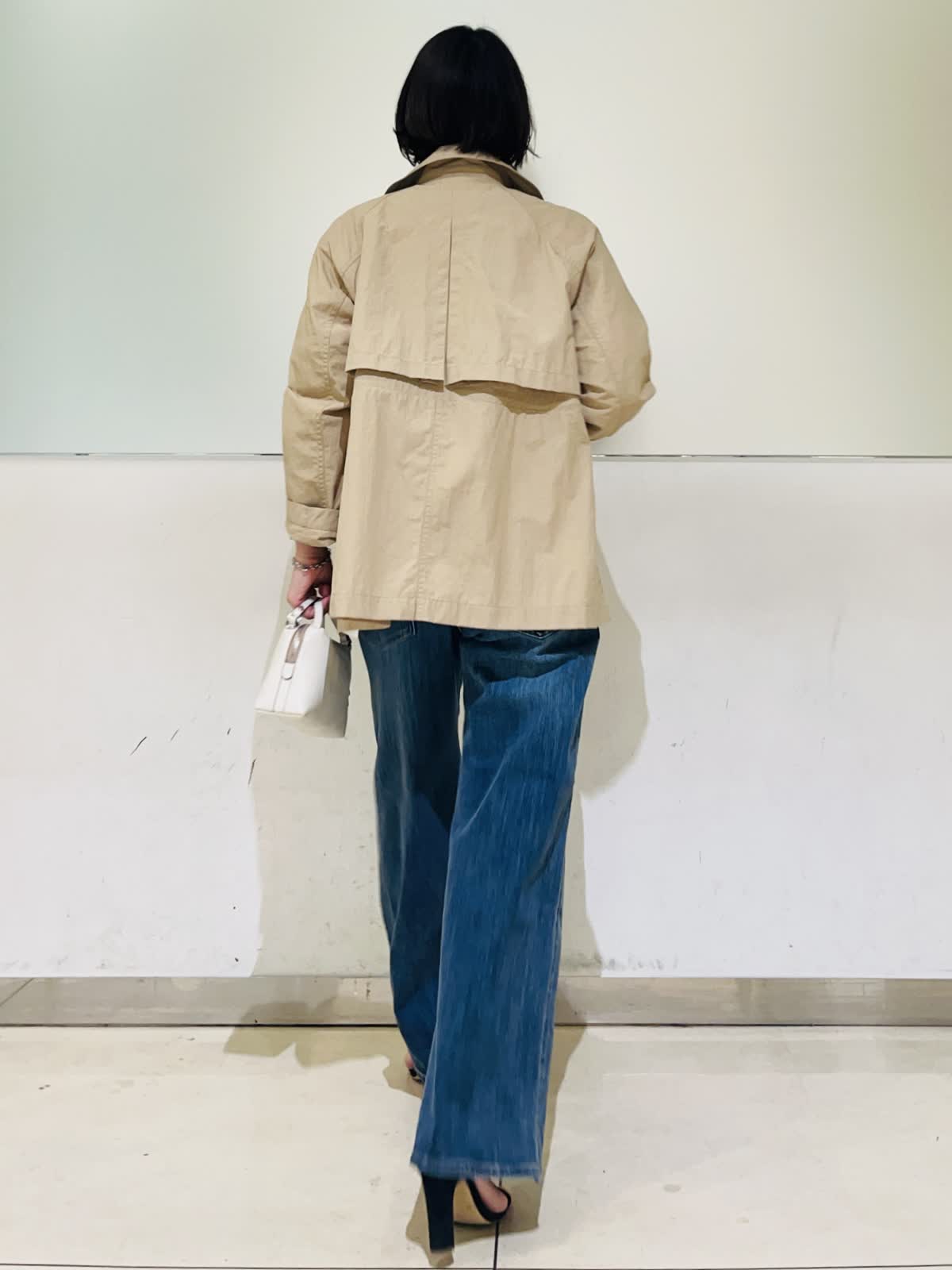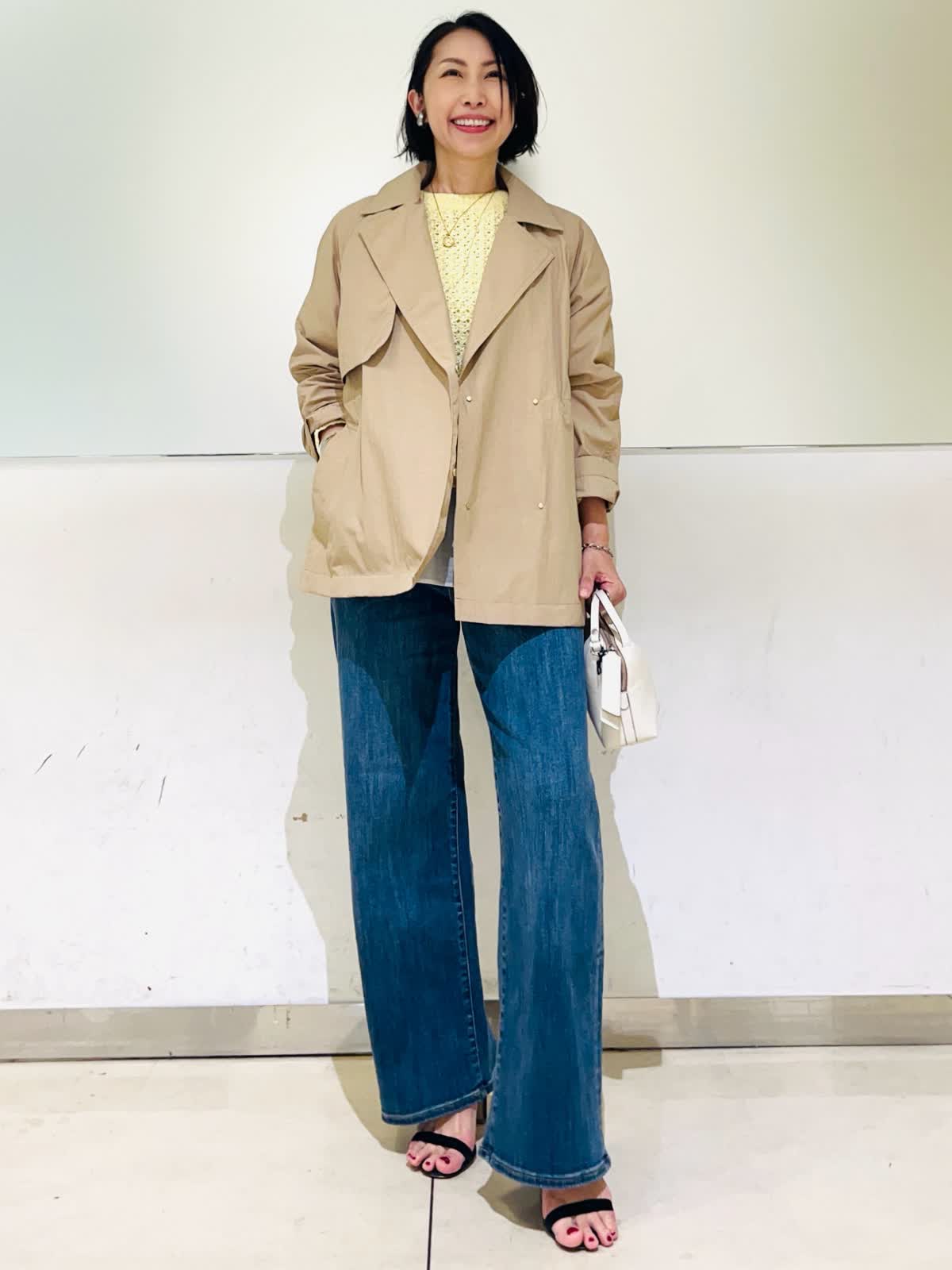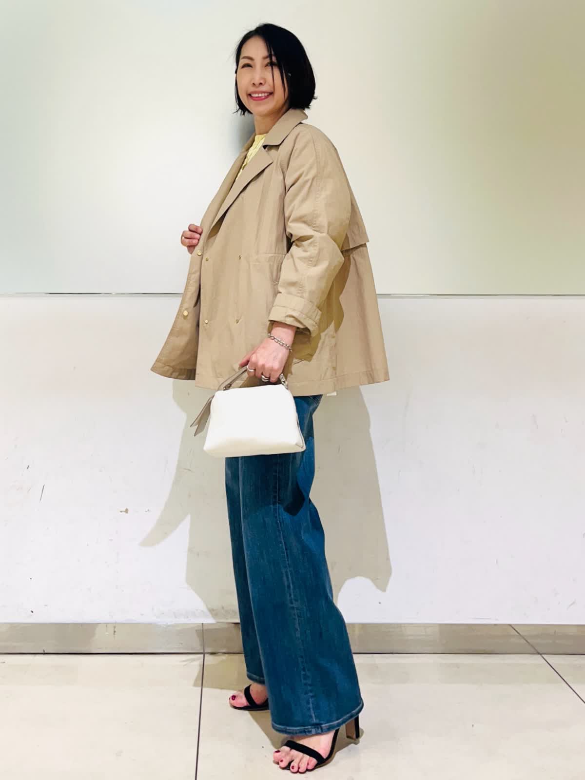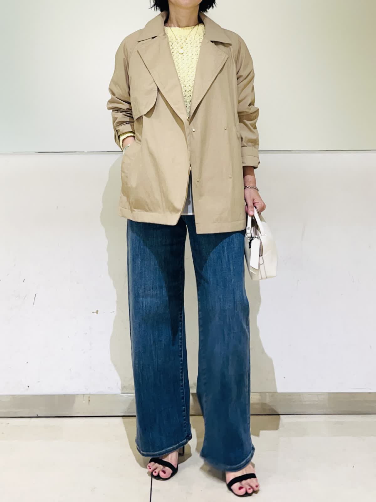 【着用アイテム】すべて9号 【着用カラー】コート:キャメル ニット:イエロー ブラウス:アイボリー パンツ:インディゴ 春のコートスタイリング。テーラードジャケットのようなショートコート。ドライタッチでハリのある素材感で、自分の好きな形で着られるコート。袖口のボタンで袖のデザインを変えたり、ウエストのドロストを絞ってコンパクトに着たりと変幻自在。袖をギュッと捲って、あまり絞らず着流し風にルーズに着る着方がお気に入りです。