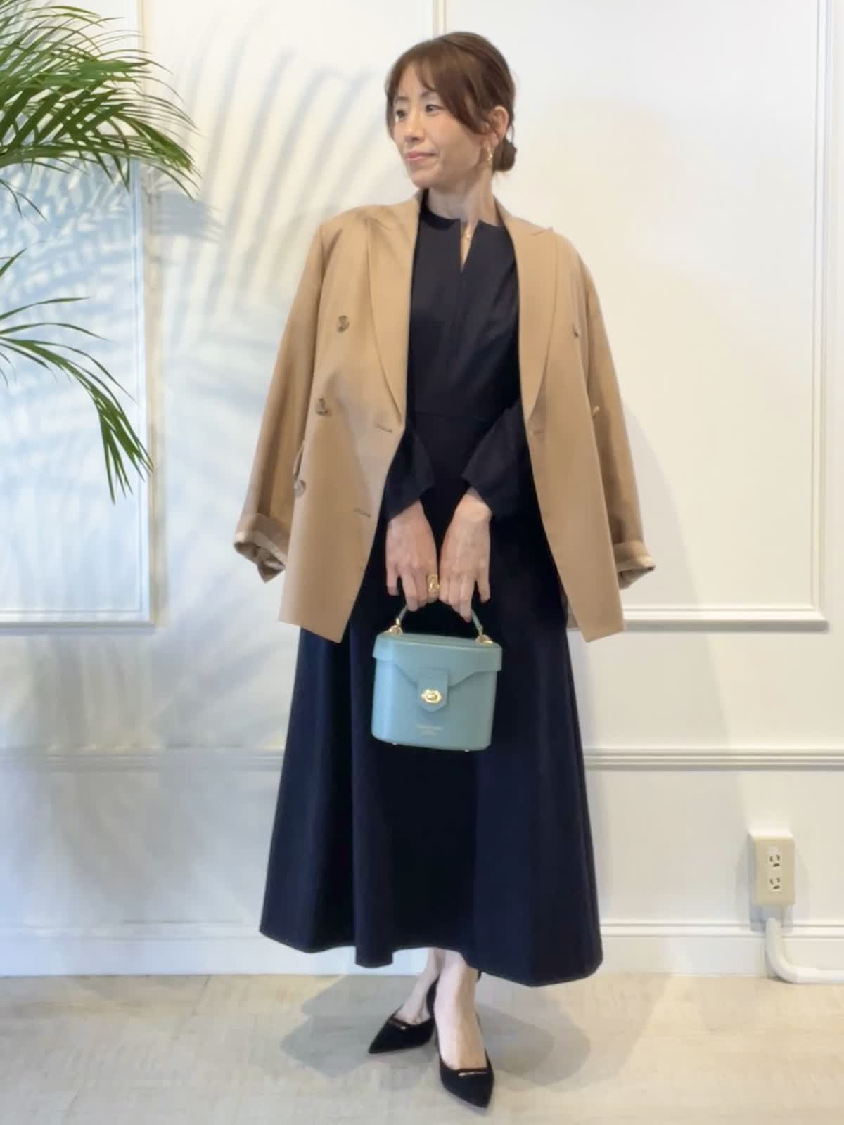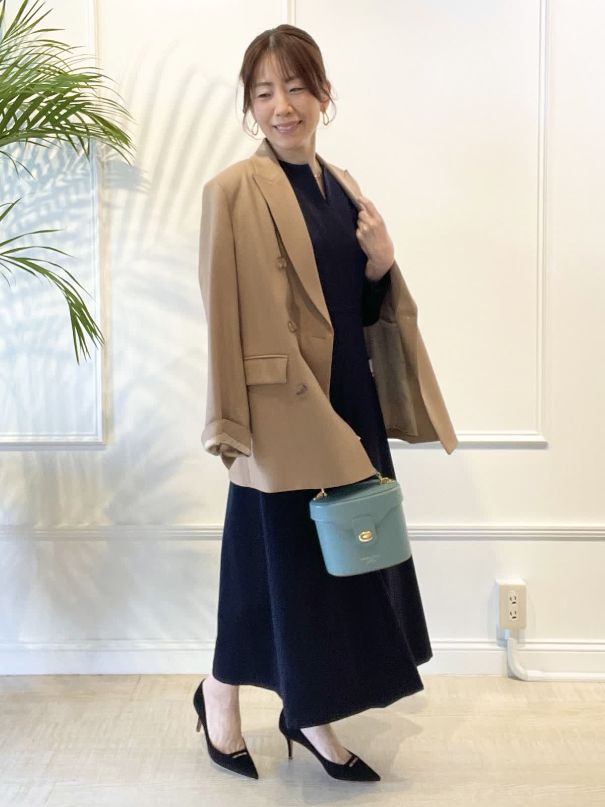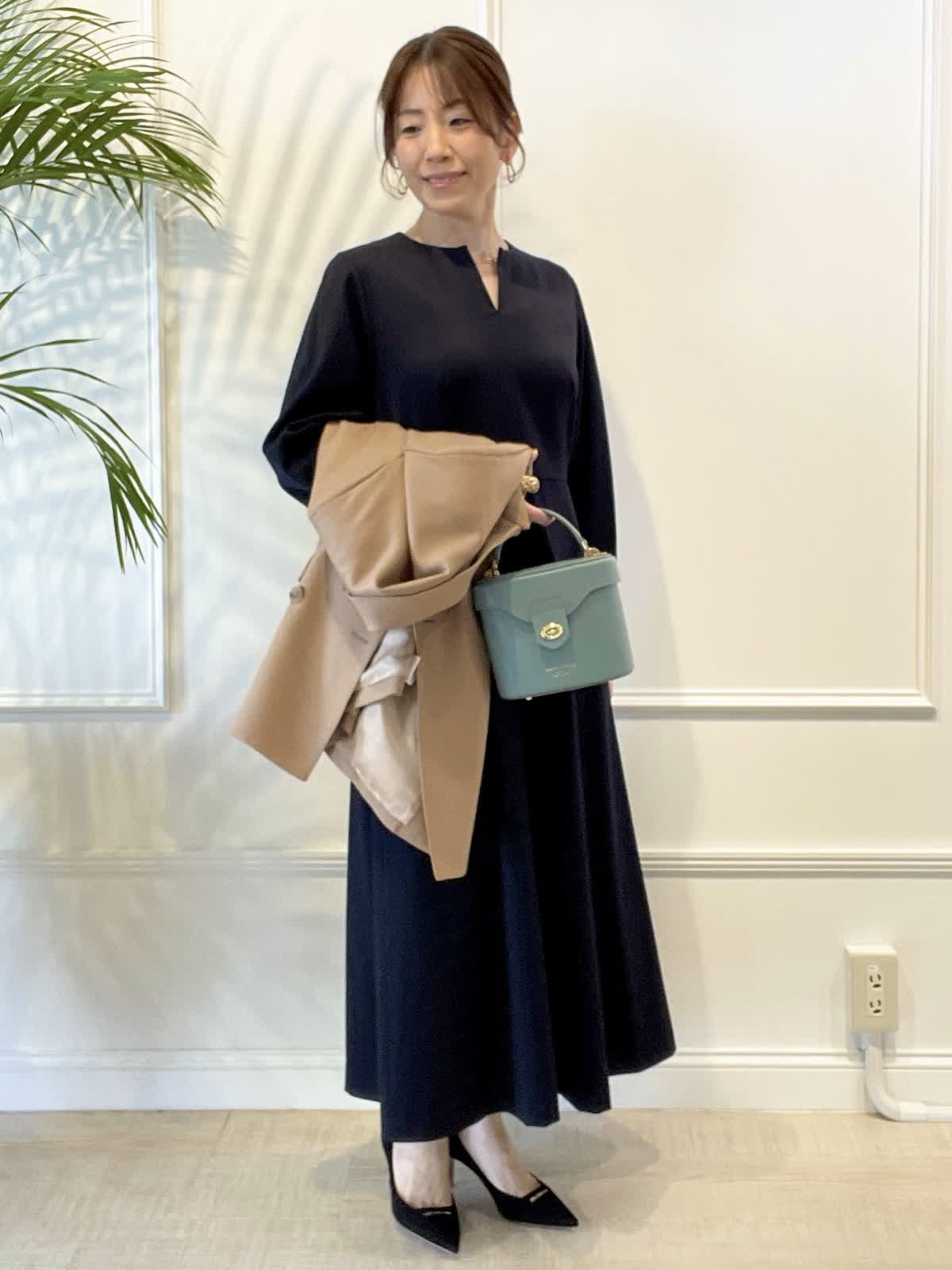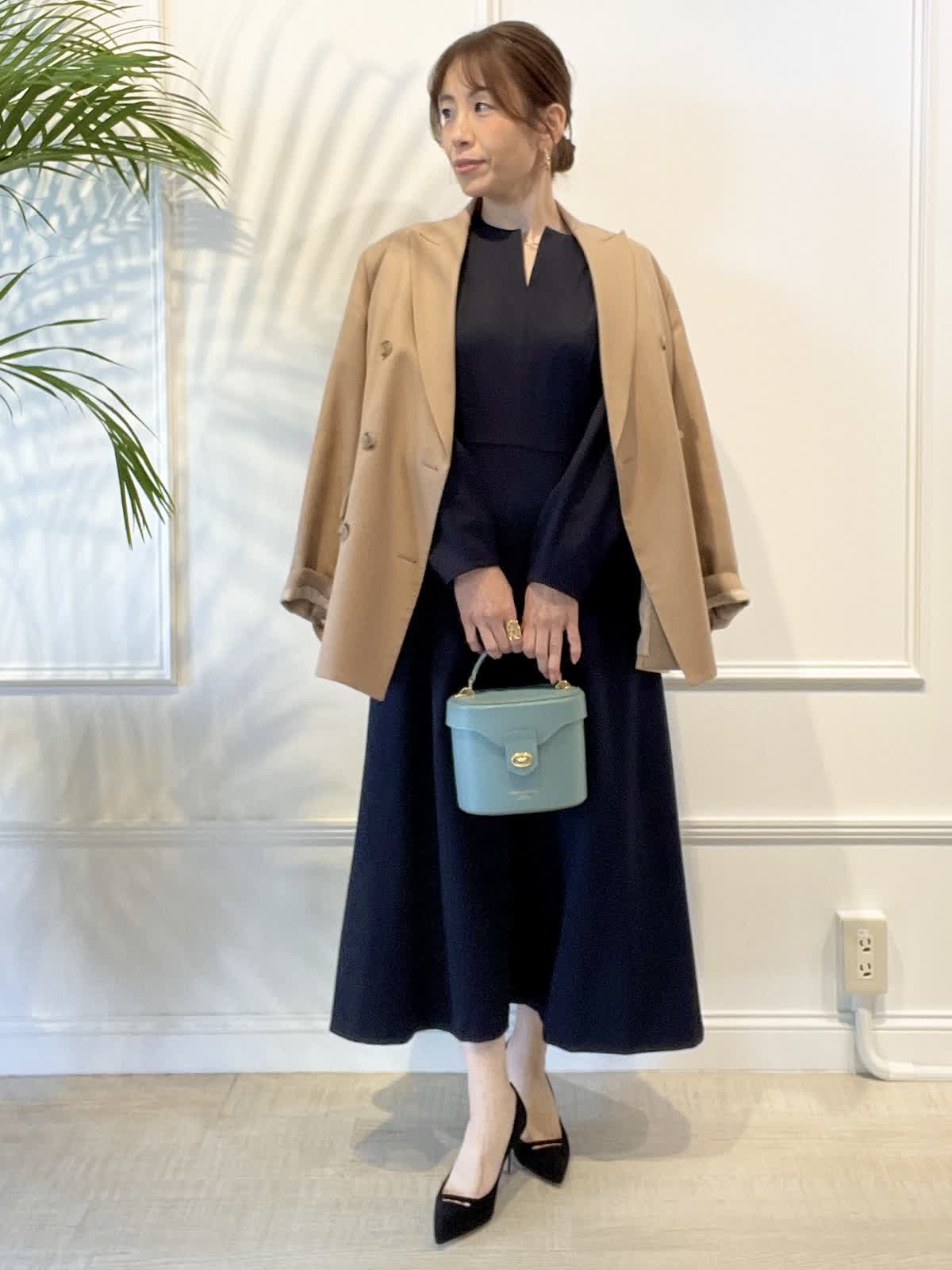 【着用アイテム:カラー/サイズ】 ジャケット:キャメル/9号 ワンピース:ネイビー/9号 バッグ:パールグリーン お仕事から食事会、セレモニーなど、幅広くご利用頂ける上品な袖付きワンピース。キーネックで襟元も開きすぎず、顔まわりもすっきり。ウエスト切替高めでスタイルアップできます。オーバーサイズのジャケットで抜け感を出しました。