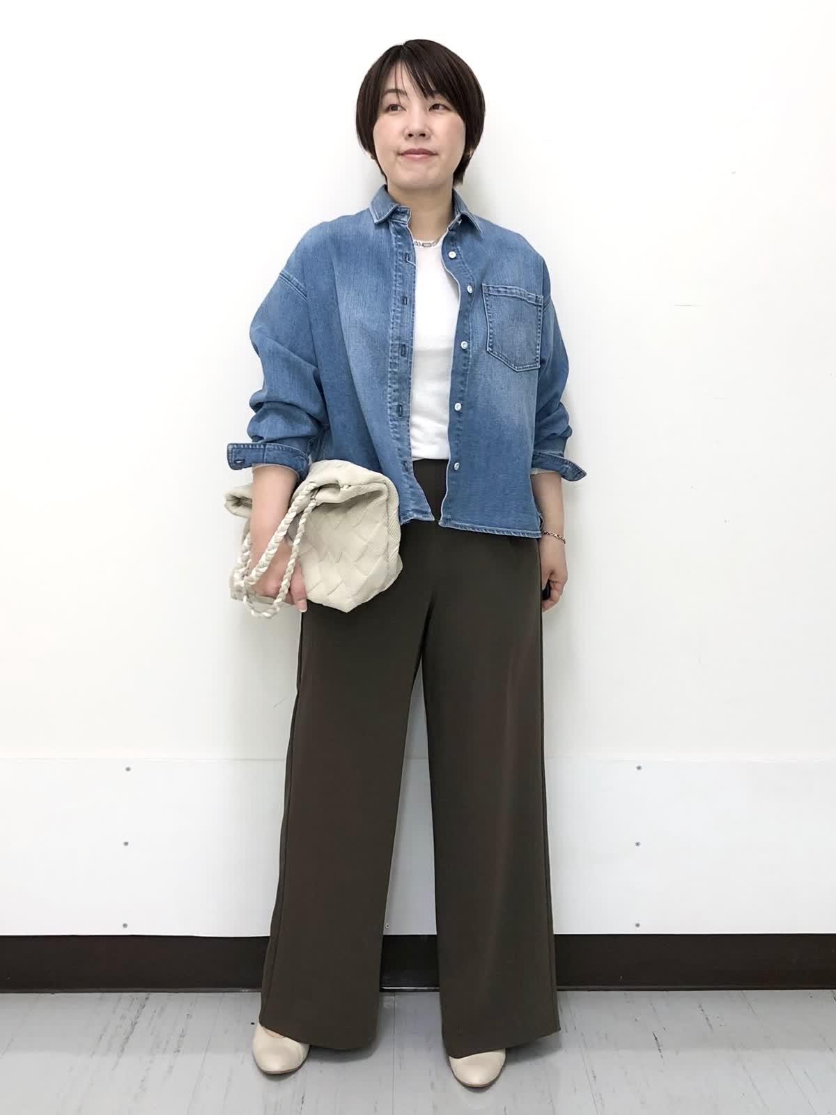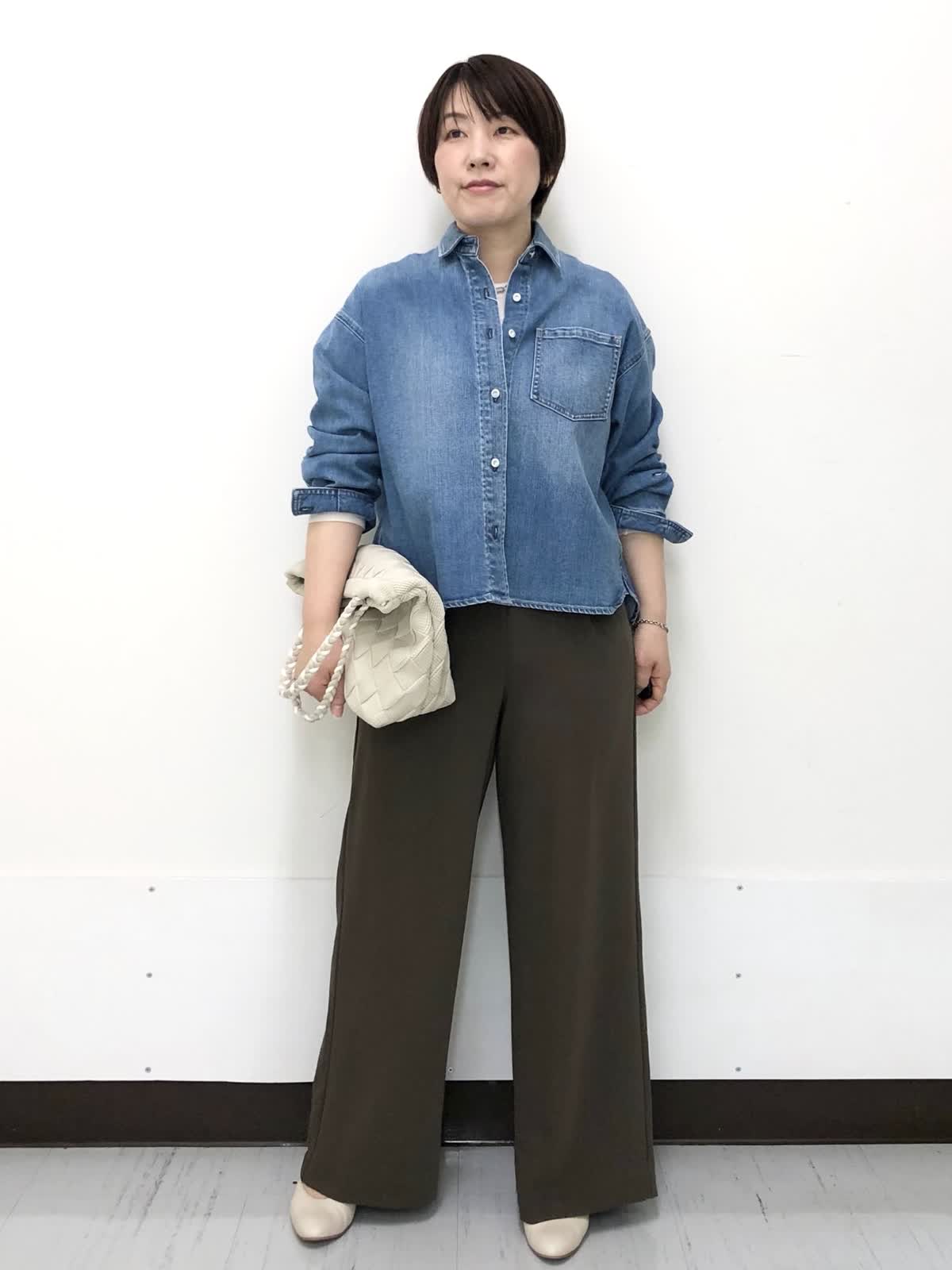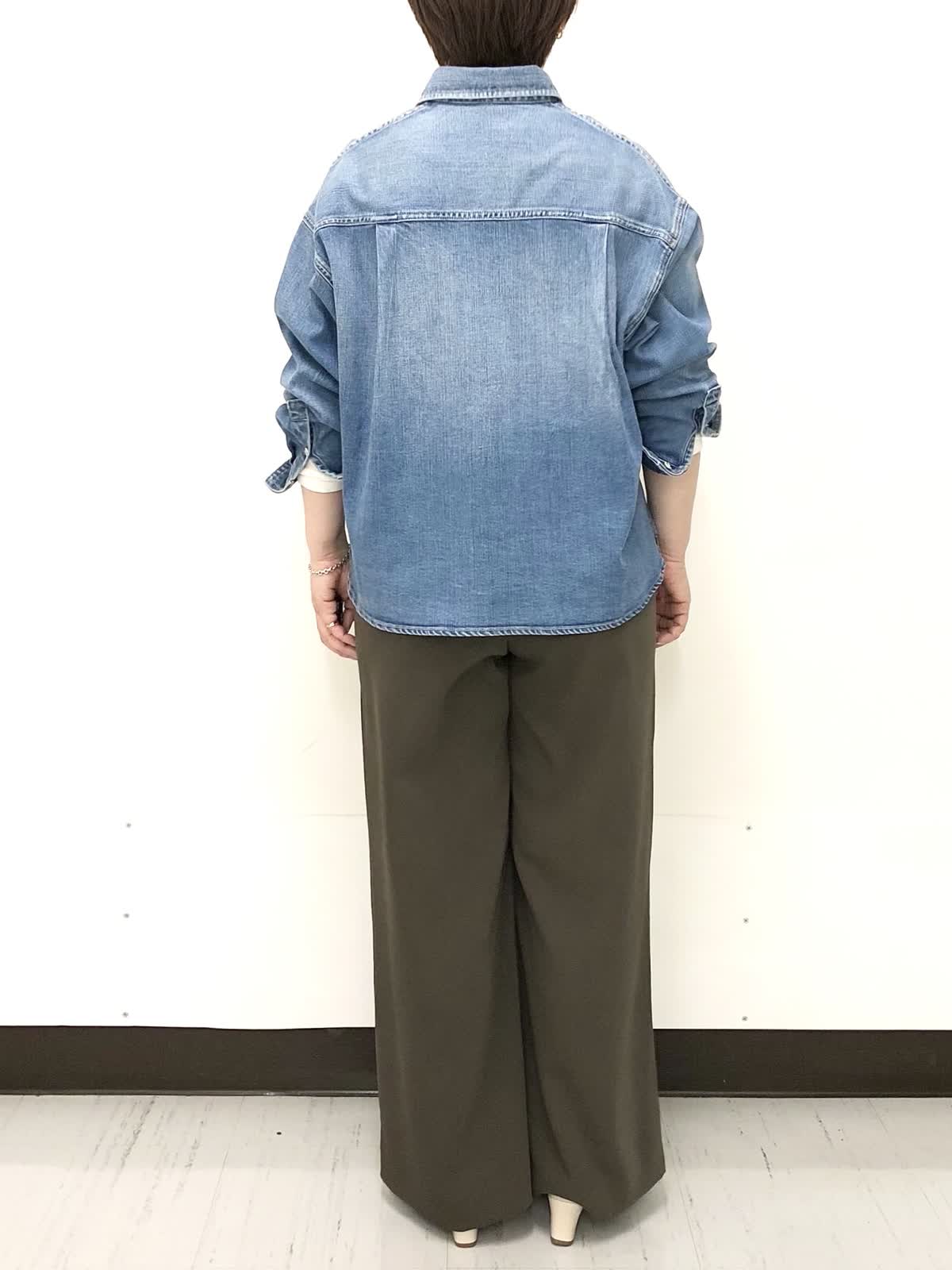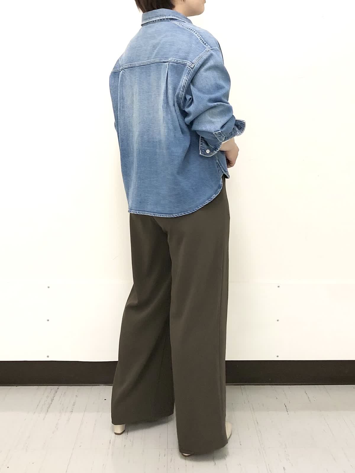 【着用サイズ】全て9号【着用カラー】シャツ: インディゴ カットソー: オフホワイト パンツ:カーキ 今すぐ着たいデニムコーデ。着丈は短く、ホームベース型にした胸ポケットはフラップをなくして1つに変更したINED別注の特別な1着に仕上げたデニムシャツ。ベーシックなボトムから柄アイテムまでいろいろなアイテムと合わせて着たい旬なおすすめアイテムです。