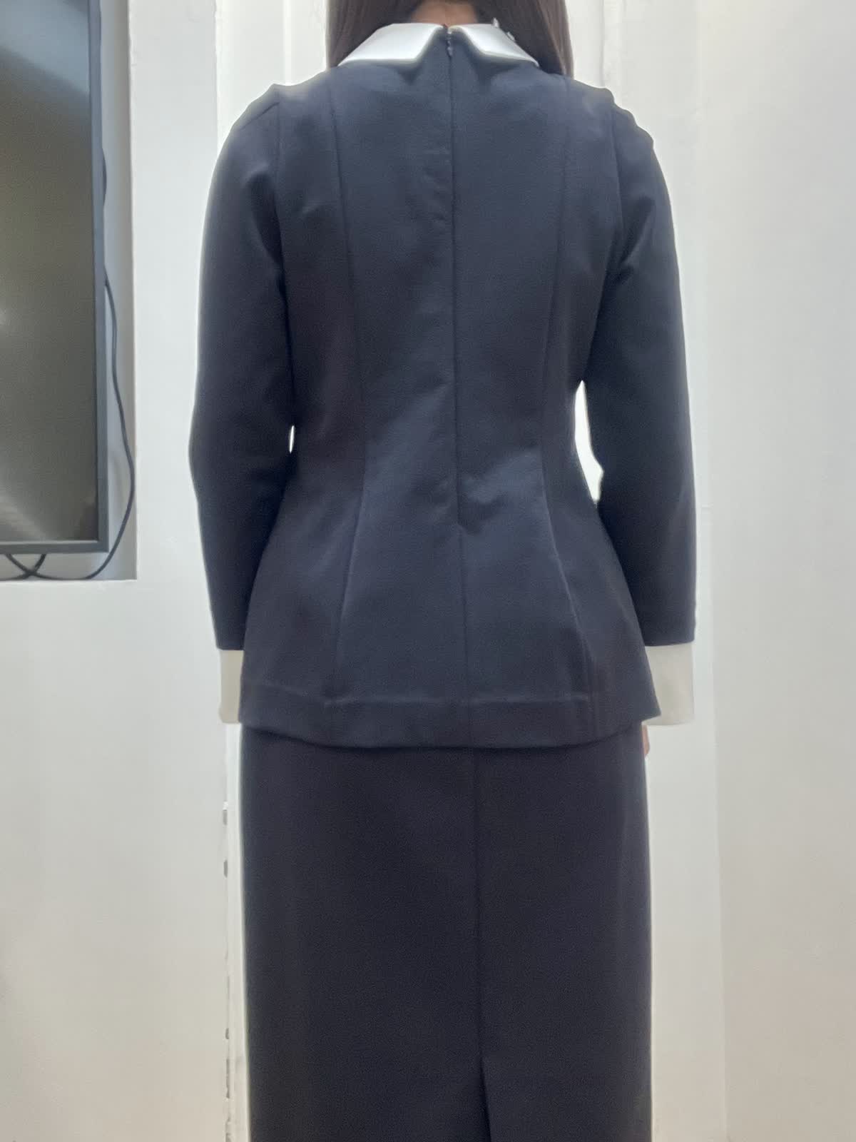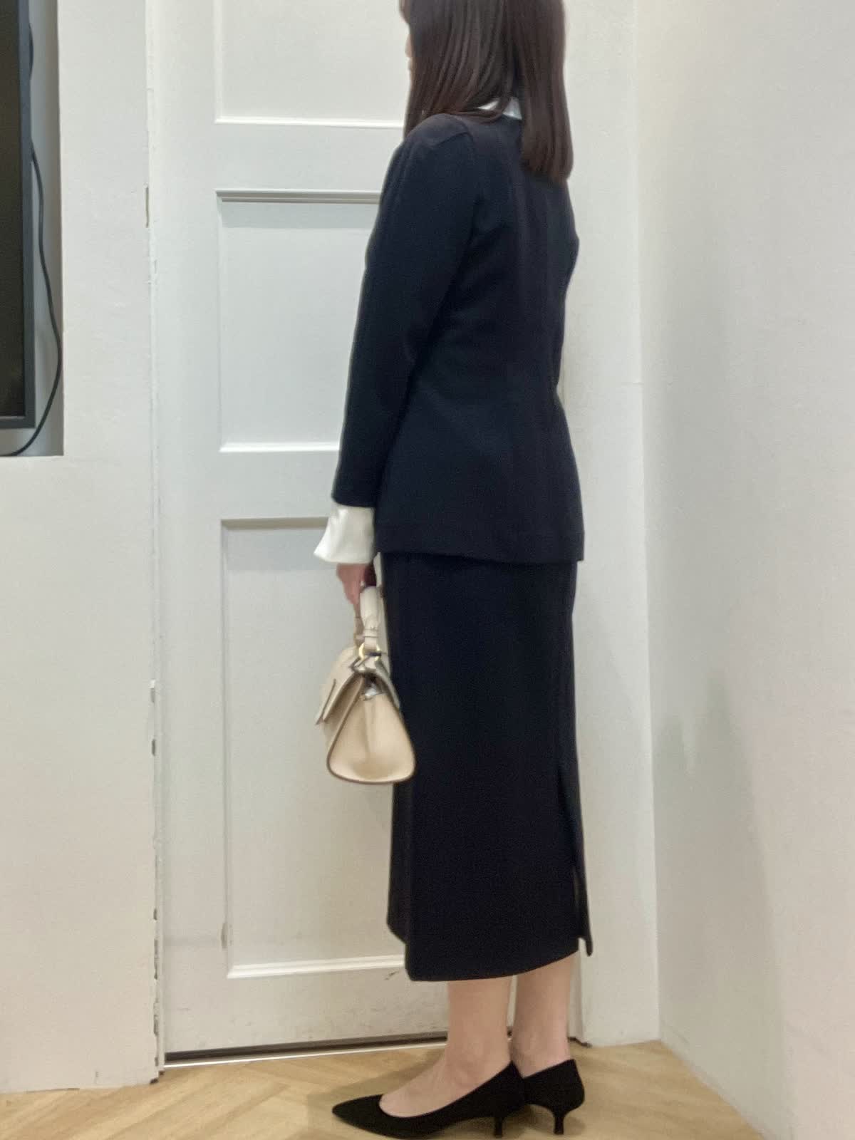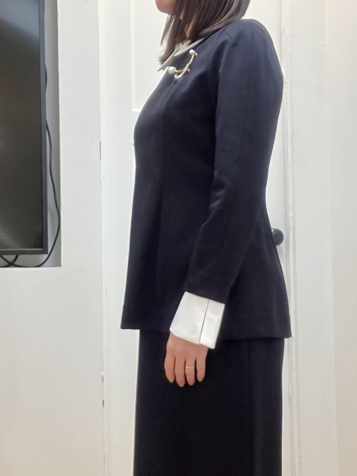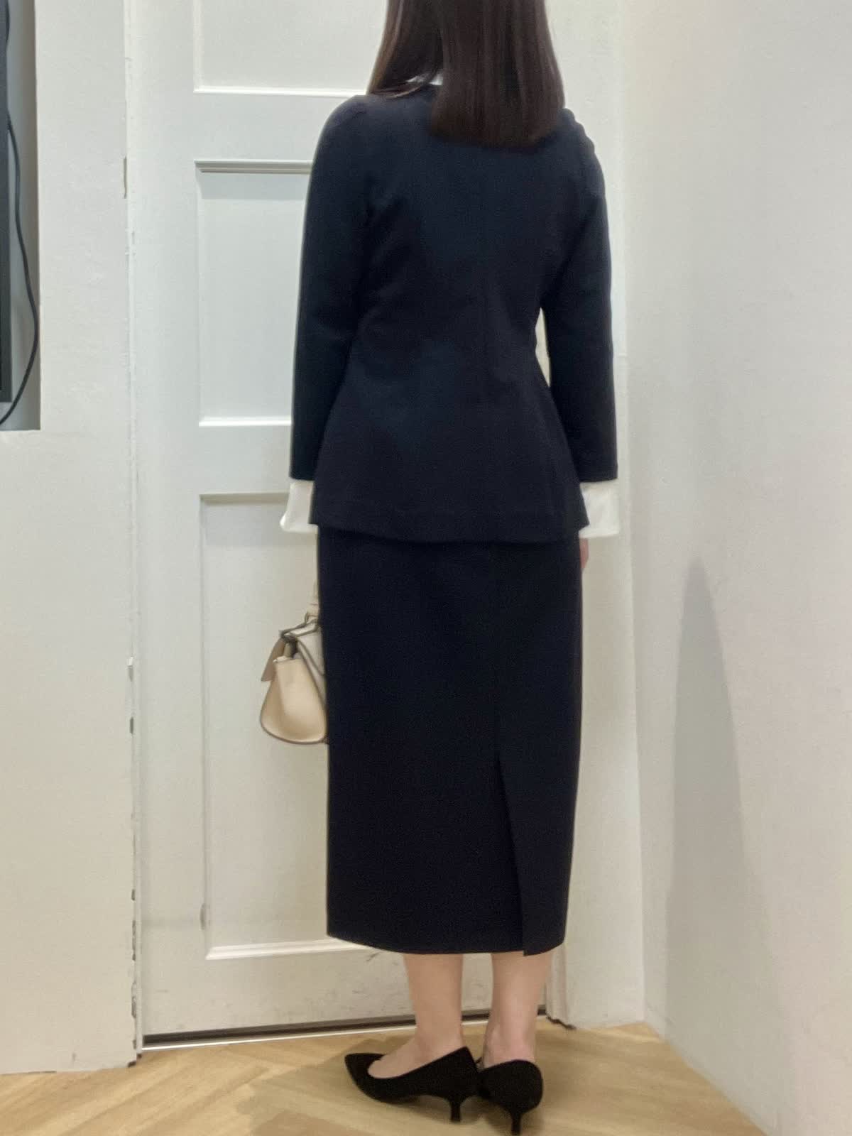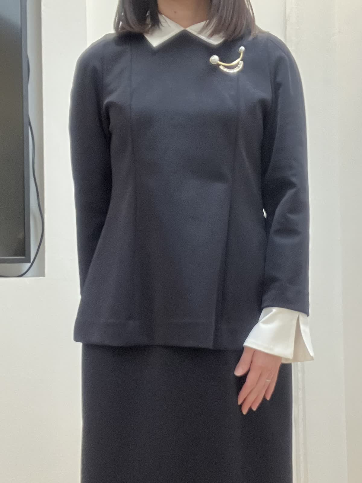 【着用サイズ】全て9号 【着用カラー】ブラウス/スカート:ネイビー セレモニースタイル 立体的なシルエットが女性らしく、白い襟とカフスが華やかさをプラス。ハリのある伸縮性のある素材で着心地も◎ ブローチを2つ重ねてセレモニー感UP。洗えるのも嬉しいポイント。 白い襟とカフスは取り外し可能で、カジュアルに単品でも着回せる優秀セットアップです。