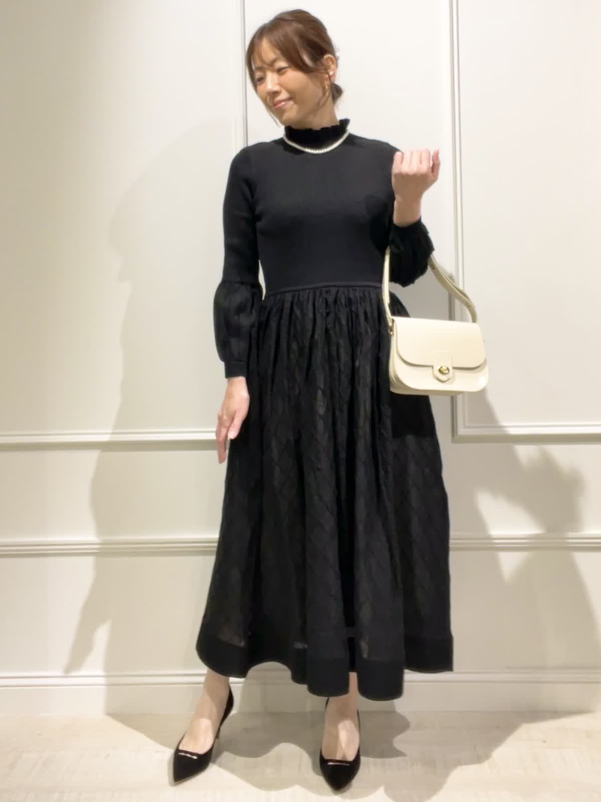 【着用アイテム:カラー/サイズ】 ニットワンピース:ブラック/9号 ジャケット:グレーベージュ/9号 バッグ:オフホワイト デイリーに着て頂ける袖ふわニットワンピース。フィットアンドフレアのラインが体型カバーしてくれます。サラリとした素材で、シーズン問わず着て頂けます。 ジャケットを羽織れば、オフィスやセレモニーにもOK。