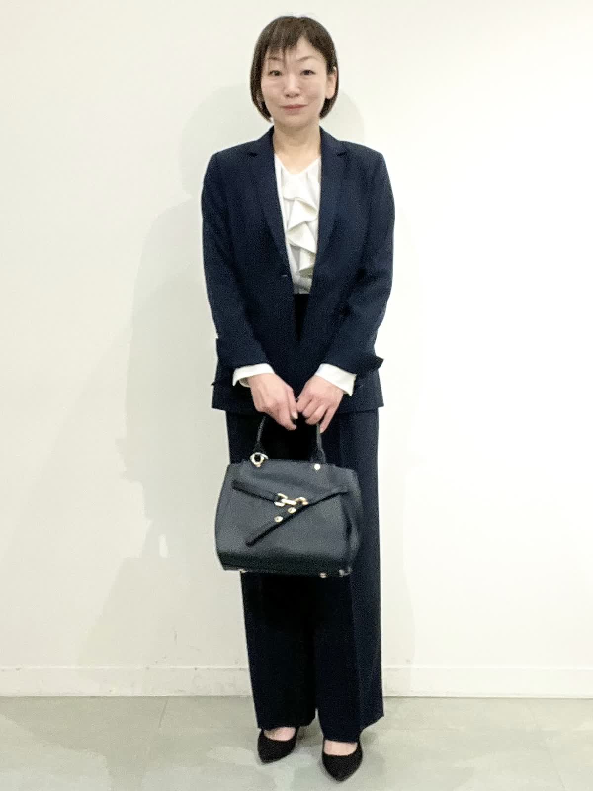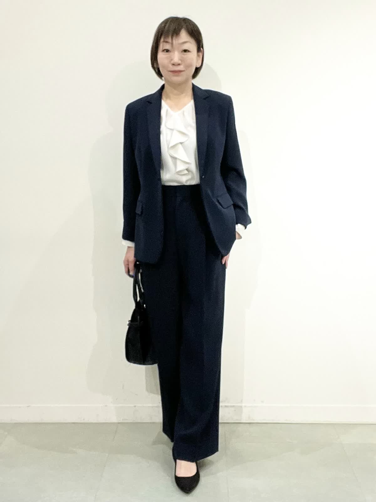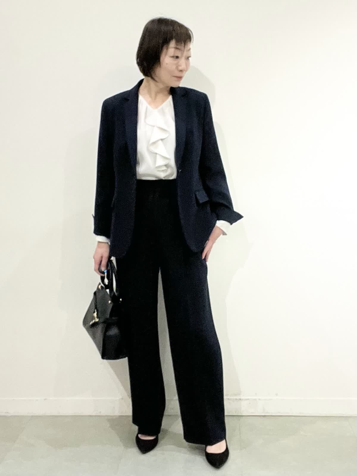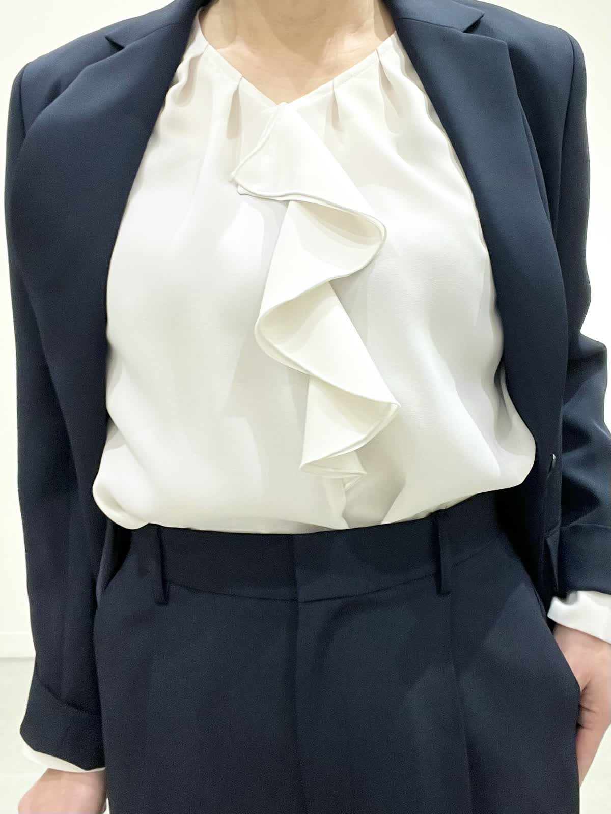 【着用サイズ】全て09 セレモニーやお仕事着でお使いいただけるセットアップ。とても軽いしなやか素材で、しわになりにくくご自宅でお洗濯ができます。ジャケットはえりは小さめ、すっきりとしたラインでヒップが隠れる着丈です。ワイドパンツは広がりすぎず、ストンとした美脚ラインです。 フリルブラウスはVネックで甘すぎず、しわを気にせずお使いいただけます。 全てシーズンレスで年中着ていただける万能アイテムです。