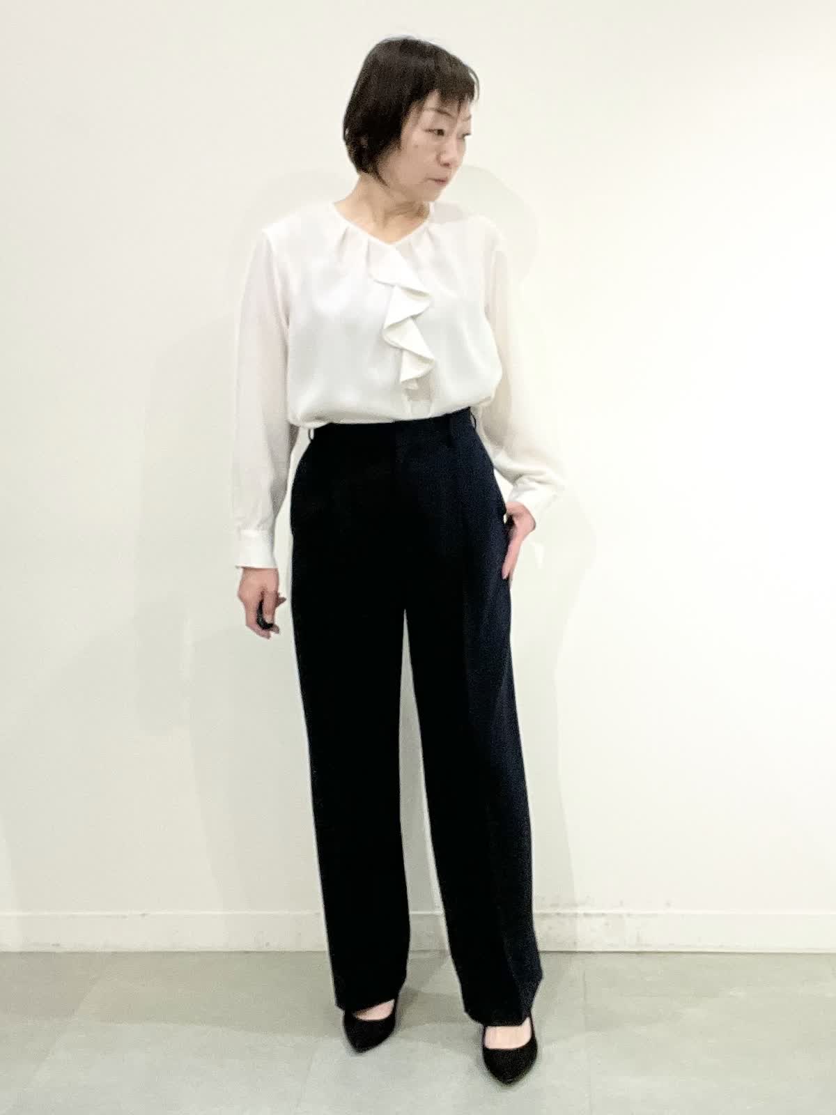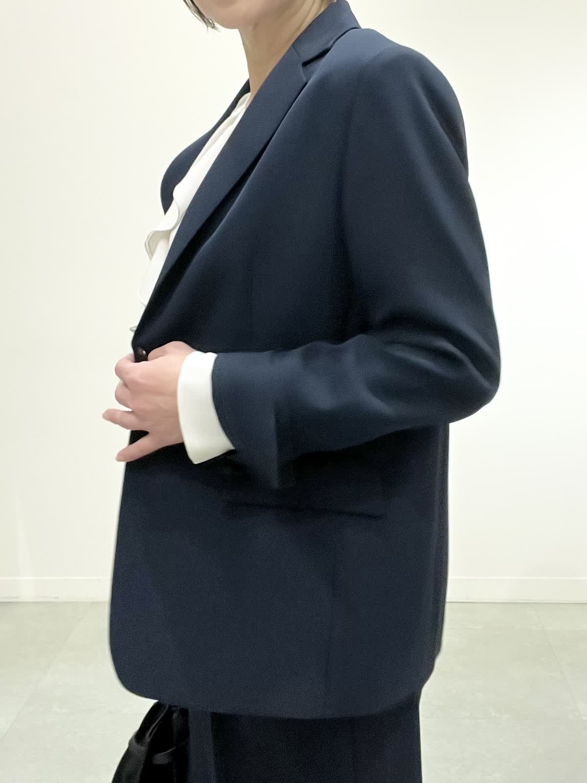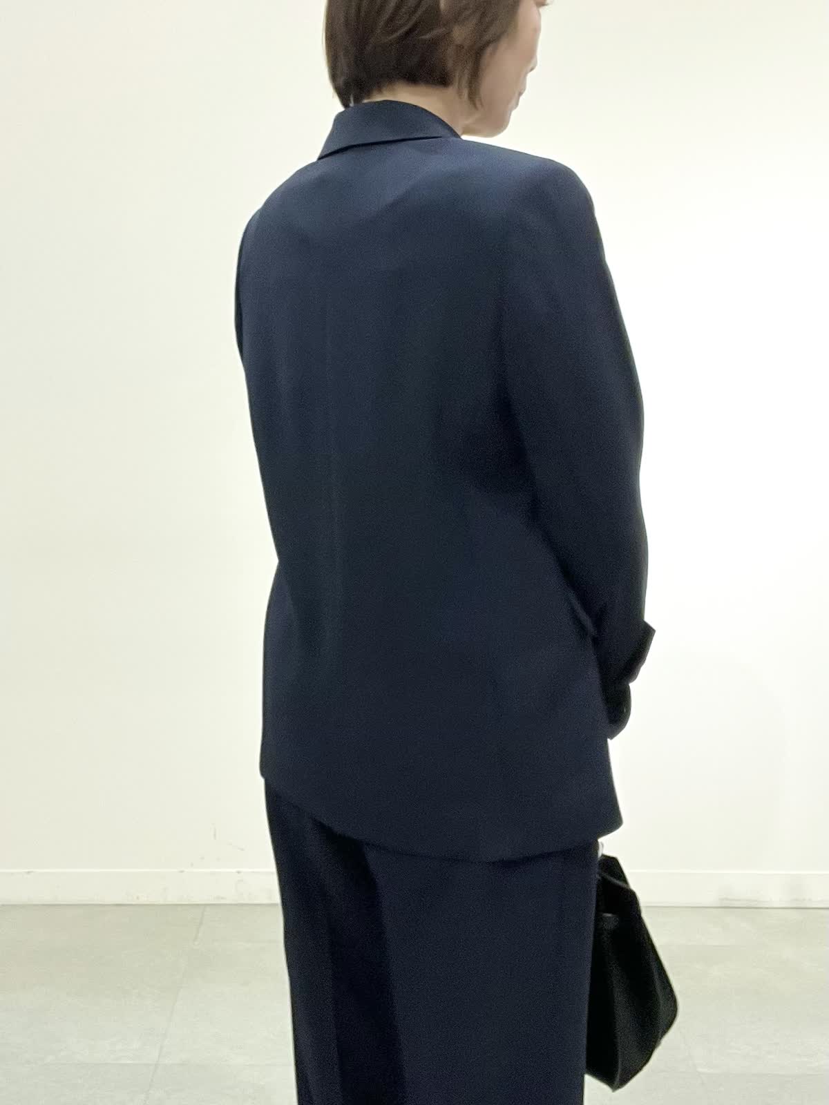 【着用サイズ】全て09 セレモニーやお仕事着でお使いいただけるセットアップ。とても軽いしなやか素材で、しわになりにくくご自宅でお洗濯ができます。ジャケットはえりは小さめ、すっきりとしたラインでヒップが隠れる着丈です。ワイドパンツは広がりすぎず、ストンとした美脚ラインです。 フリルブラウスはVネックで甘すぎず、しわを気にせずお使いいただけます。 全てシーズンレスで年中着ていただける万能アイテムです。
