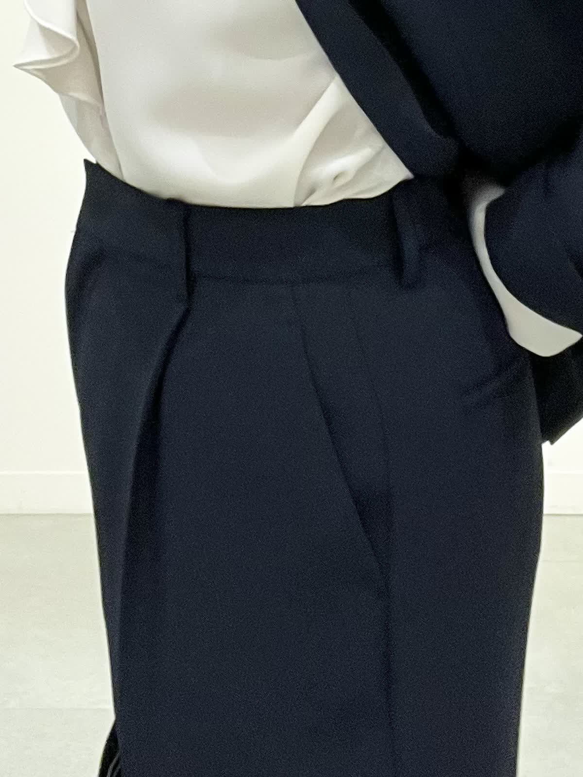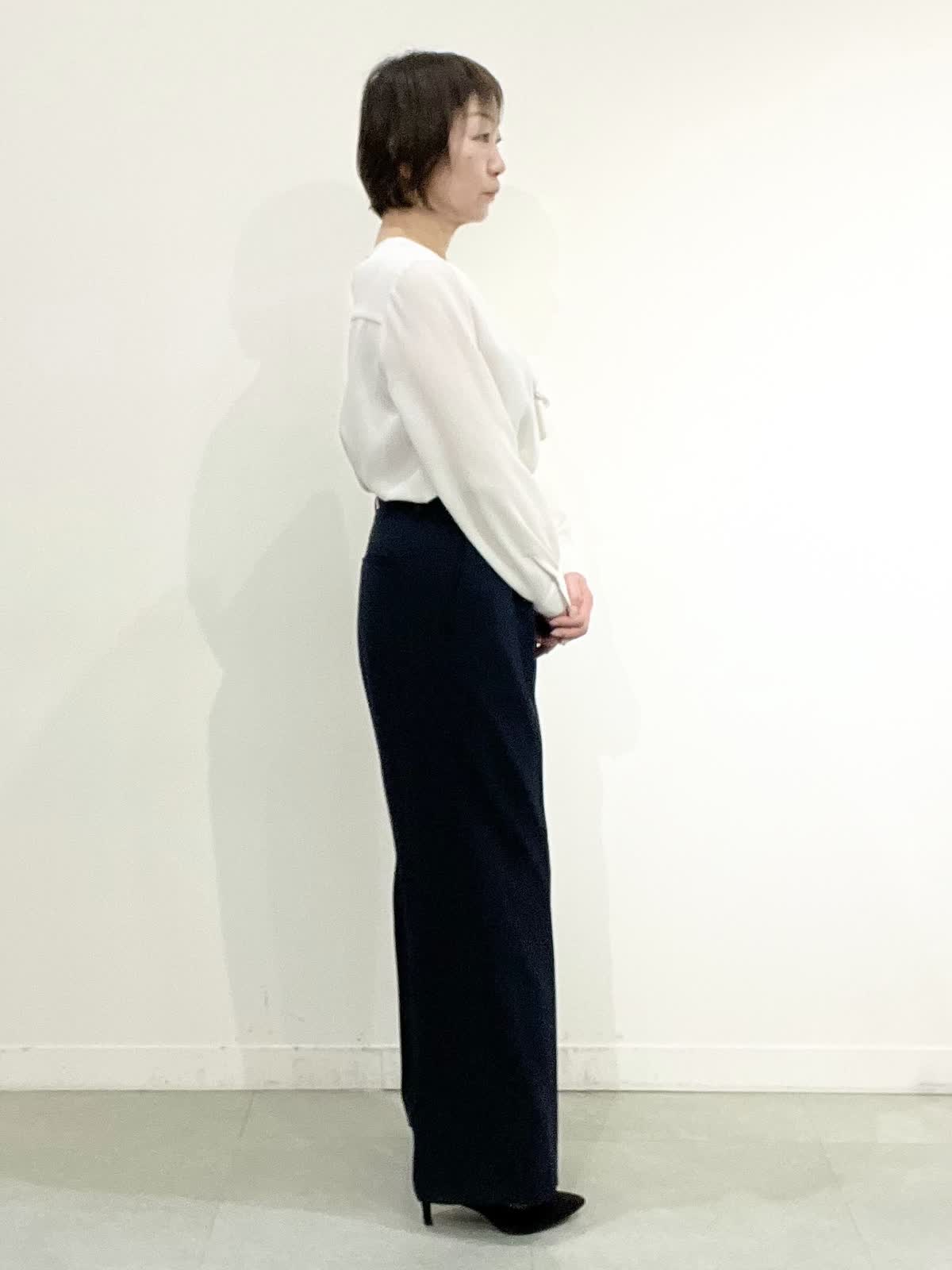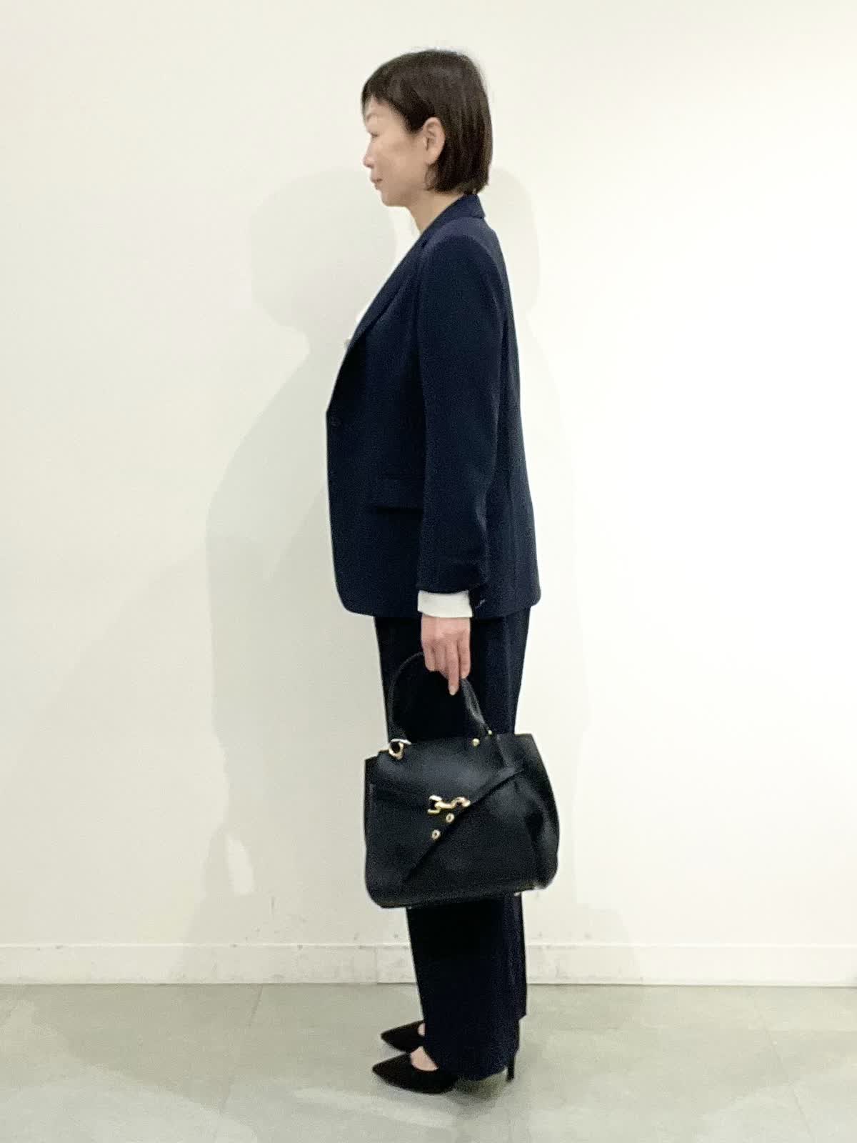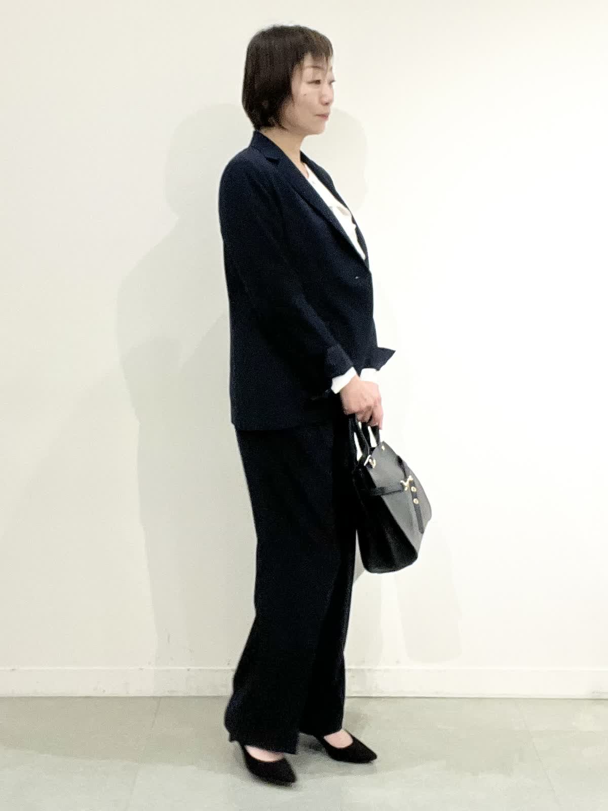 【着用サイズ】全て09 セレモニーやお仕事着でお使いいただけるセットアップ。とても軽いしなやか素材で、しわになりにくくご自宅でお洗濯ができます。ジャケットはえりは小さめ、すっきりとしたラインでヒップが隠れる着丈です。ワイドパンツは広がりすぎず、ストンとした美脚ラインです。 フリルブラウスはVネックで甘すぎず、しわを気にせずお使いいただけます。 全てシーズンレスで年中着ていただける万能アイテムです。