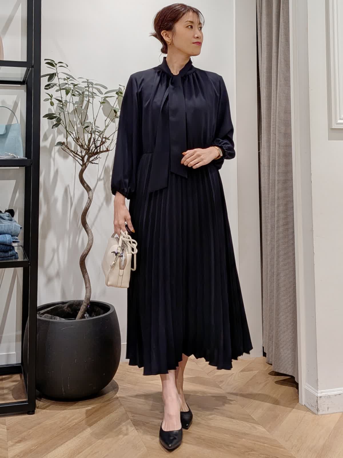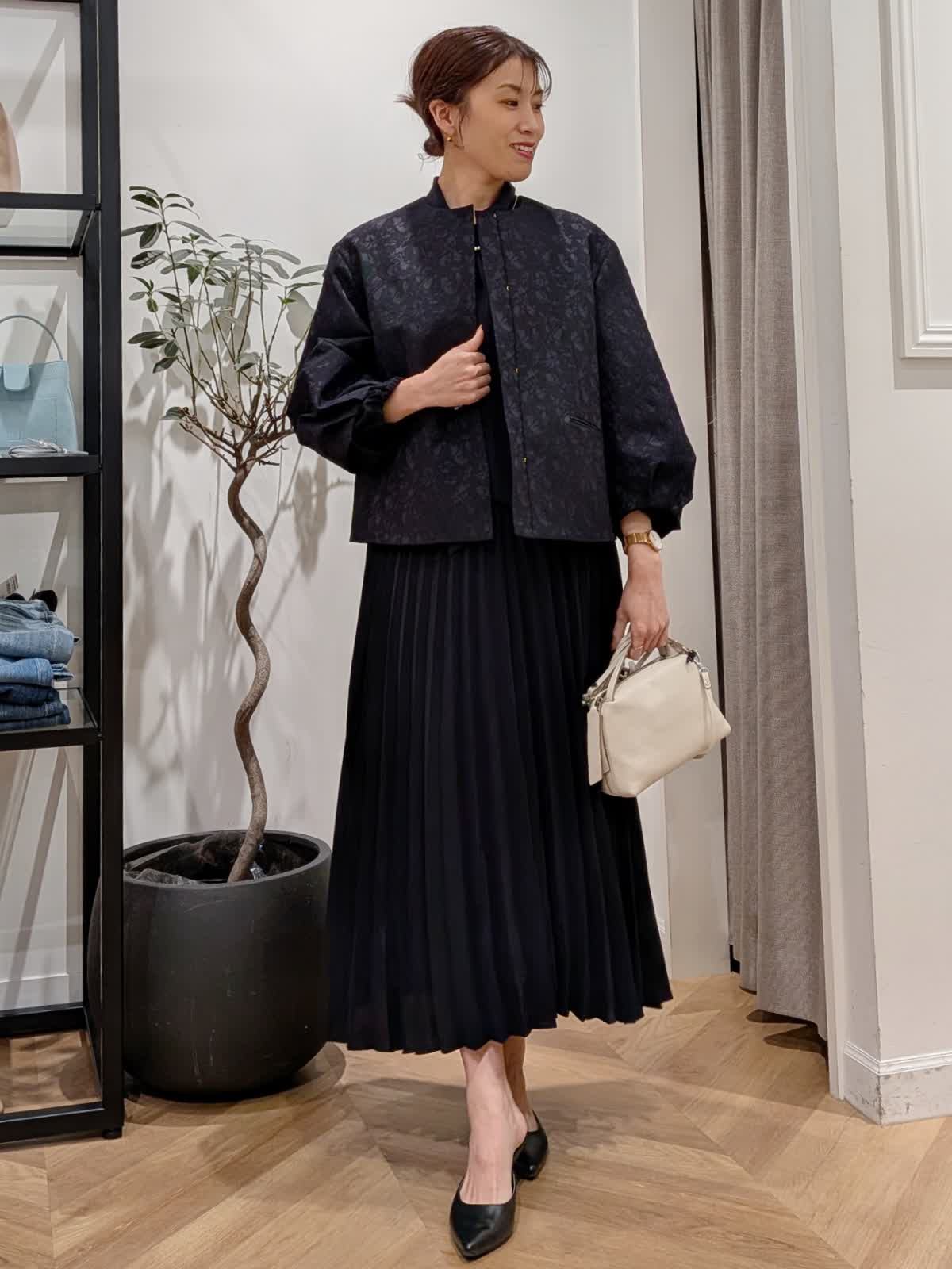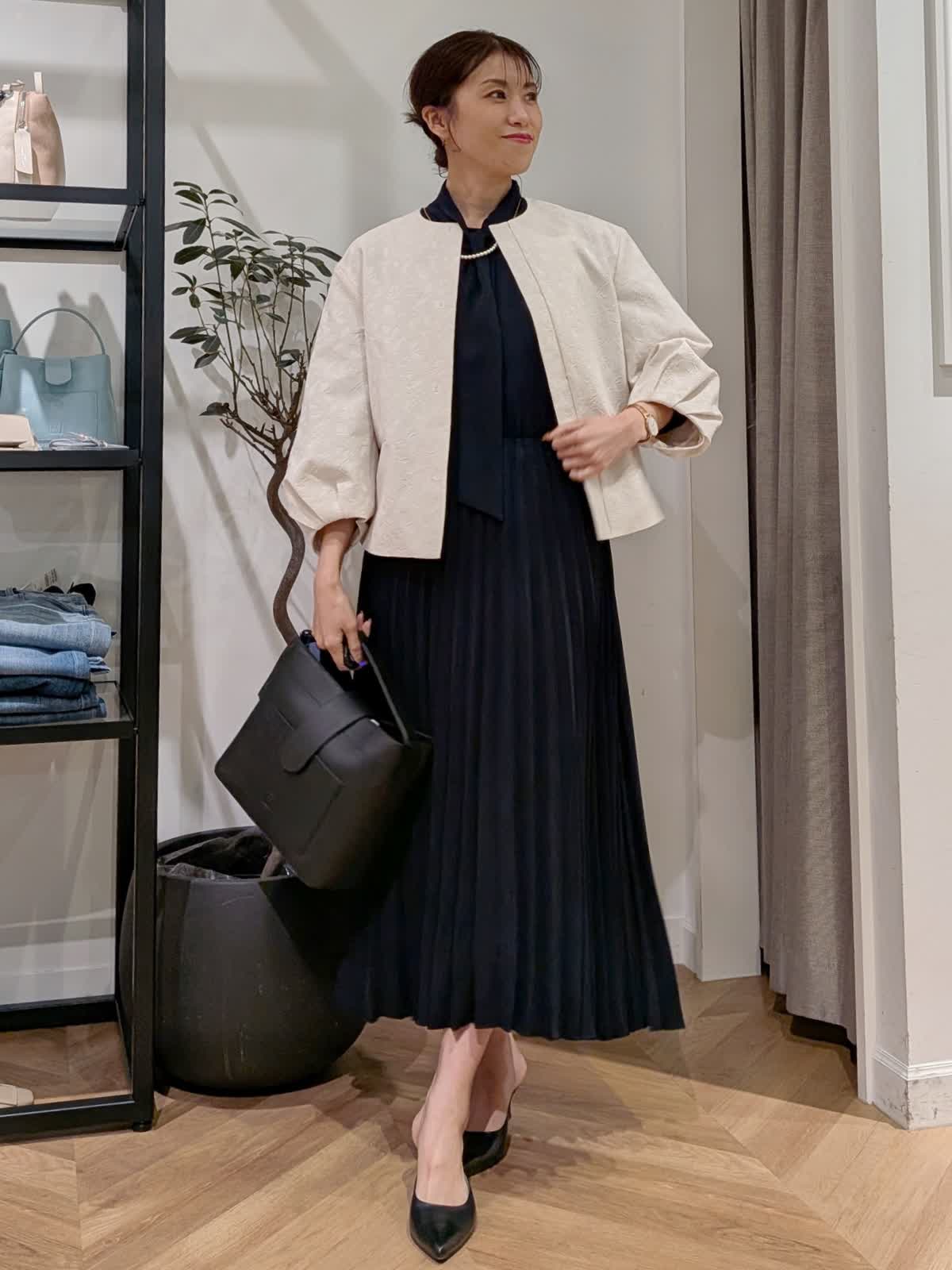 【着用サイズ】ジャケット?ネイビー?9号 ワンピース?ネイビー?9号 ワンピースは胸元がボタンになっているので脱着も簡単。1枚で決まります。袖口はゴム仕様。セレモニーやパーティー同窓会など幅広くお使いいただけます。ボウタイデザインで甘すぎない印象に。凹凸で表現された柄が美しいコンパクト丈ジャケット。お袖デザインも可愛くフォーマルシーンにも最適。