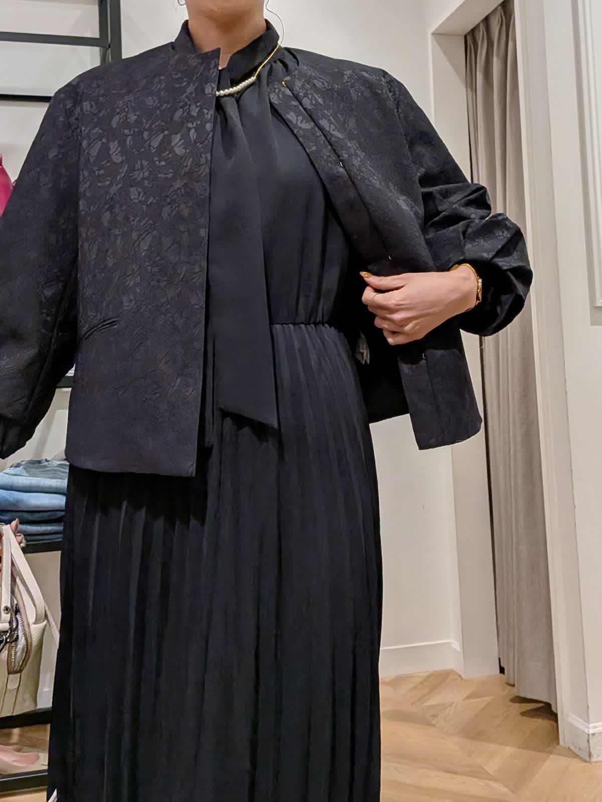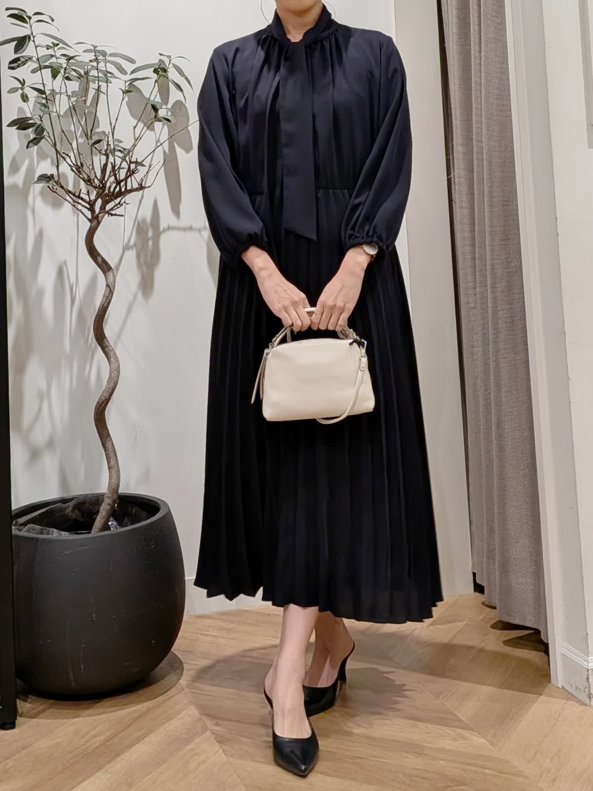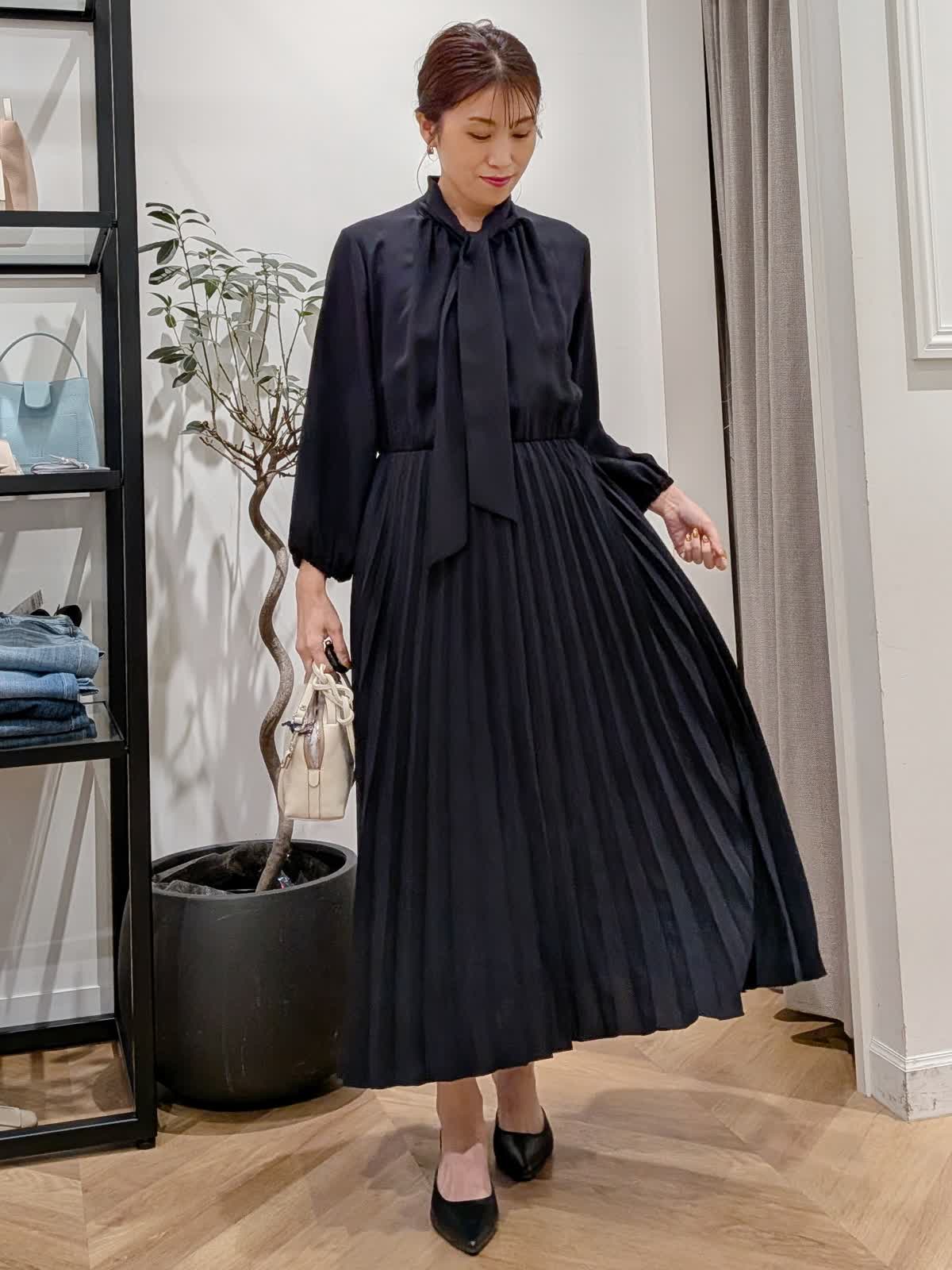 【着用サイズ】ジャケット?ネイビー?9号 ワンピース?ネイビー?9号 ワンピースは胸元がボタンになっているので脱着も簡単。1枚で決まります。袖口はゴム仕様。セレモニーやパーティー同窓会など幅広くお使いいただけます。ボウタイデザインで甘すぎない印象に。凹凸で表現された柄が美しいコンパクト丈ジャケット。お袖デザインも可愛くフォーマルシーンにも最適。