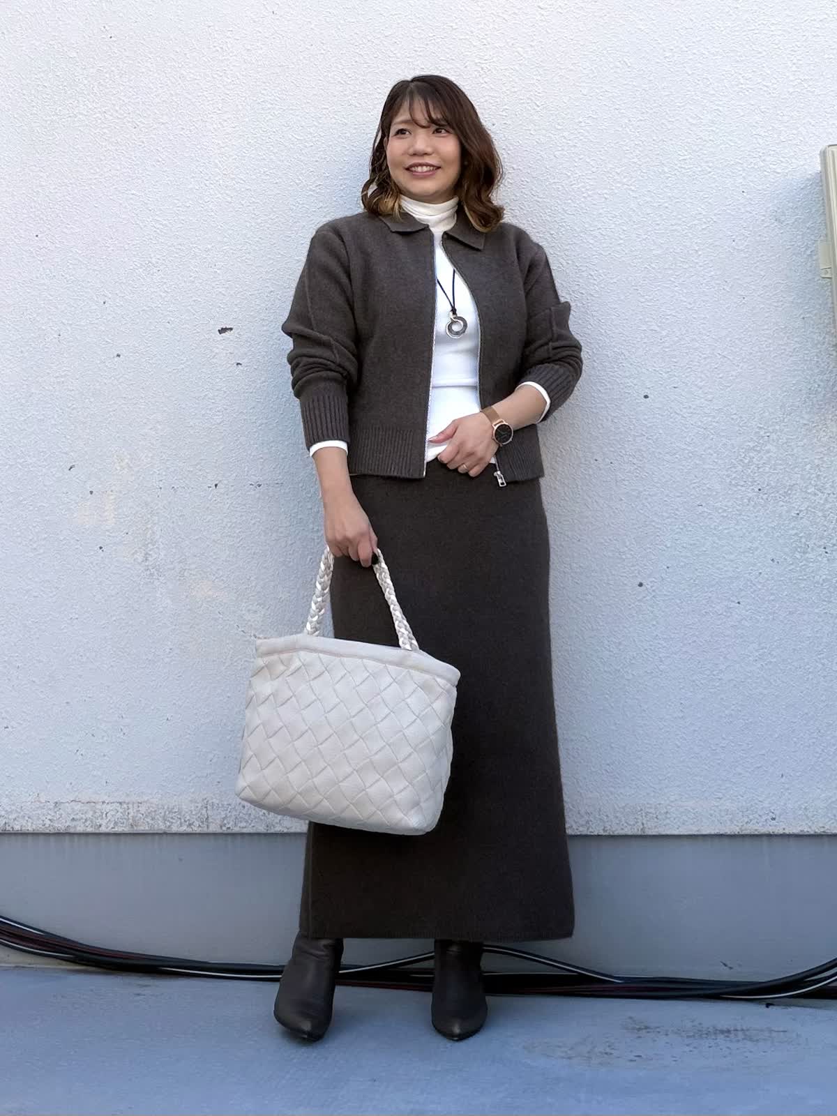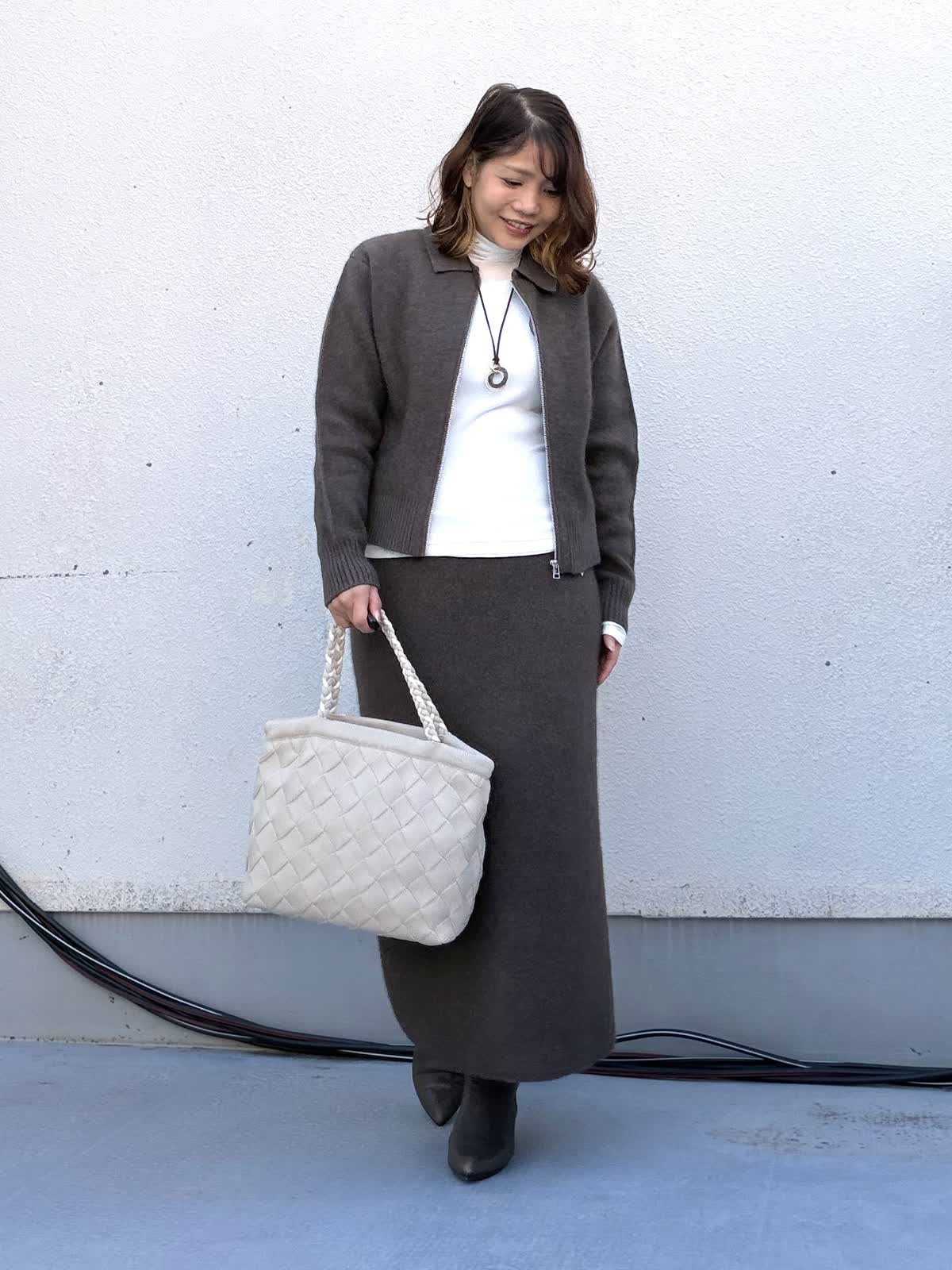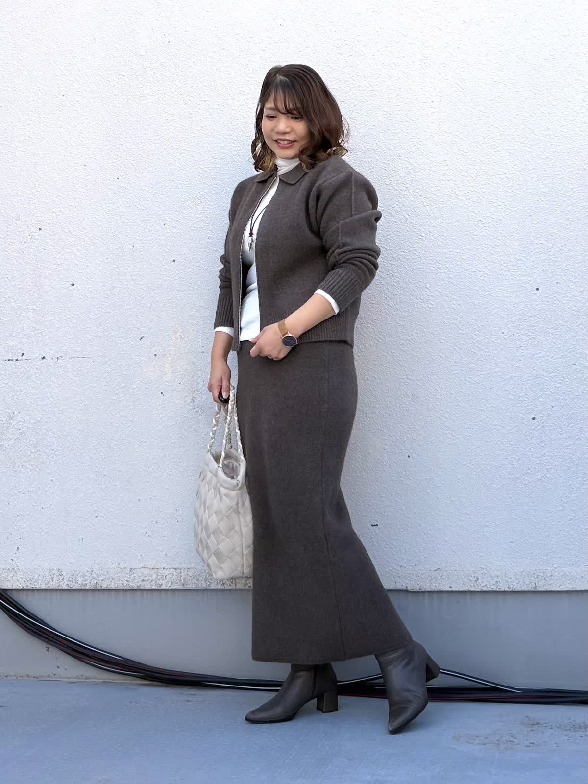【着用アイテム:カラー/サイズ】 カーディガン:ブラウン/9号 スカート:ブラウン/9号 カットソー:オフホワイト/9号 程よいきちんと感とリラックス感を兼ね備えたニットセットアップスタイル。 コンパクトなニットブルゾンは、ジップ仕様で羽織りとしてもトップス風にも着回せる万能デザイン。リブの効いた袖口と裾が全体をすっきりと見せてくれます。 スカートはストンと落ちるIライン。体のラインを拾いすぎず、縦のラインを強調してくれるのでスタイルアップ効果も◎ ウエスト周りもラクな着心地で、デイリーからお仕事シーンまで幅広く活躍します。 インナーに白を差し込むことで顔まわりが明るくなり、ダークトーンでも重く見えないバランスを心がけました。