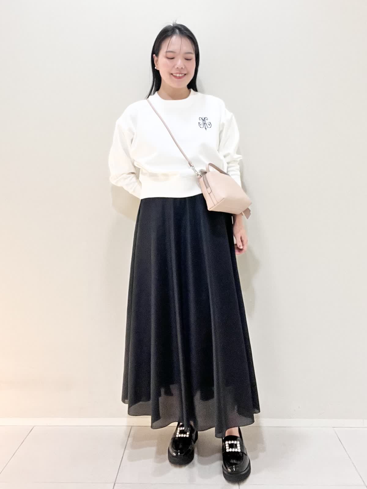 【着用サイズ/カラー】トップス:9号 オフホワイト スカート:7号 ブラック ローファー:23(23.5)ブラック バッグ:ベージュ 春の綺麗めカジュアルコーデ。軽くて着やすいスウェット。丈が短めで、ロングスカートとの相性バッチリです。