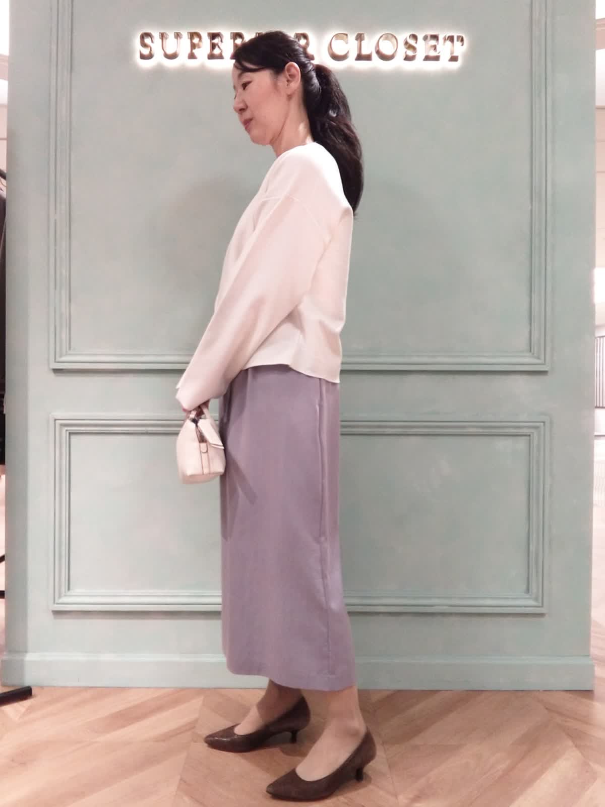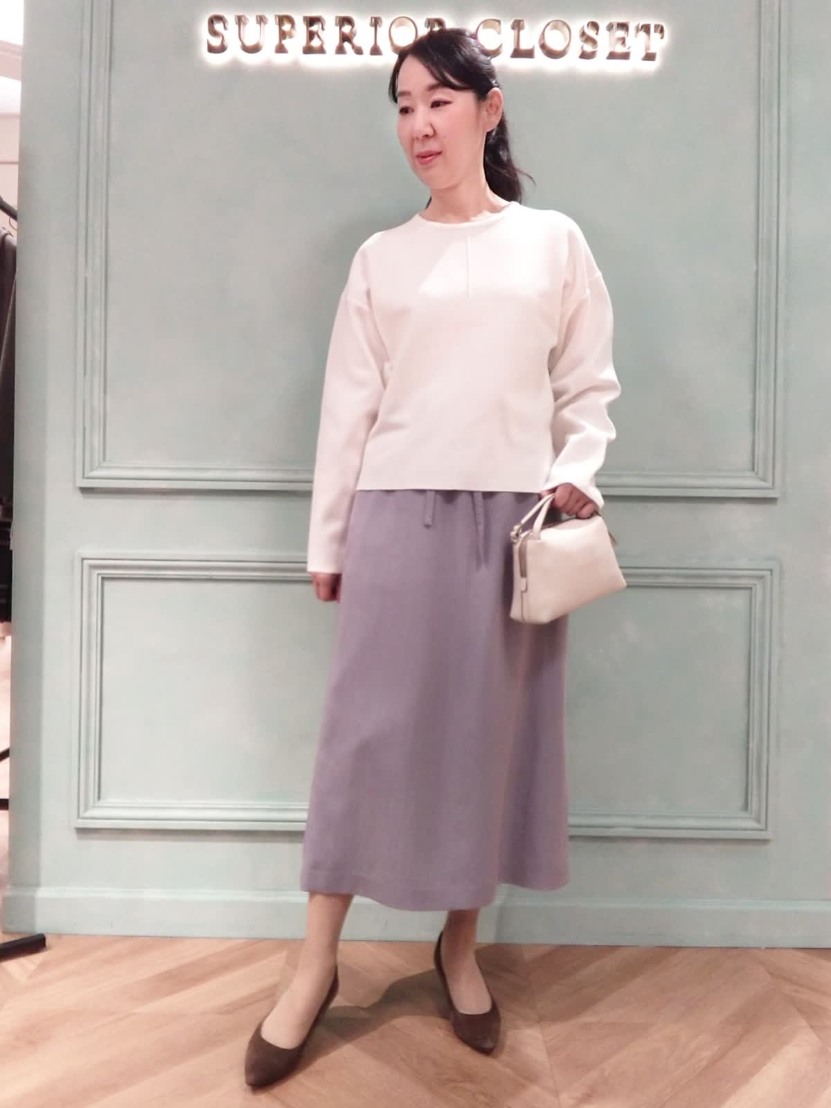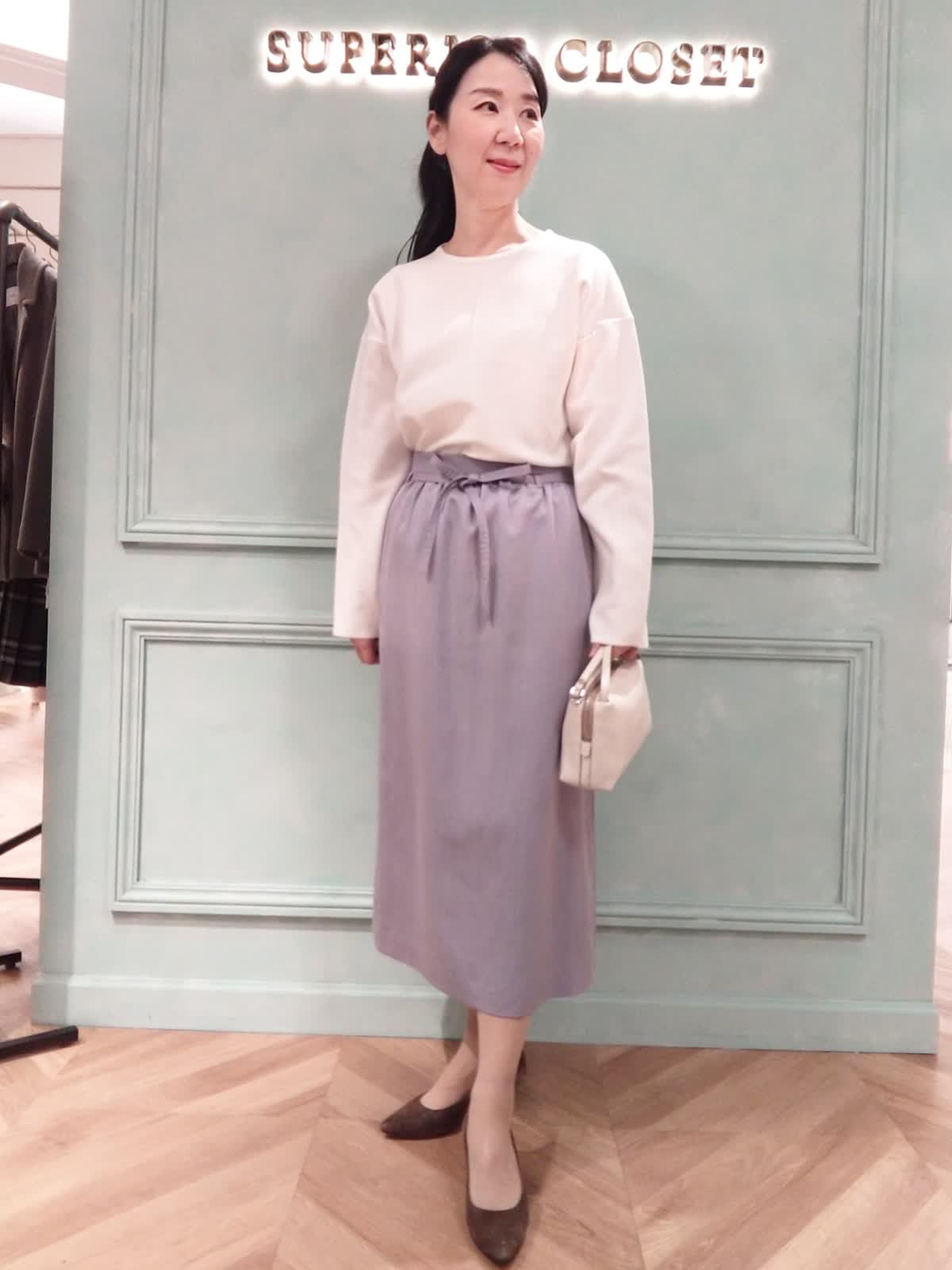 【着用サイズ】ニット:フリー、スカート9号 【着用カラー】ニット:オフホワイト、スカート:パープル おでかけスタイル。春まで着られる白のニットとスカートは普段のおでかけやランチにぴったり。ニットはハリ感があり体に貼り付かず、中心部の縦のラインがスッキリ見える効果があります。スカートはウエストリボン付き、トップスインでスッキリ、アウトスタイルでリラックス感のある着こなしになります。