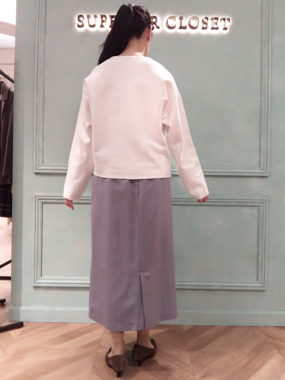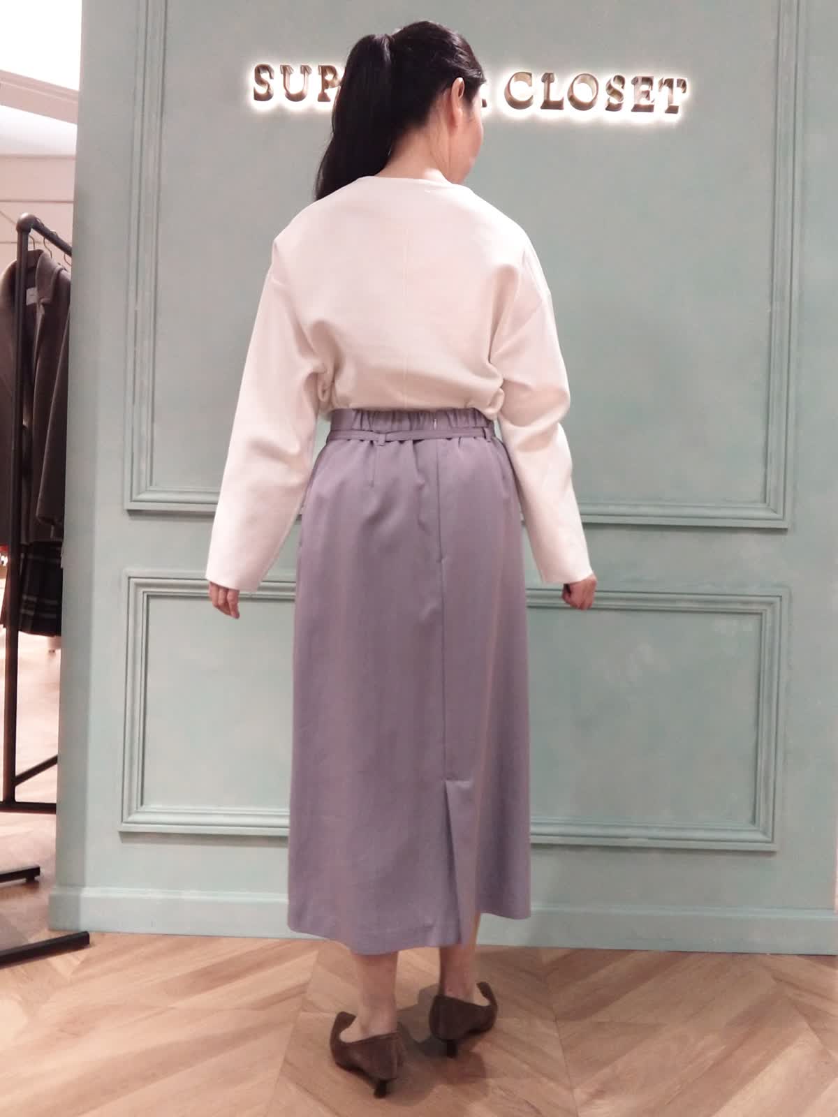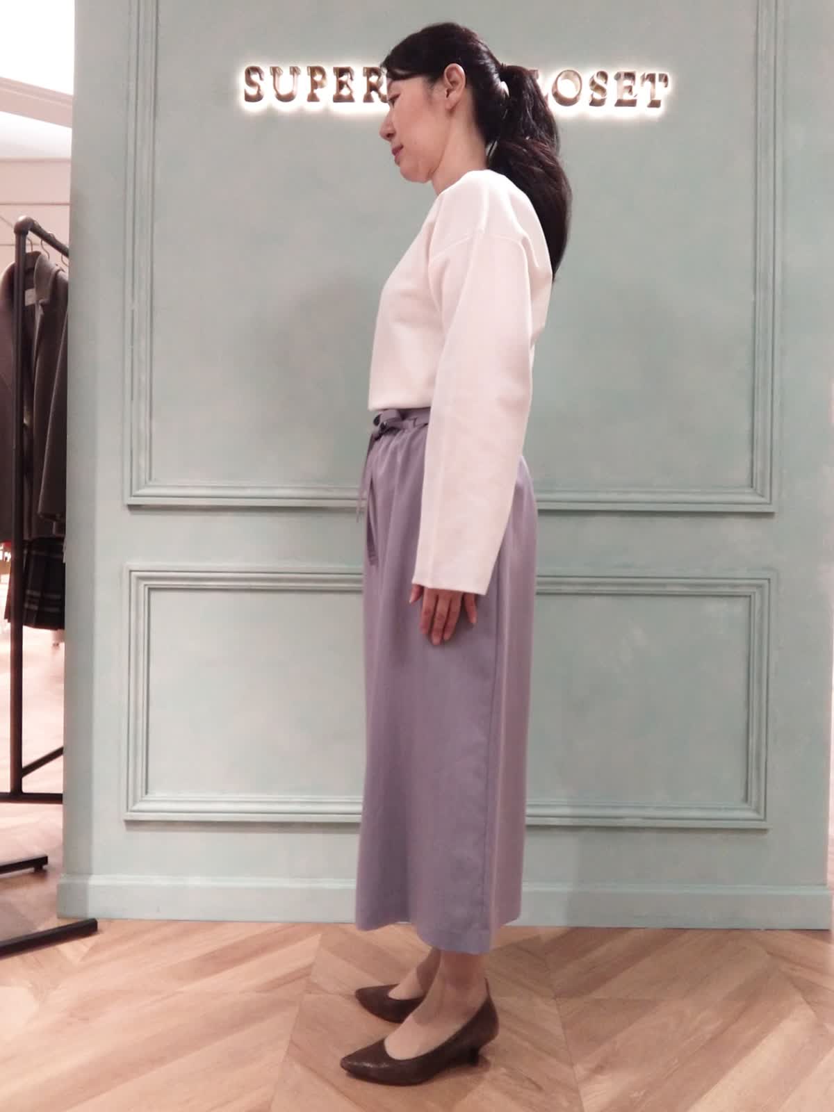 【着用サイズ】ニット:フリー、スカート9号 【着用カラー】ニット:オフホワイト、スカート:パープル おでかけスタイル。春まで着られる白のニットとスカートは普段のおでかけやランチにぴったり。ニットはハリ感があり体に貼り付かず、中心部の縦のラインがスッキリ見える効果があります。スカートはウエストリボン付き、トップスインでスッキリ、アウトスタイルでリラックス感のある着こなしになります。