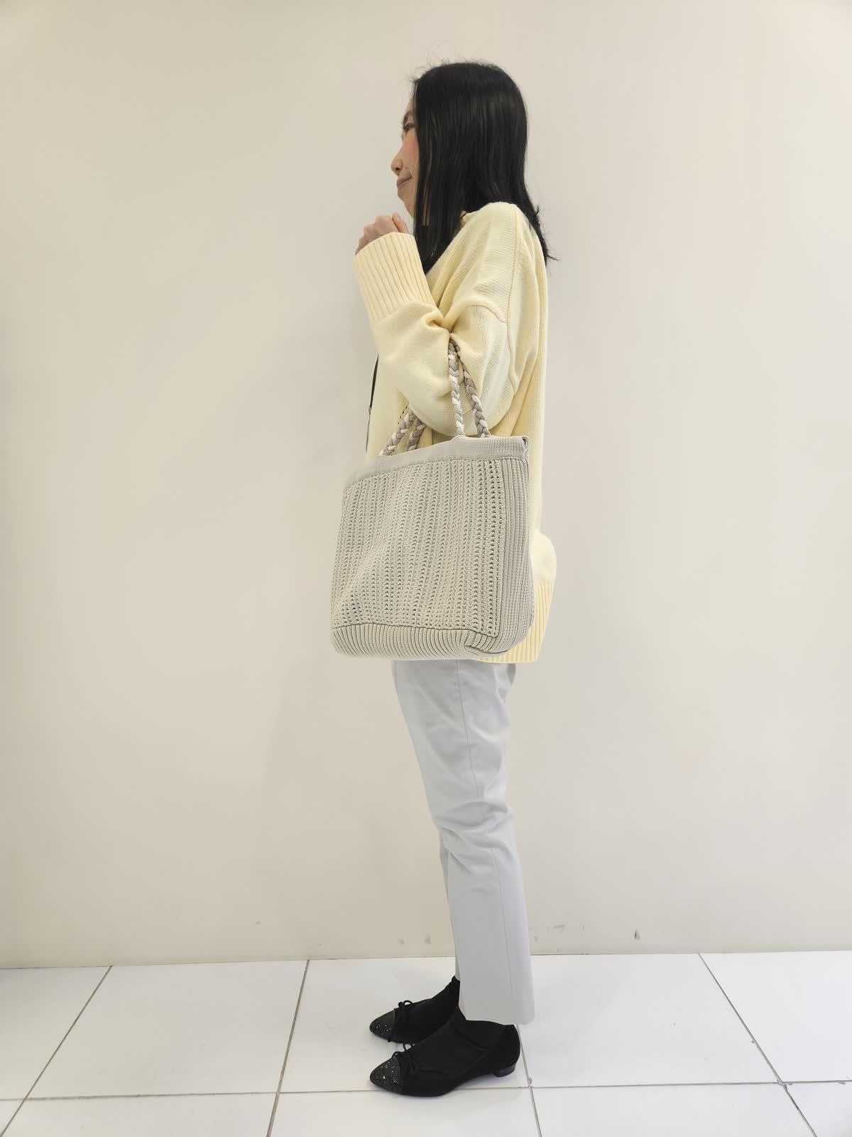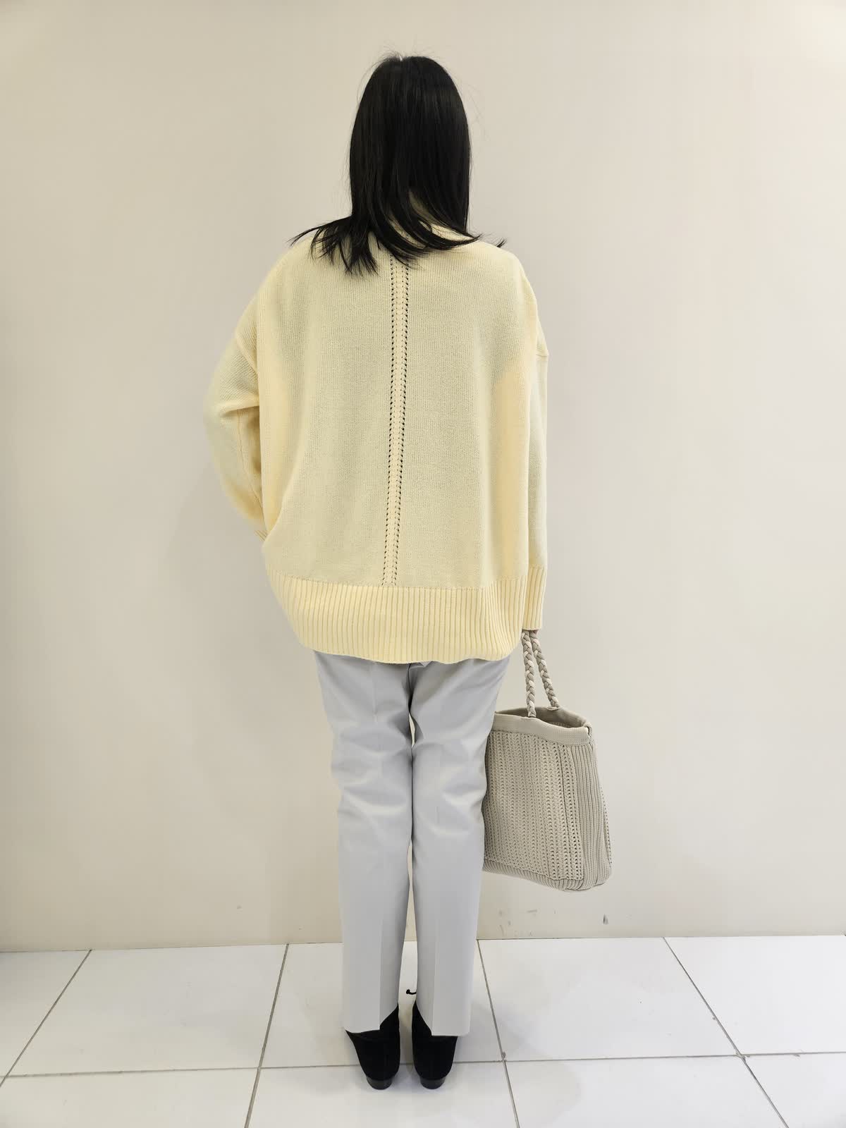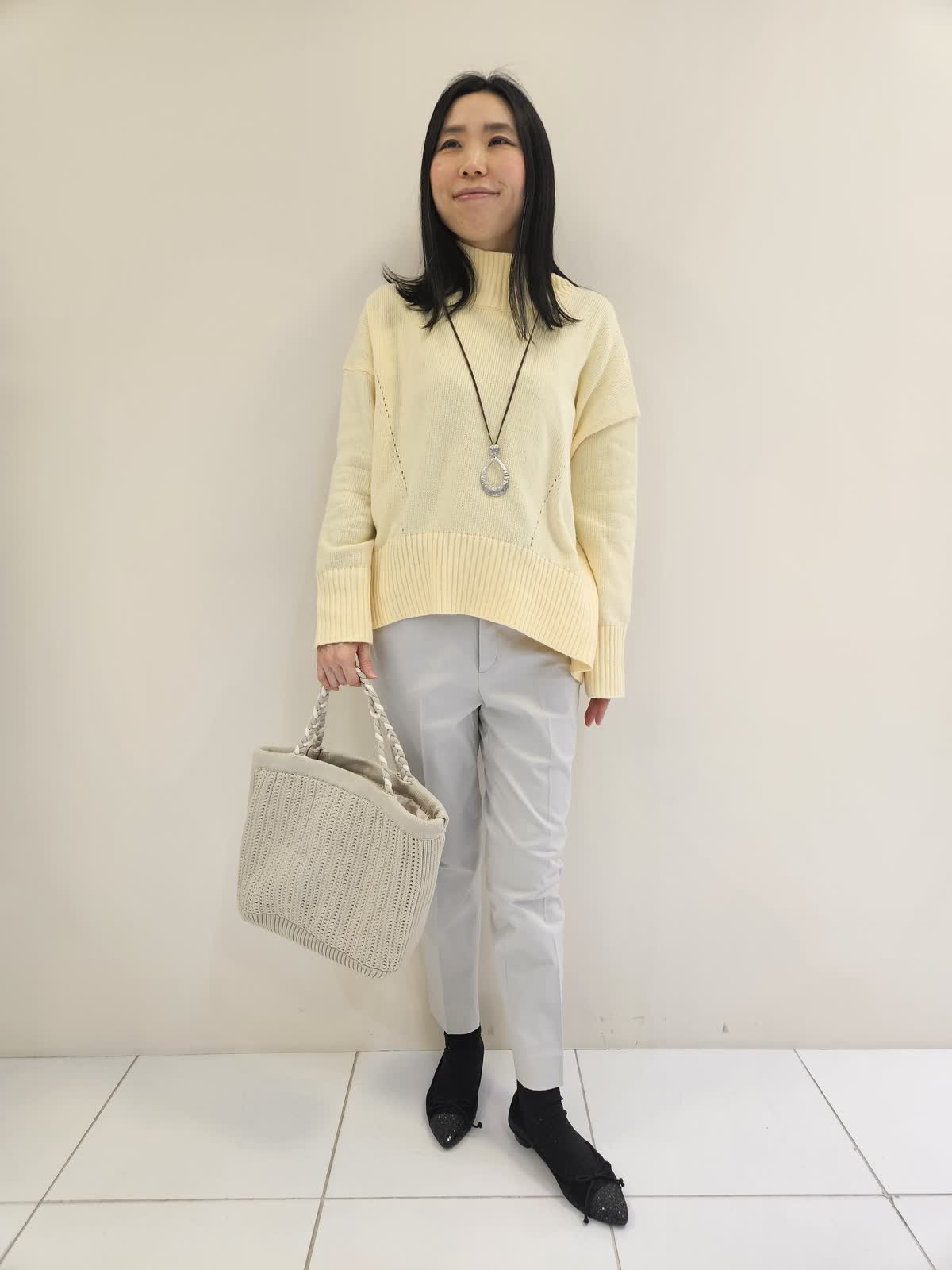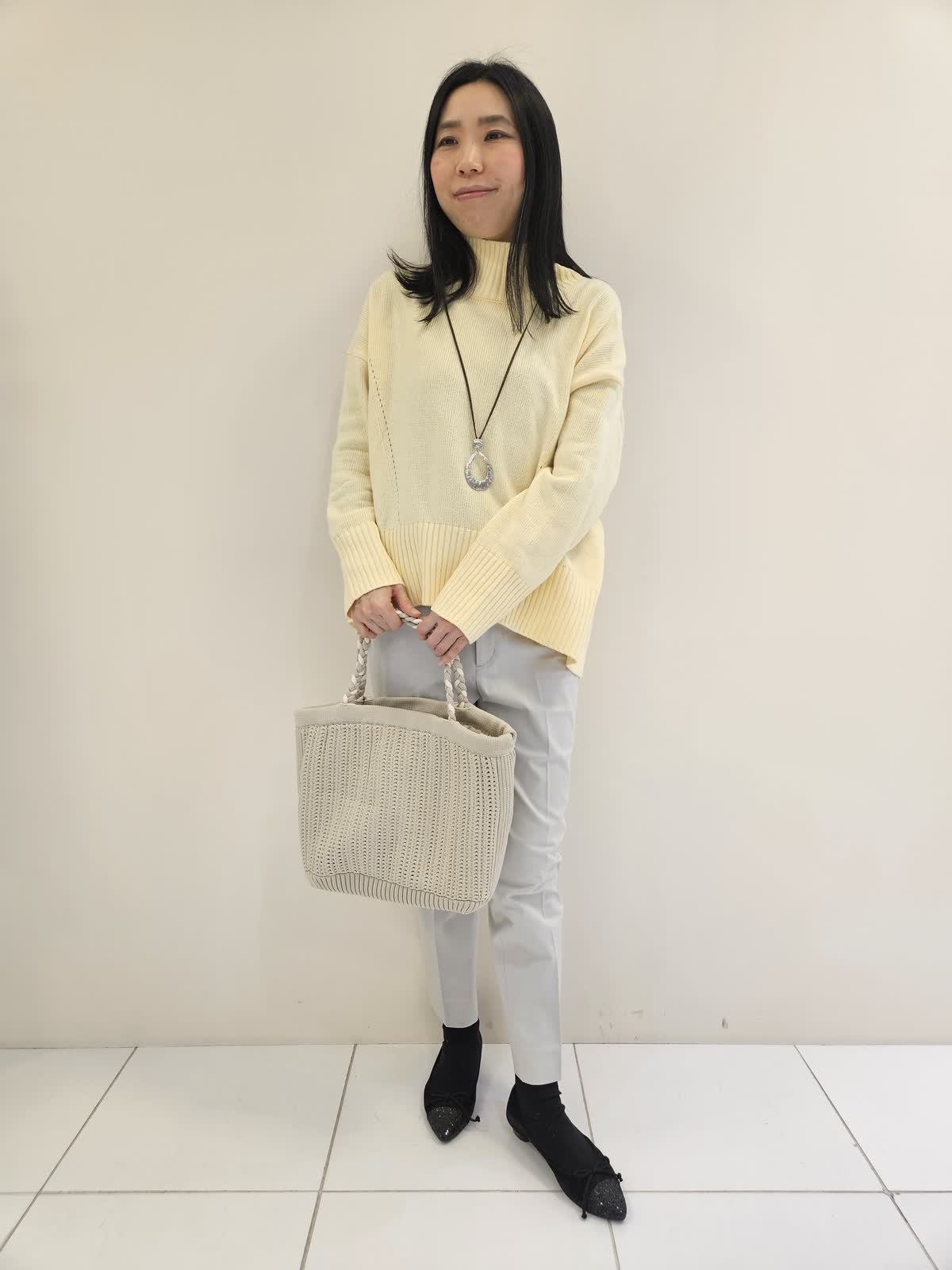 【着用サイズ・カラー】ニット:イエロー フリー・パンツ:グレー7号 ・ネックレス:シルバー フリー ・バッグ:ベージュ フリー ハイネックニットは前後差が絶妙でパンツ合わせにお勧めです。パンツは後ろにポケットがあり小尻効果があります。ドロップの形がお洒落なネックレスは軽くて無地のニットやブラウス合わせに◎ バッグはこれから春に向かって使いやすくちょつとしたお出かけに便利です。