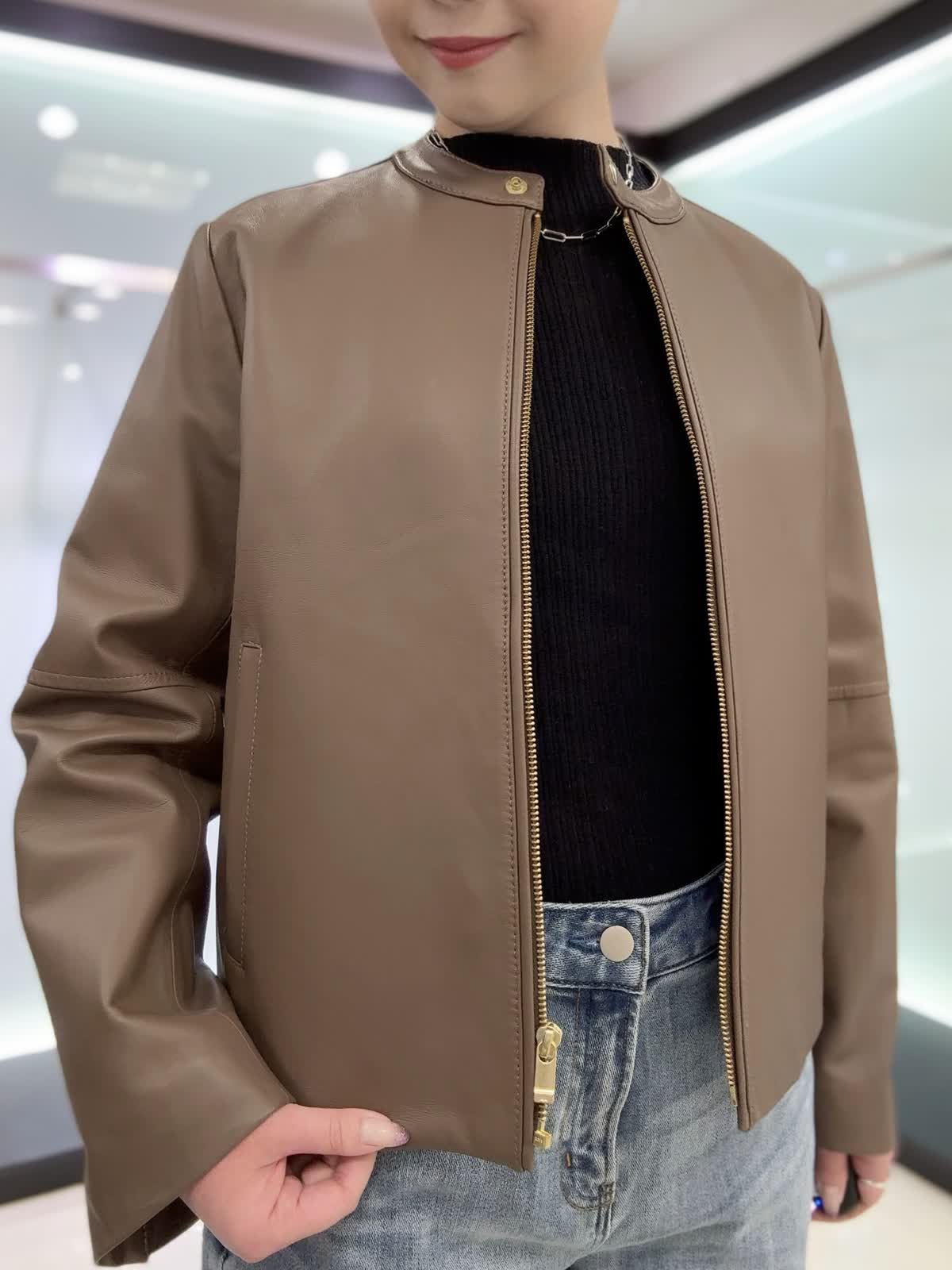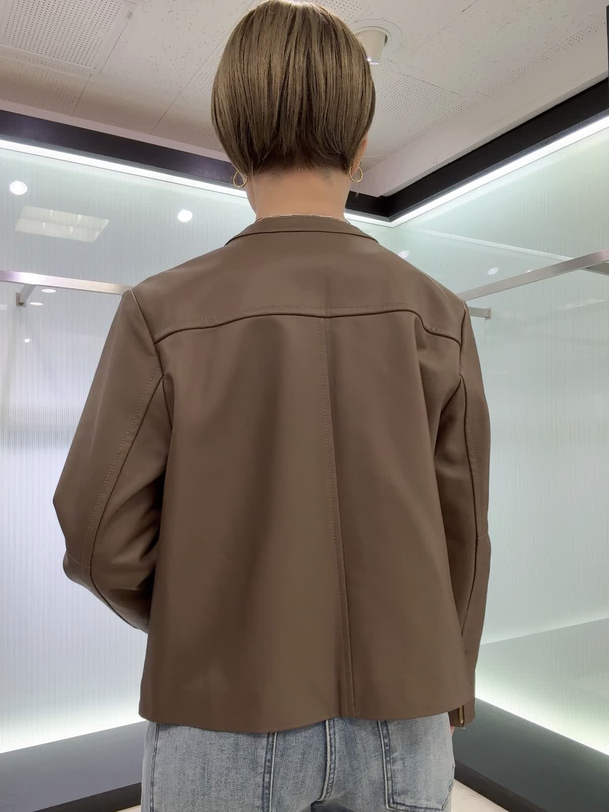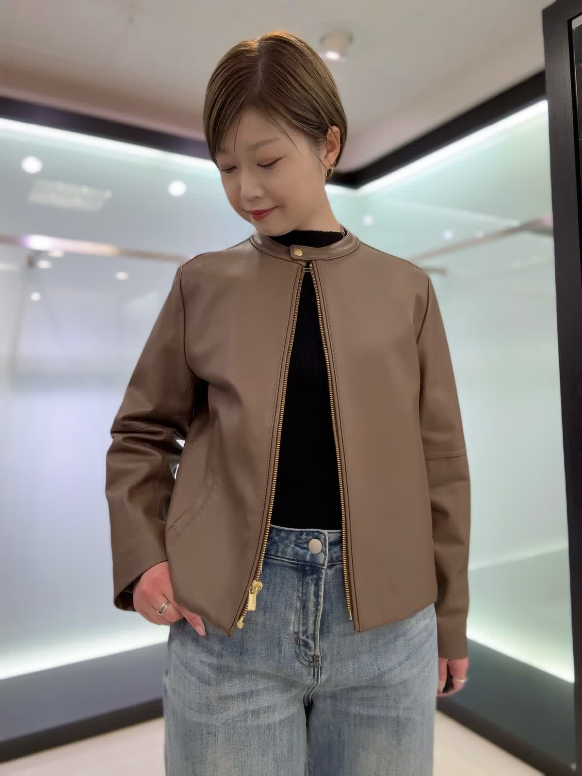 【着用カラー・サイズ】ブルゾン : ブラウン/9号 ニット : ブラック/9号 パンツ : サックス/11号 ソフトな着心地となめらかで上品なラムレザーブルゾン。ベーシックなデザインなので長く愛用いただけます♪スカートやパンツスタイル、ワンピースにも合わせられる着丈なのでおすすめです!