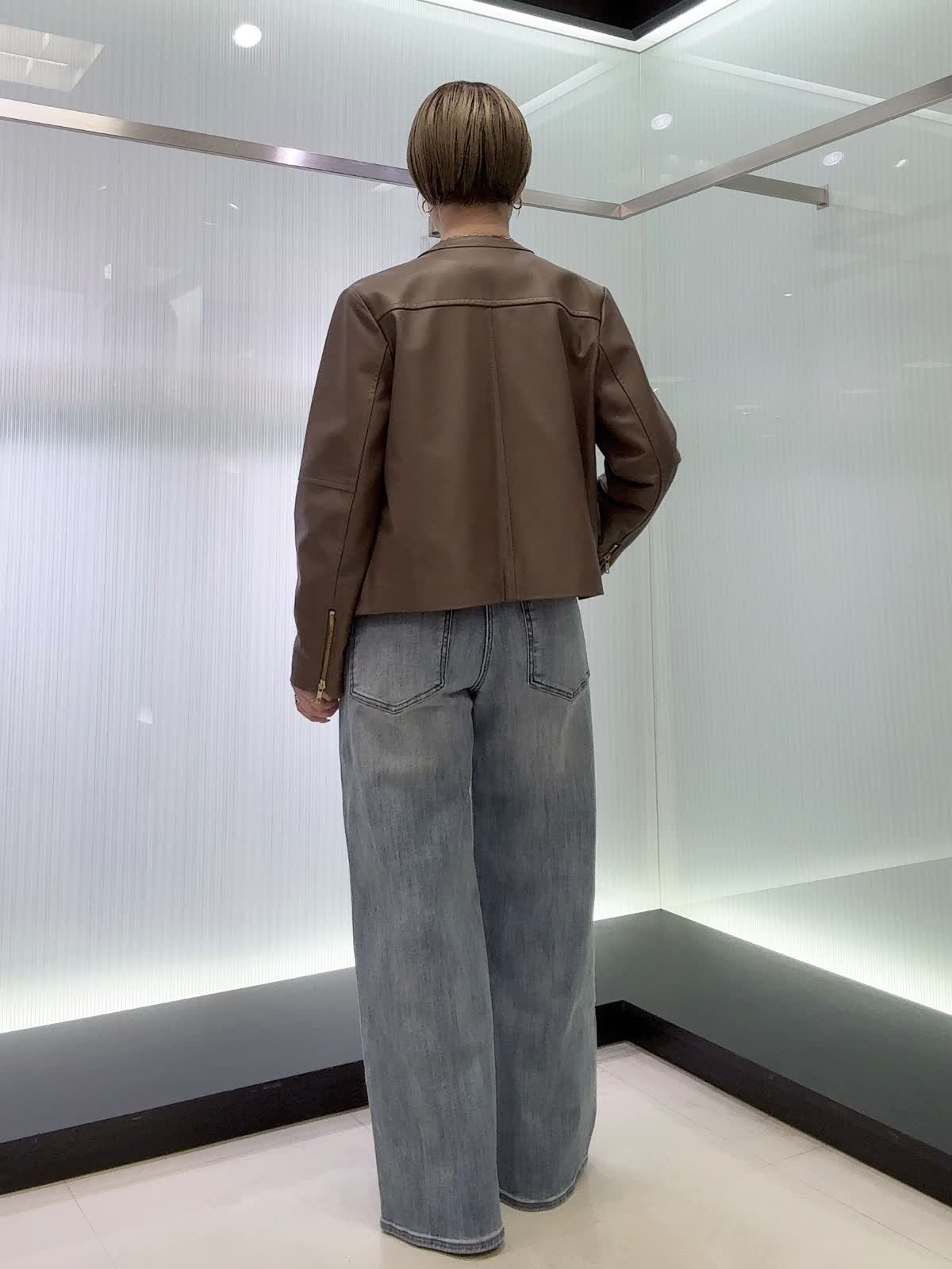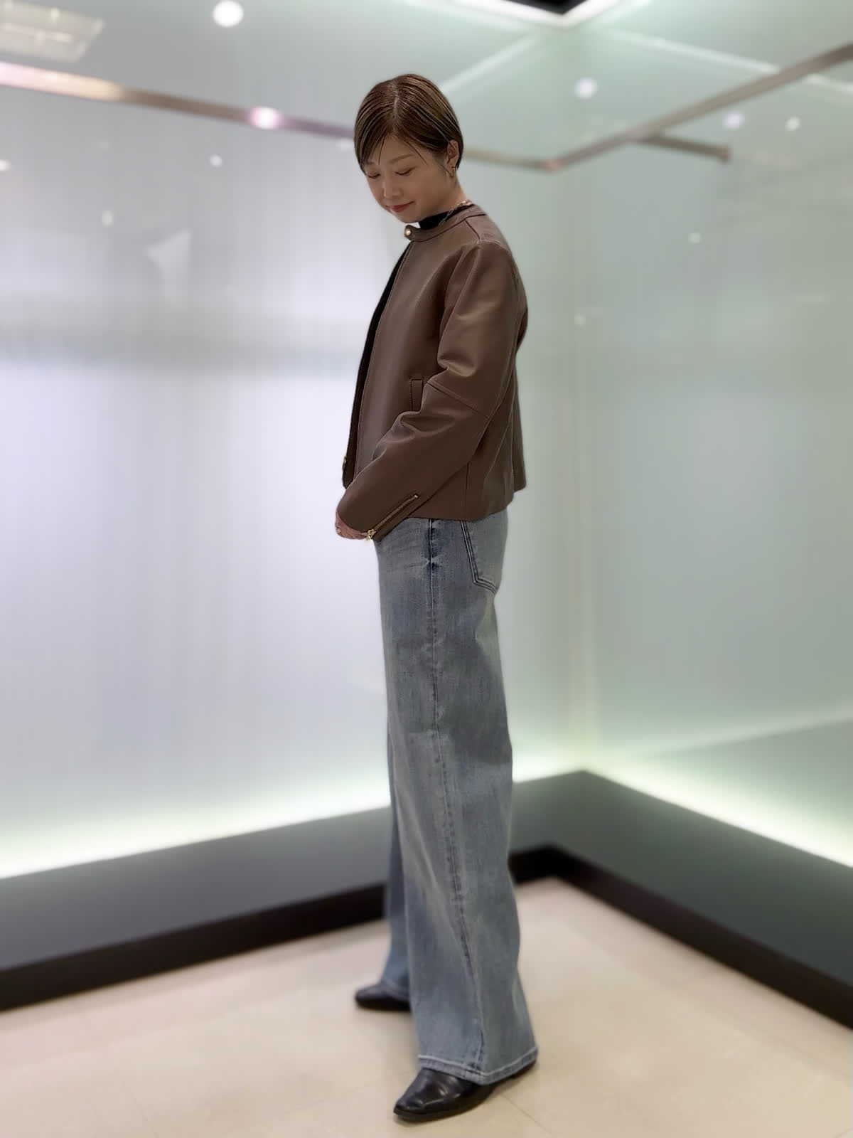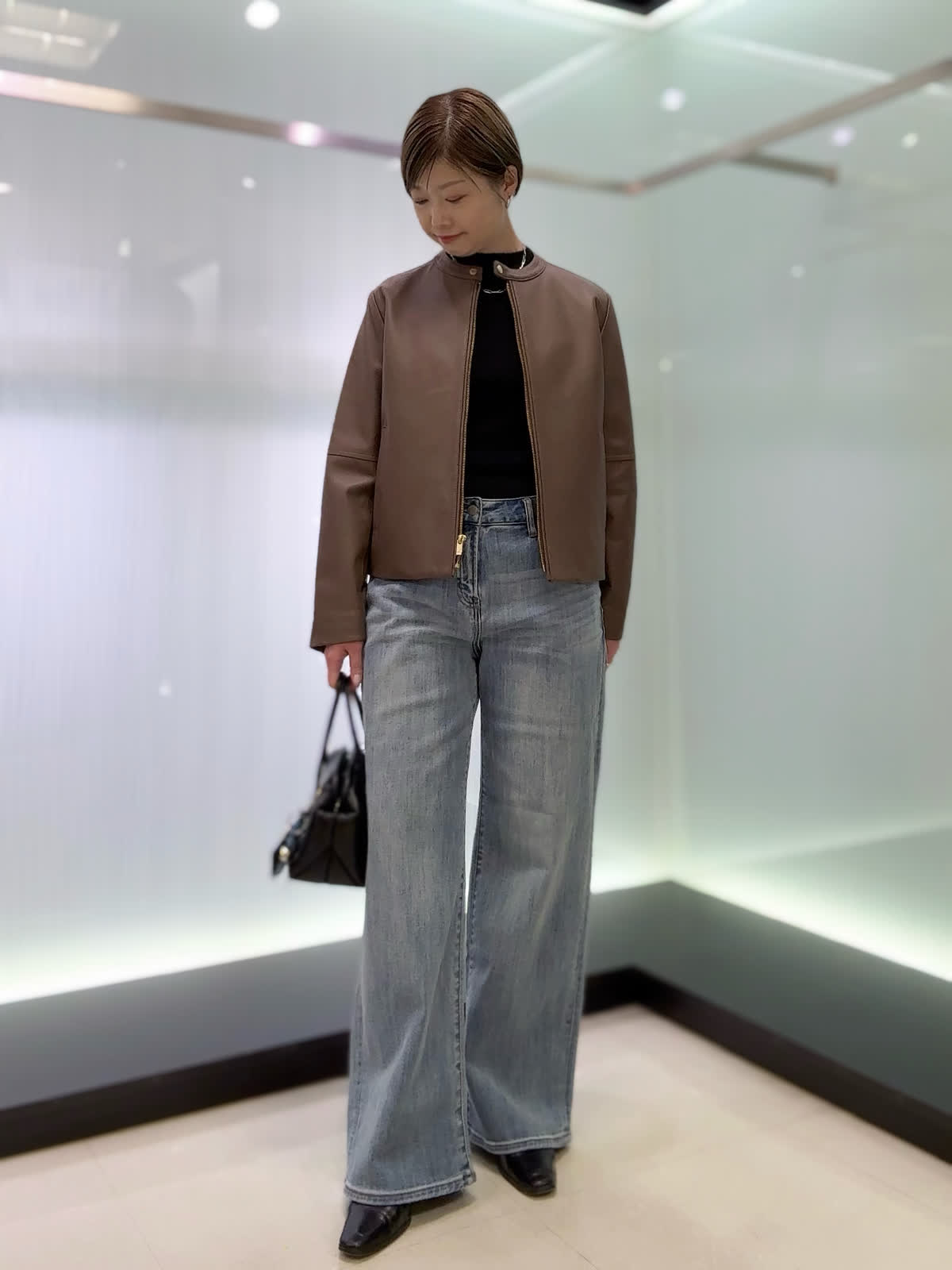 【着用カラー・サイズ】ブルゾン : ブラウン/9号 ニット : ブラック/9号 パンツ : サックス/11号 ソフトな着心地となめらかで上品なラムレザーブルゾン。ベーシックなデザインなので長く愛用いただけます♪スカートやパンツスタイル、ワンピースにも合わせられる着丈なのでおすすめです!