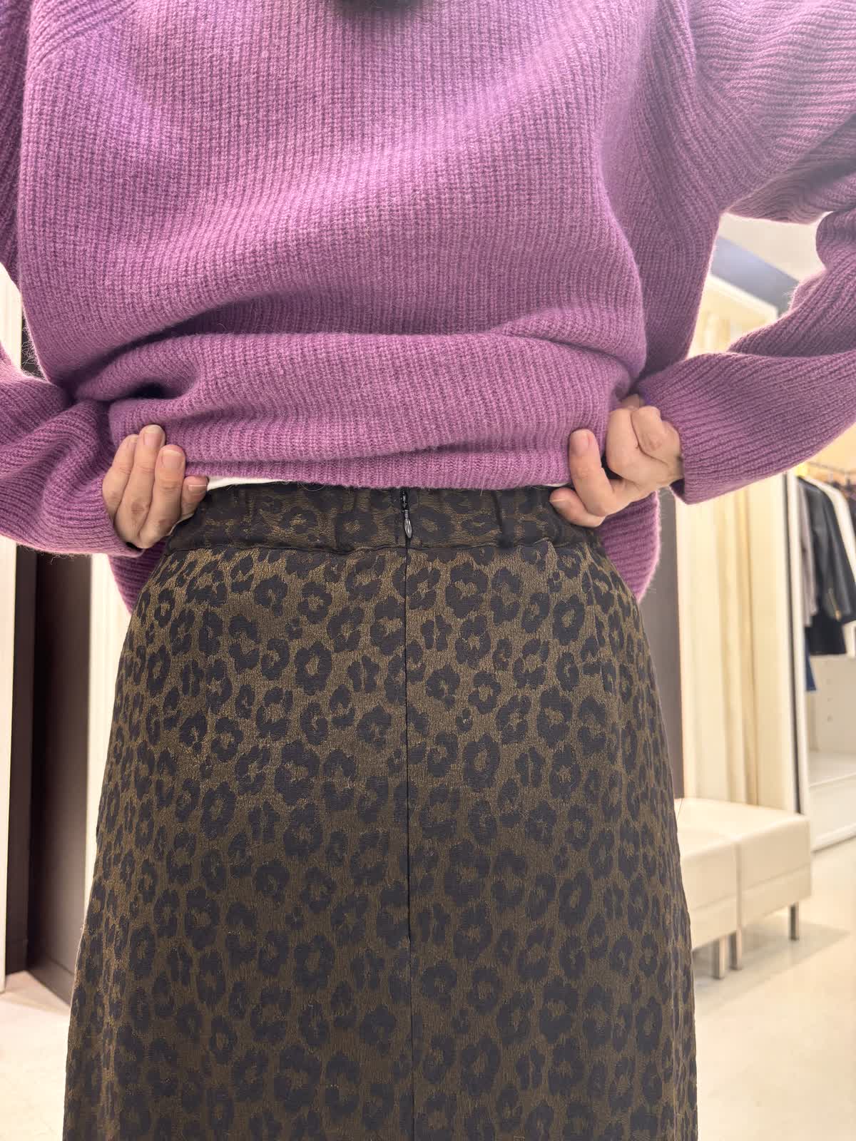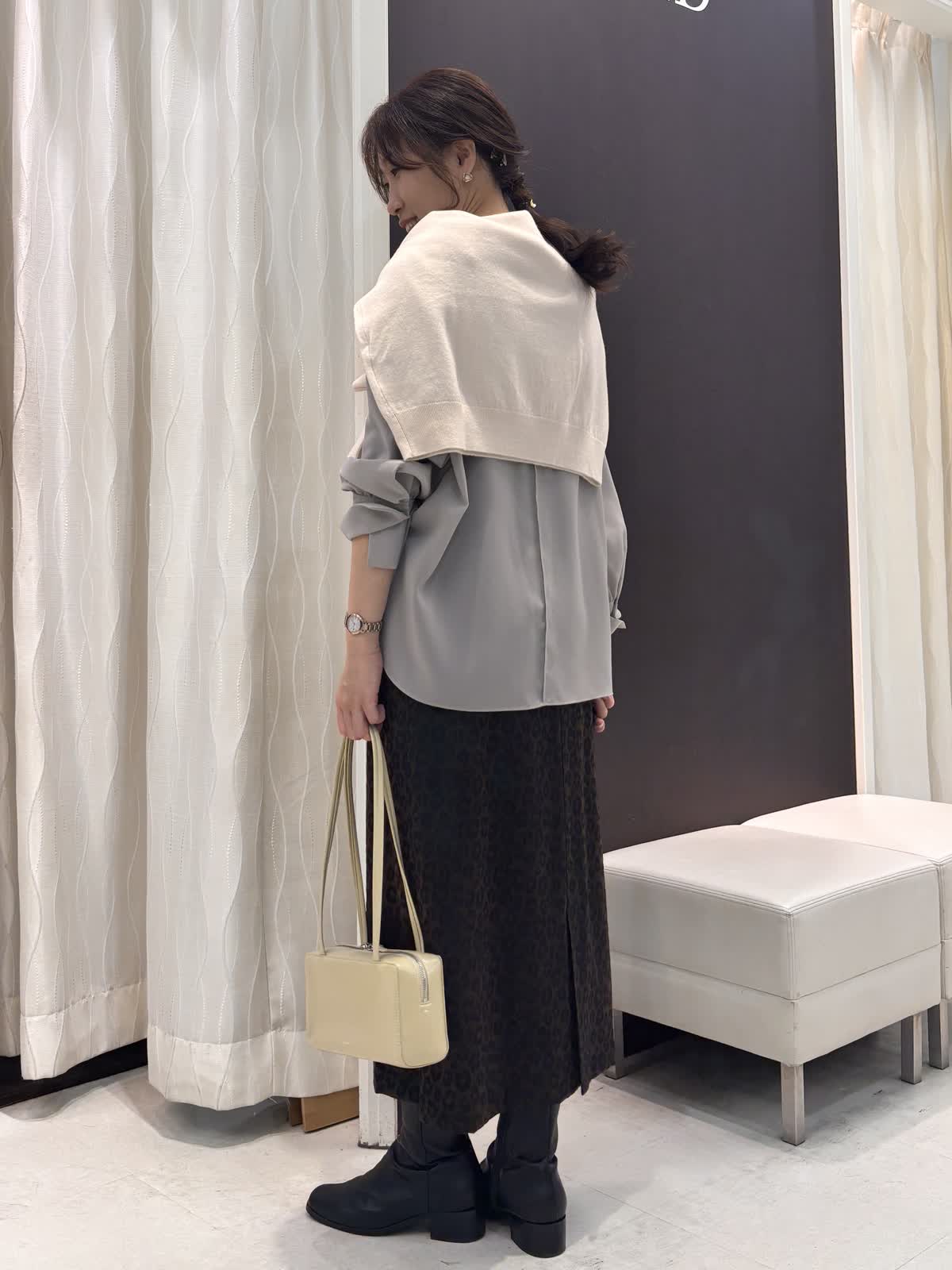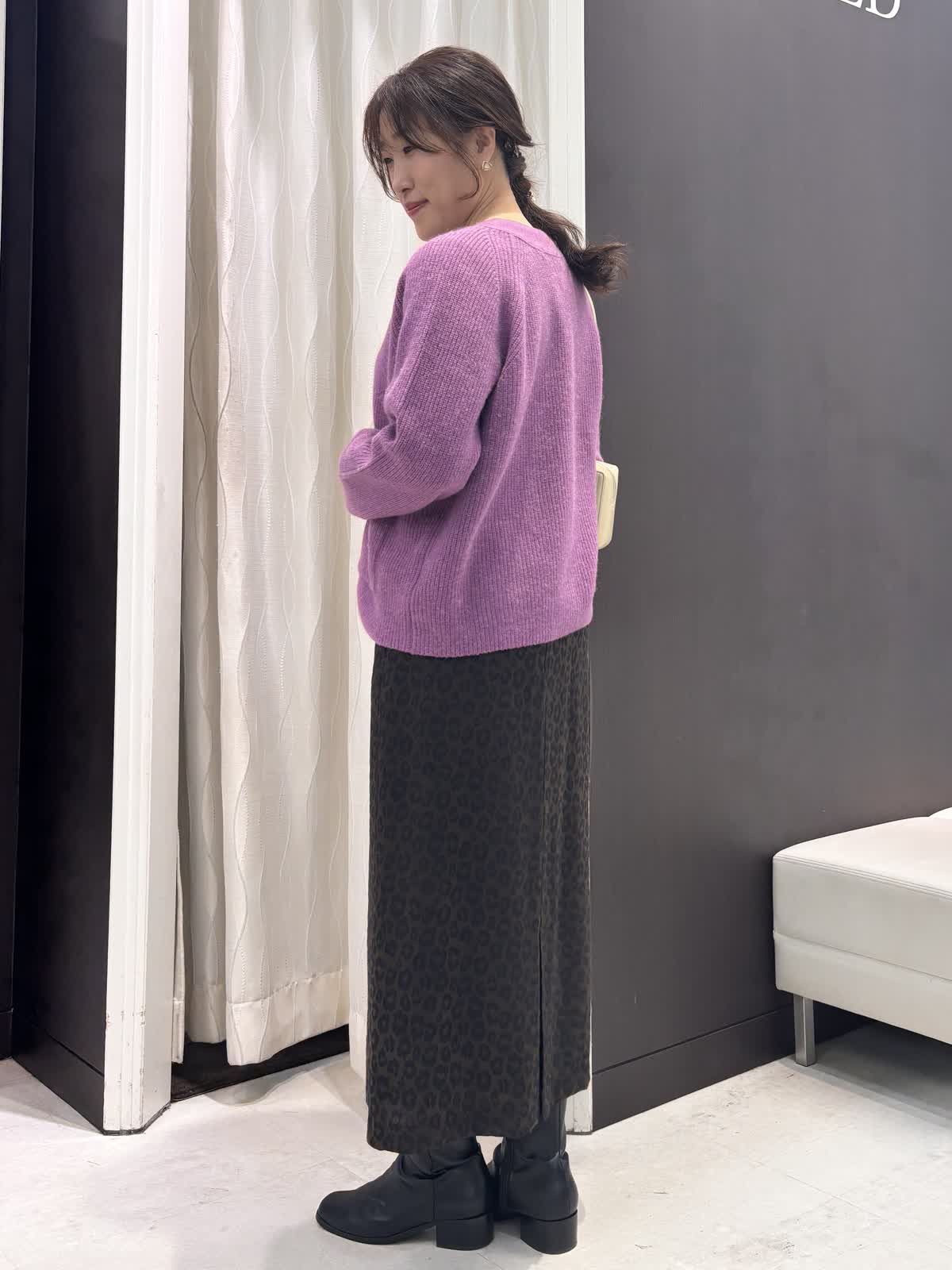 カジュアルな女子会やランチのコーデにはパープルカラーのニットを合わせて華やかに。スカートは光沢感のある大人めなデザインです。目立ちすぎないレオパード柄が主張しすぎず合わせやすい。タイトスカートなのでスッキリ見えます。ウエストは後ろゴムでサイズはゆったりめの9号でした。ニットは暖かいアルパカ混で厚みもあるのでTシャツをレイヤードして1枚着として使えます。スカートにも合わせやすい着丈でした。トップスをブラウスにするときちんと見えるのでオフィスカジュアルにも使えそう。