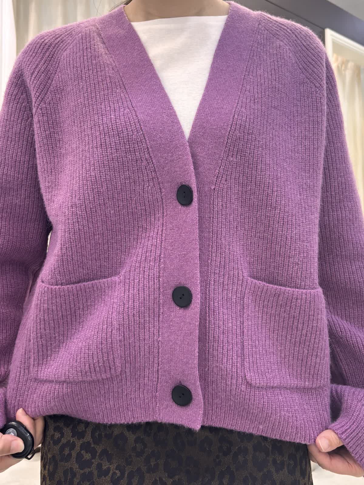 【着用カラー】ニットカーディガン:パープル スカート:柄中 ブラウス:グレー ニット:オフホワイト