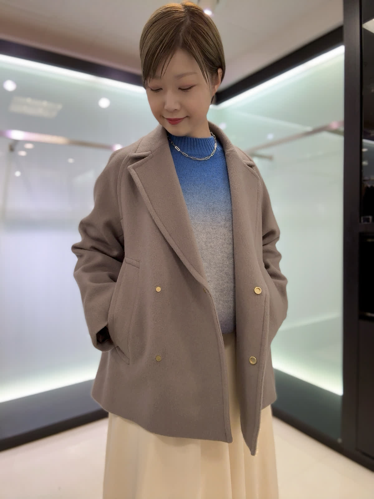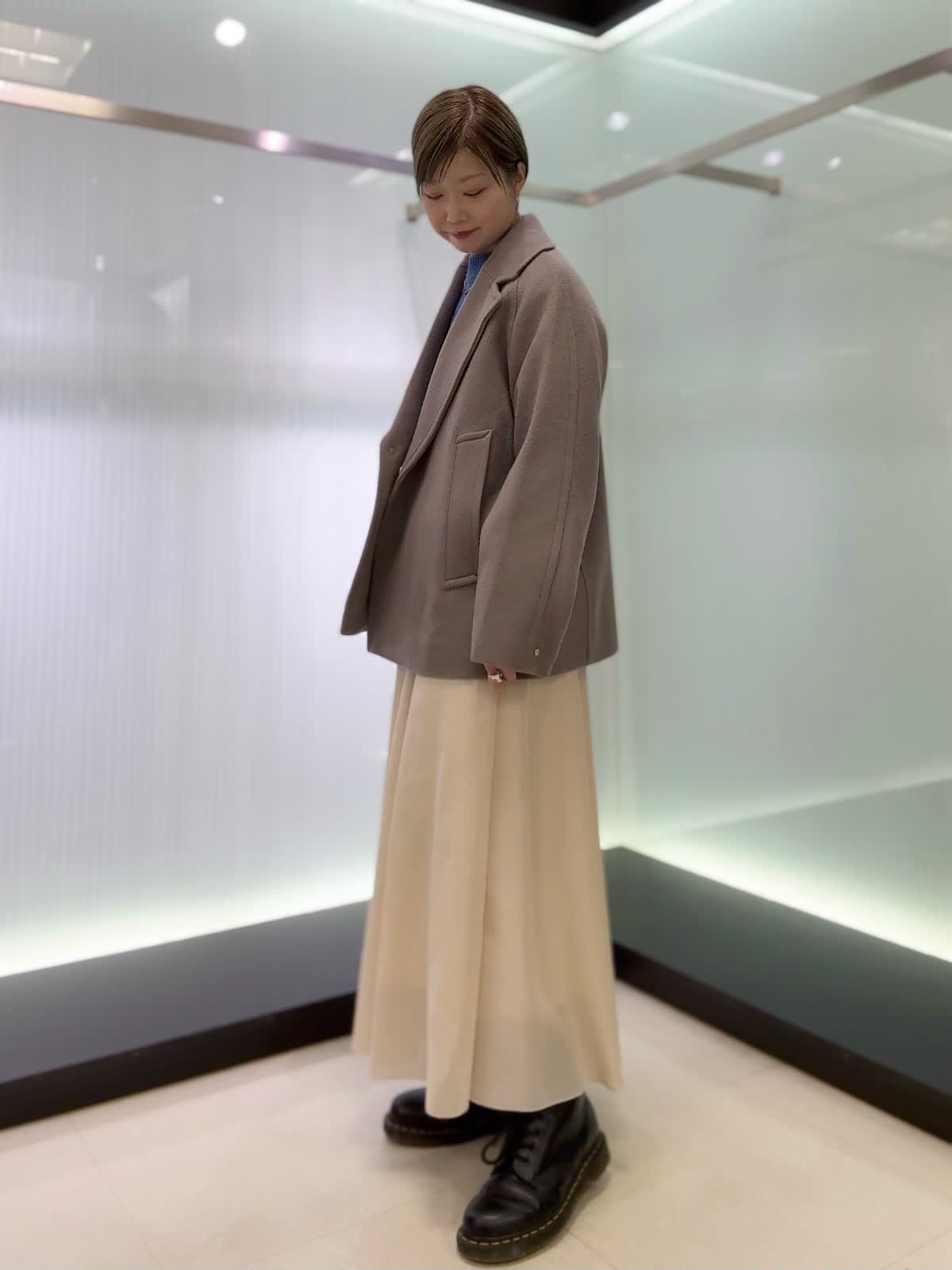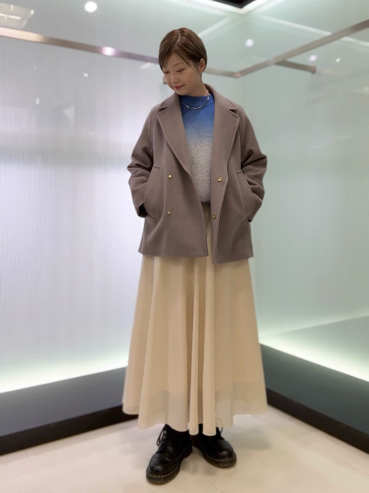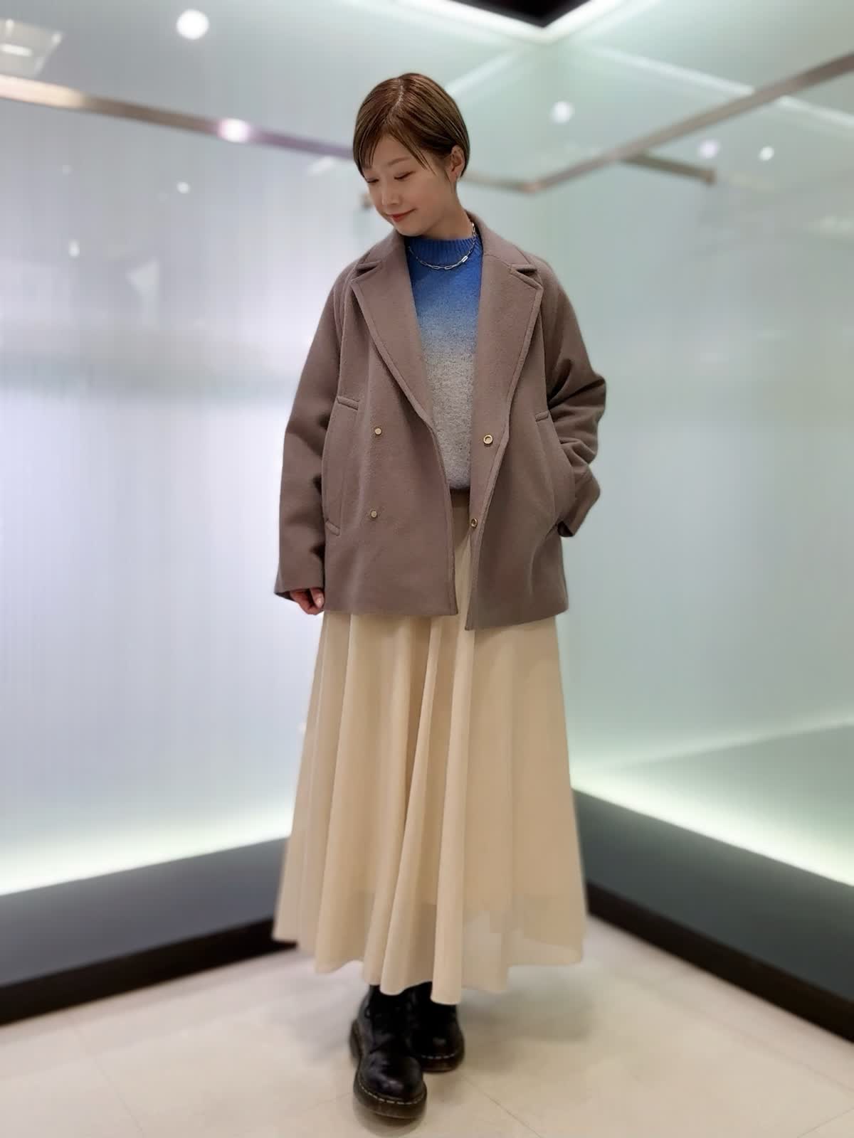 【着用カラー・サイズ】コート : グレーベージュ/9号 ニット : ブルー/9号 スカート : アイボリー/9号 バランスの取りやすいミドル丈のコートは幅広いコーディネートに活躍してくれます。グラデーションニットは1枚でキマる存在感のあるニット。スカートはシルエットが綺麗で程良い光沢感があるので上品な印象です。