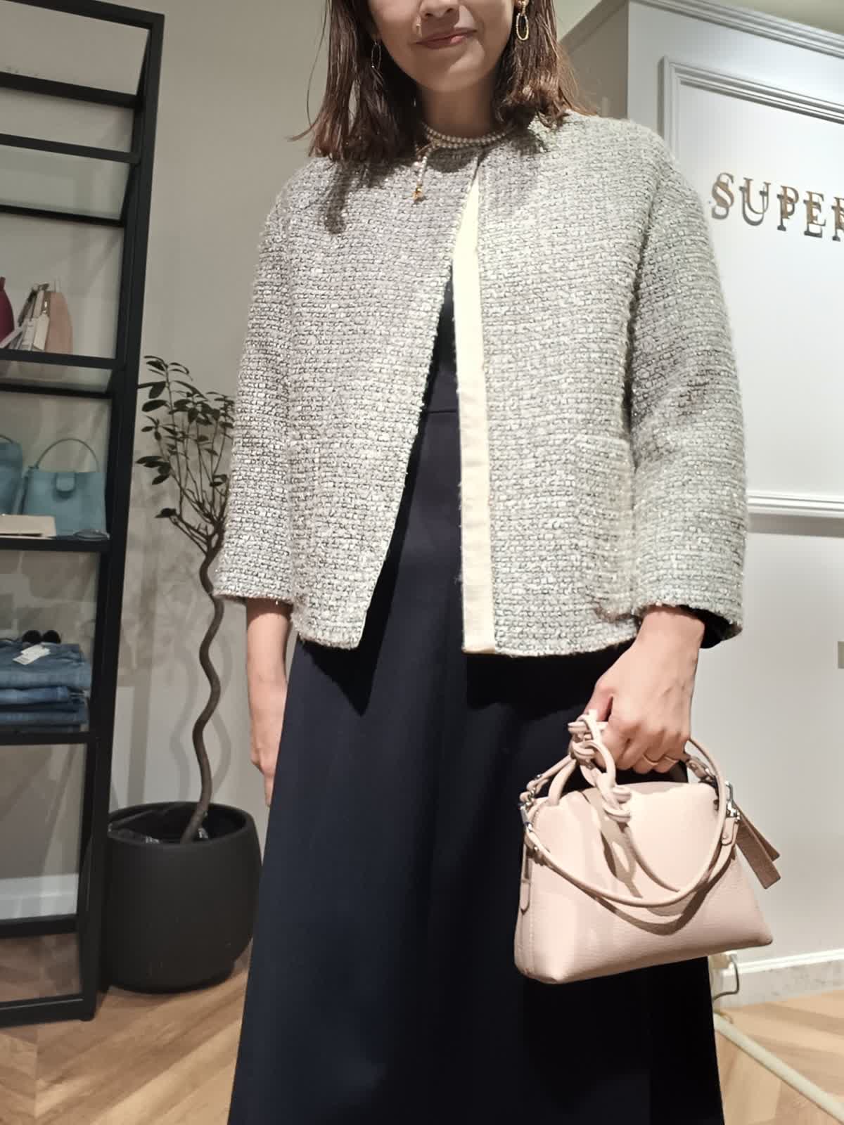 【着用サイズ:カラー】ジャケット:9号:グリーン ワンピース:9号:ネイビー LINTON社のツィードのジャケットは、程よいゆとりとドロップショルダーで、着心地の良さが抜群。柔らかいグリーンが顔映りを明るくみせてくれます。ボトムとの相性も良く、セレモニーやお仕事、デイリー使いと幅広いシーンで活躍してくれます。