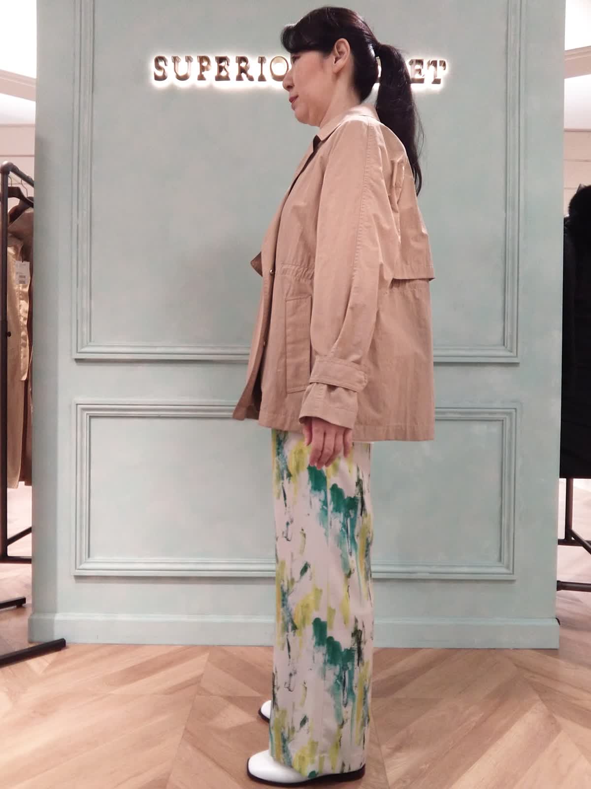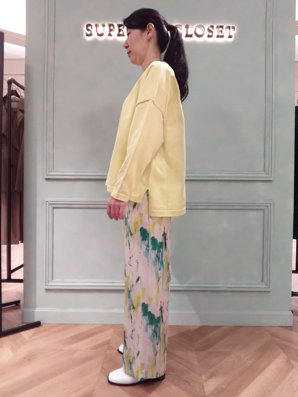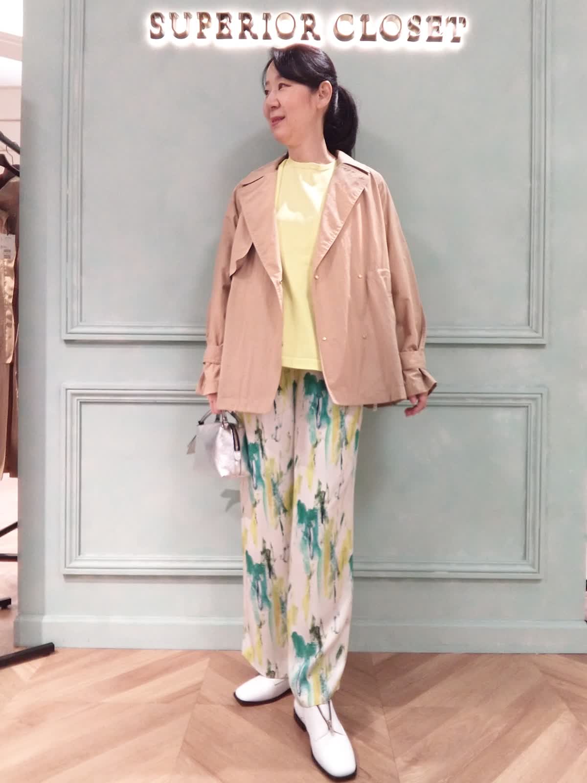 【着用サイズ】コート:9号、ニット:9号、パンツ:9号 【着用カラー】コート:キャメル、ニット:ビビットイエロー、パンツ:ペパーミント 春のおでかけスタイル。気分が華やぐ春は明るいイエローカラーのニットとプリントパンツでコーディネート。ゆったりとしたサイジングでパンツはウエストゴムのイージー仕様、ラクな着心地です。コートは袖口を絞るとふわっとボリュームスリーブになります。ウエストは内側のドロストでしぼって着られて広がり感を調節可能。軽くて気軽に羽織れる1枚です。