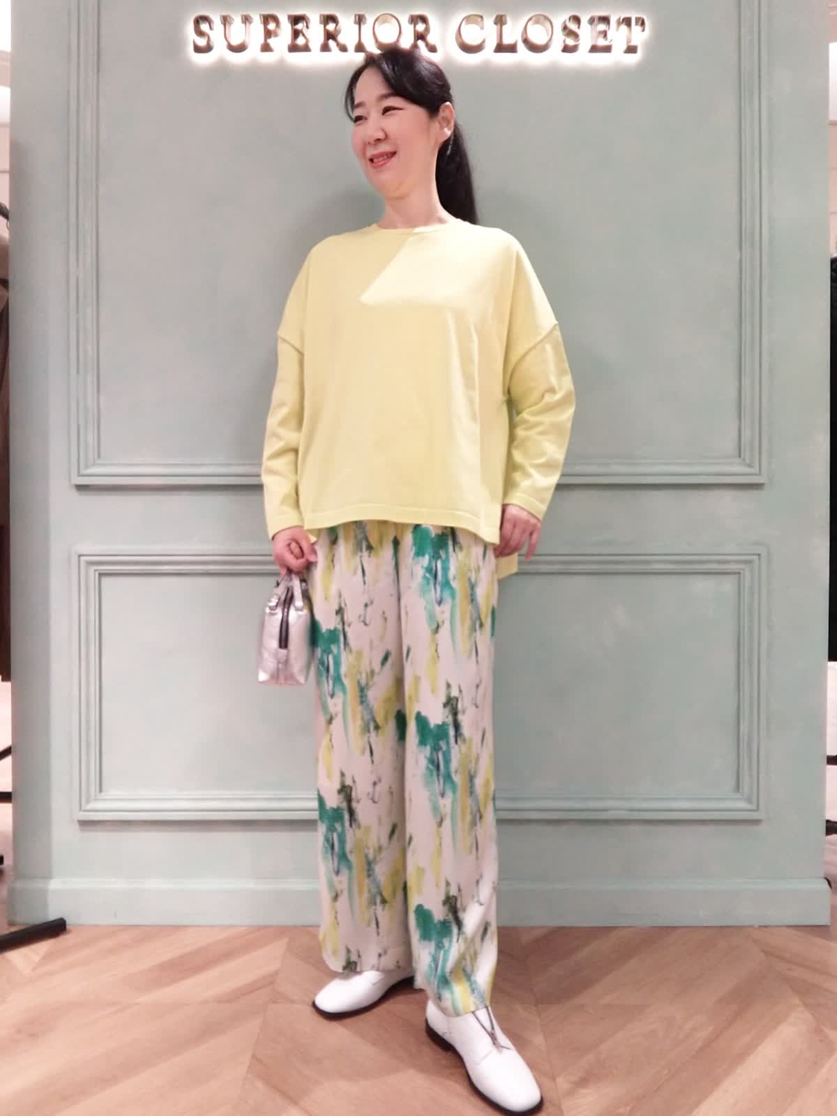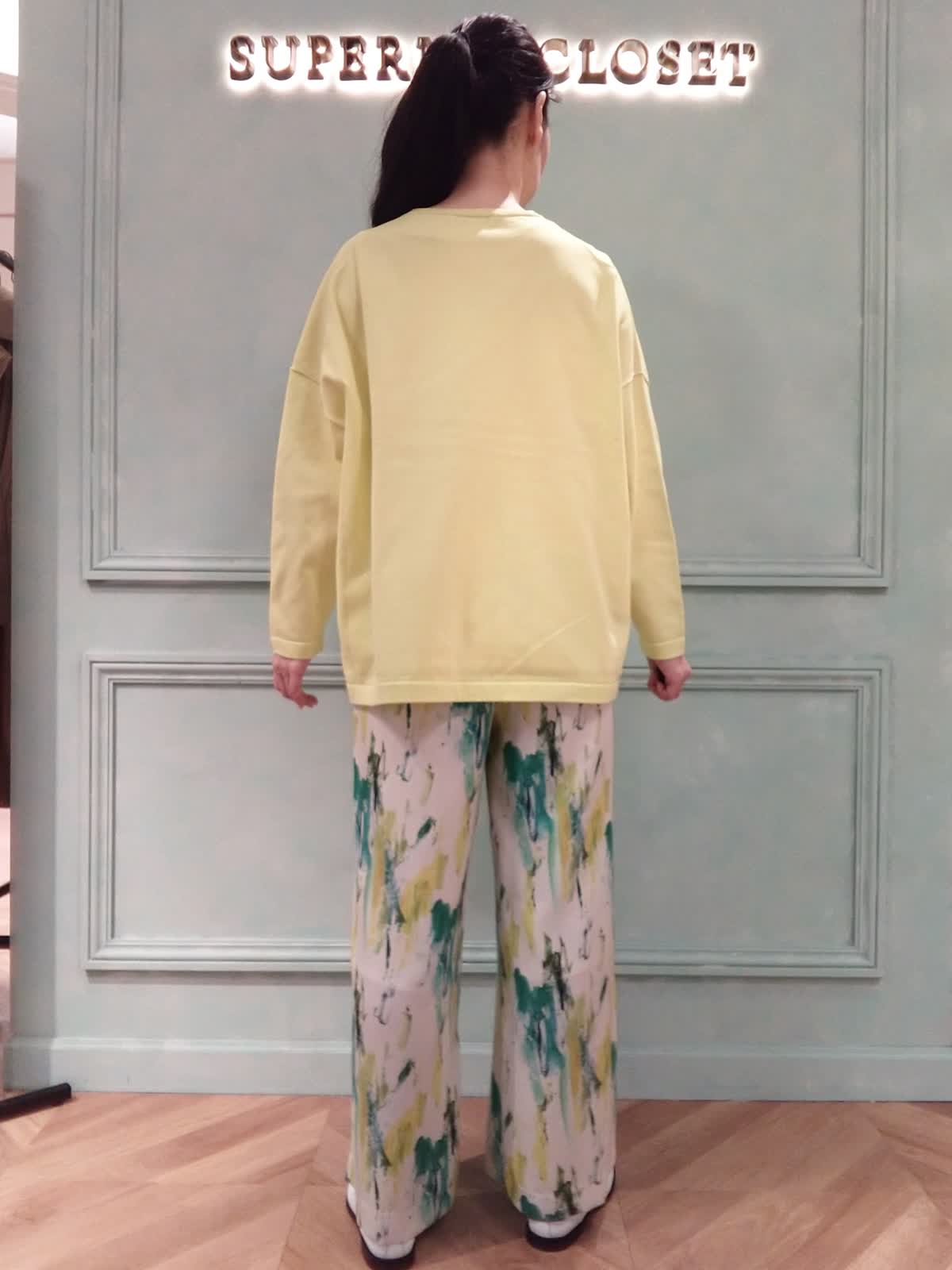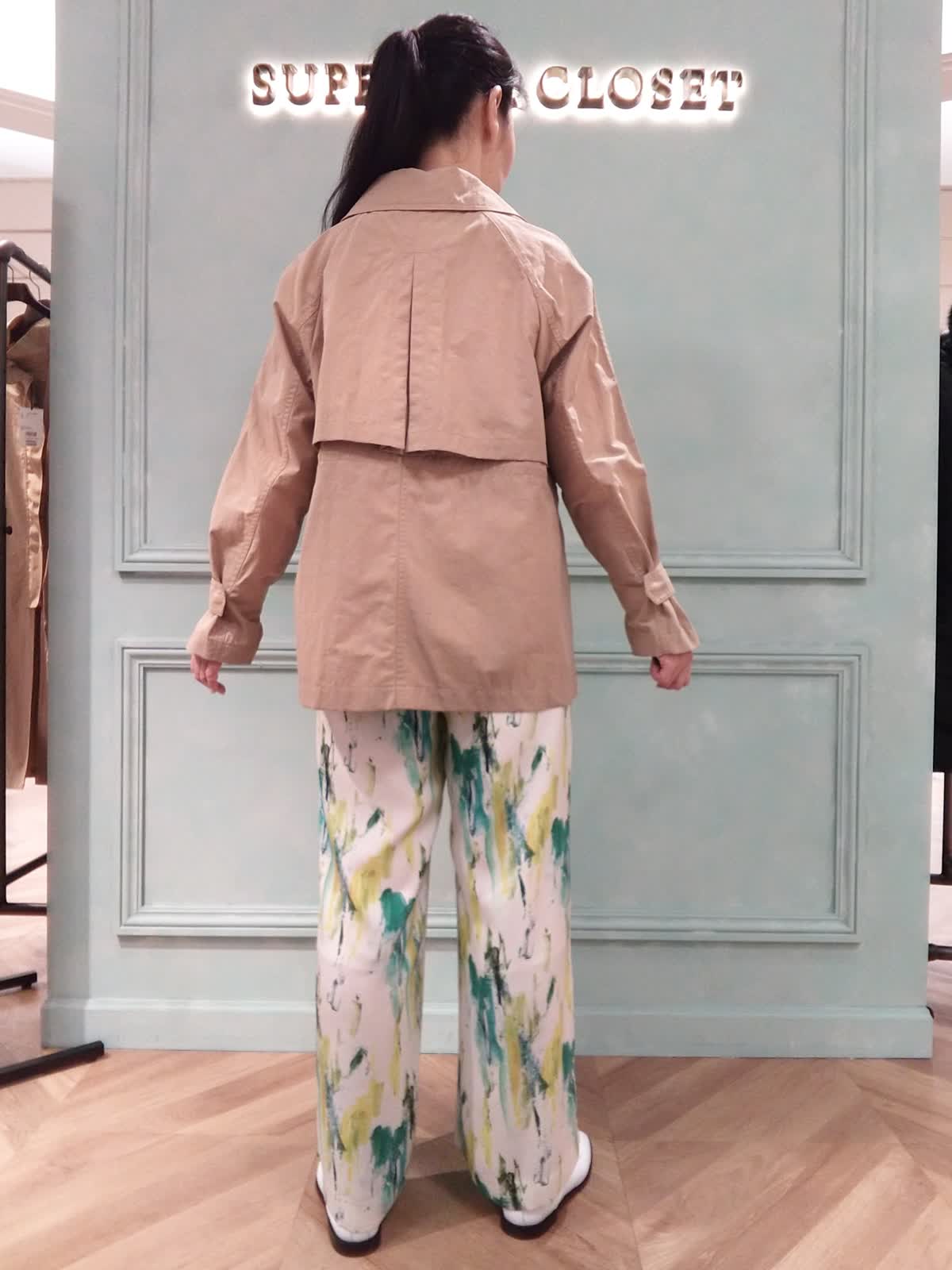 【着用サイズ】コート:9号、ニット:9号、パンツ:9号 【着用カラー】コート:キャメル、ニット:ビビットイエロー、パンツ:ペパーミント 春のおでかけスタイル。気分が華やぐ春は明るいイエローカラーのニットとプリントパンツでコーディネート。ゆったりとしたサイジングでパンツはウエストゴムのイージー仕様、ラクな着心地です。コートは袖口を絞るとふわっとボリュームスリーブになります。ウエストは内側のドロストでしぼって着られて広がり感を調節可能。軽くて気軽に羽織れる1枚です。