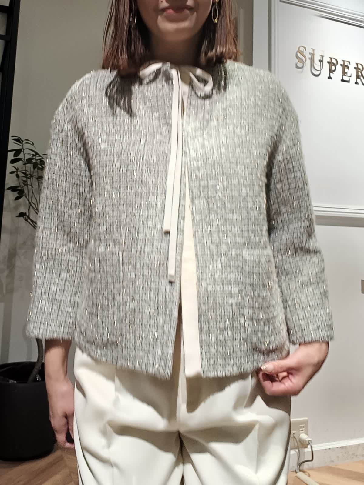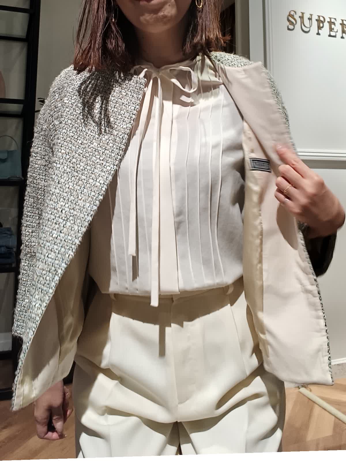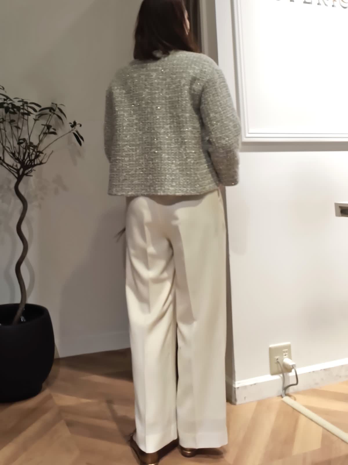 【着用サイズ:カラー】ジャケット:9号:グリーン ブラウス:9号:ホワイト パンツ:11号:オフホワイト LINTON社のツィードジャケットで華やかなパンツスタイルにしてみました。優しく華やかなグリーンは、顔映りも良くオシャレ感を出してくれるジャケットです。 デニムなどでカジュアルに着るのもオススメです。
