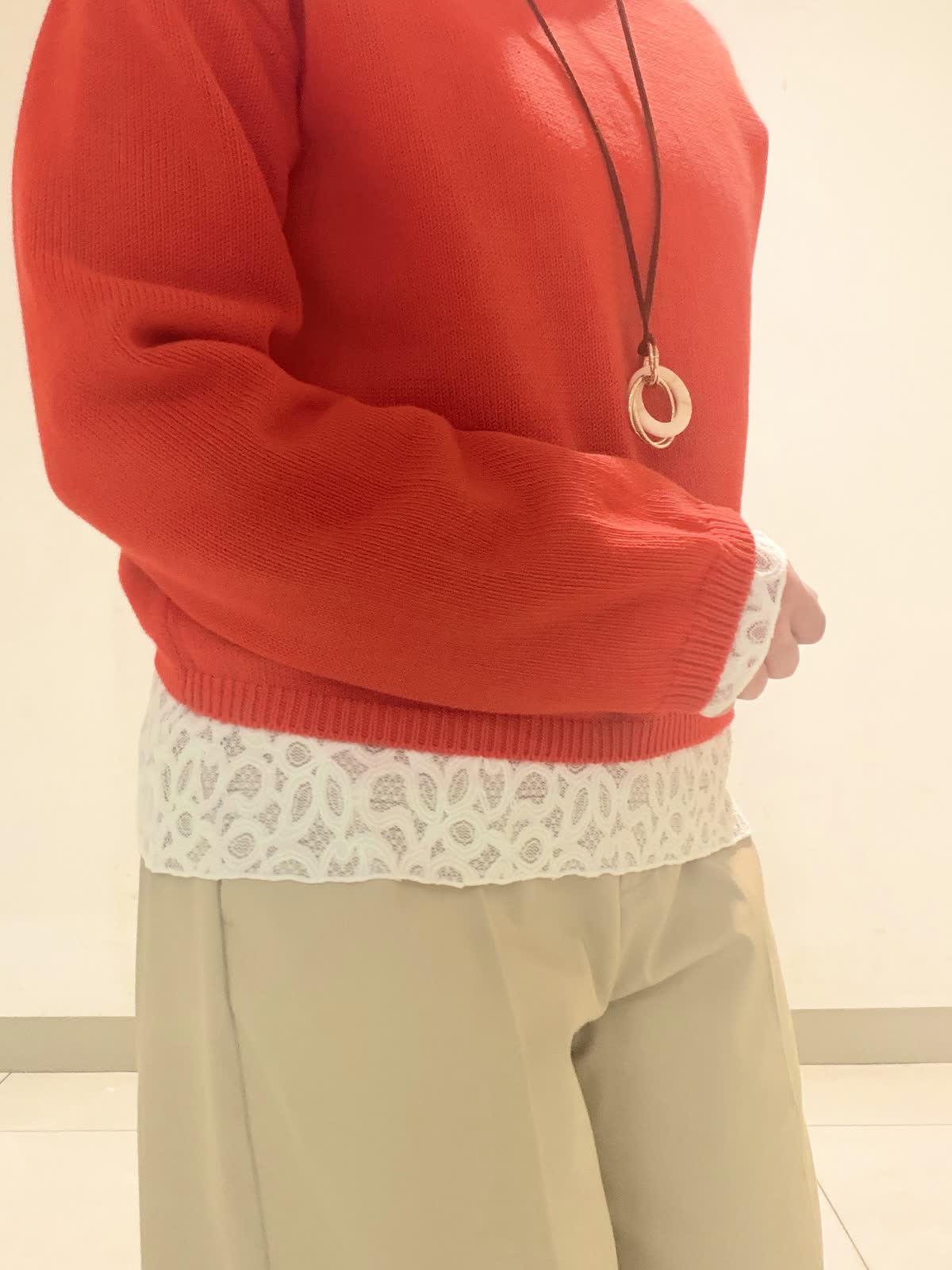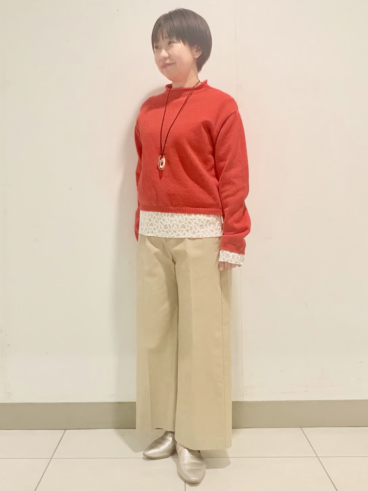 【着用サイズ】ニット:フリー カットソー:9号 パンツ:9号 襟元のロールがポイントの大人可愛いニット。着丈が短めなのでボリュームのあるボトムとの相性抜群◎。インナーには袖口と裾にレースを施したカットソー合わせてレイヤードスタイルに。気になるヒップもカバー出来ます。綿素材のワイドクロップトパンツと合わせて春のお出かけスタイリングの出来上がりです!