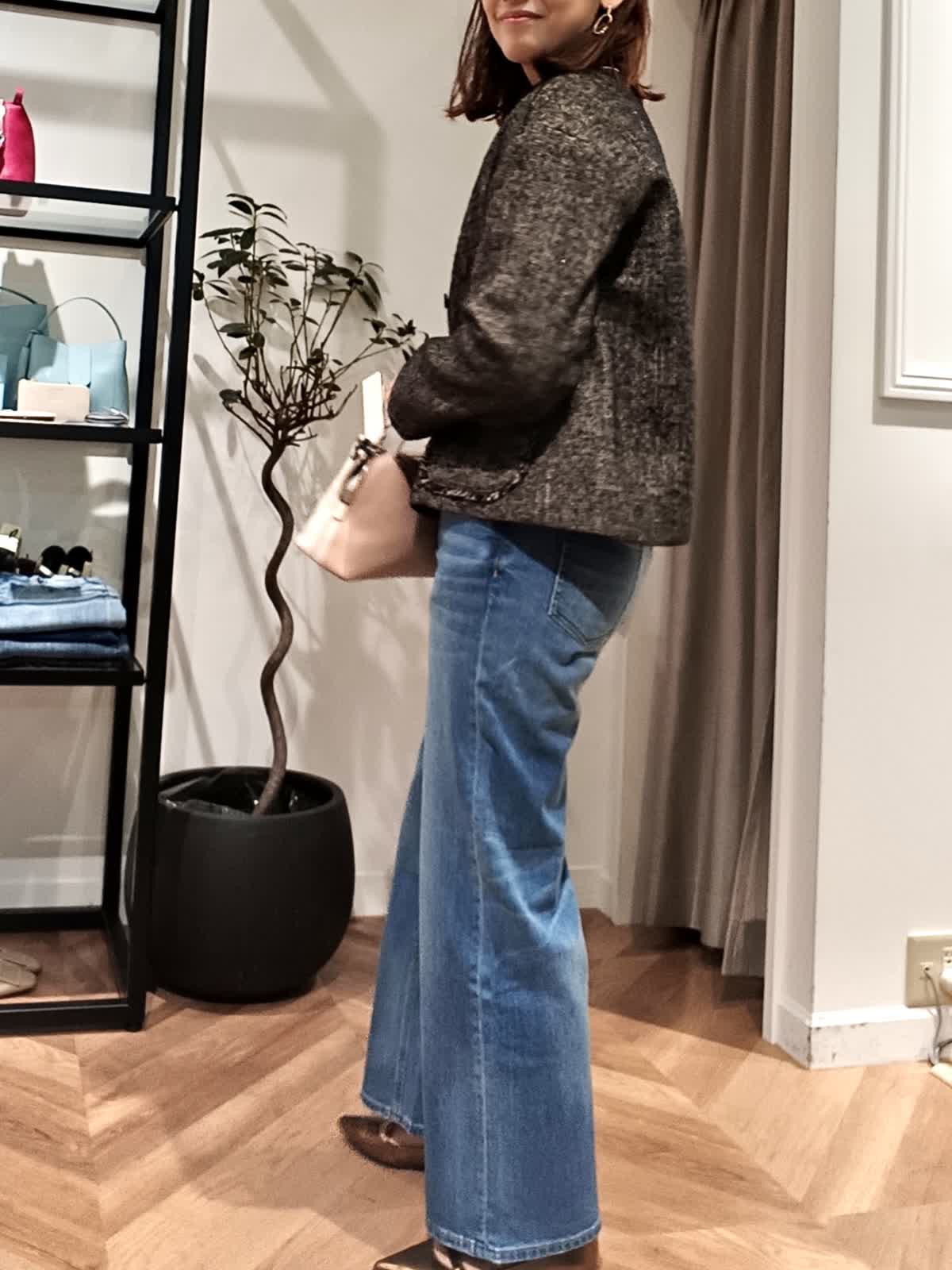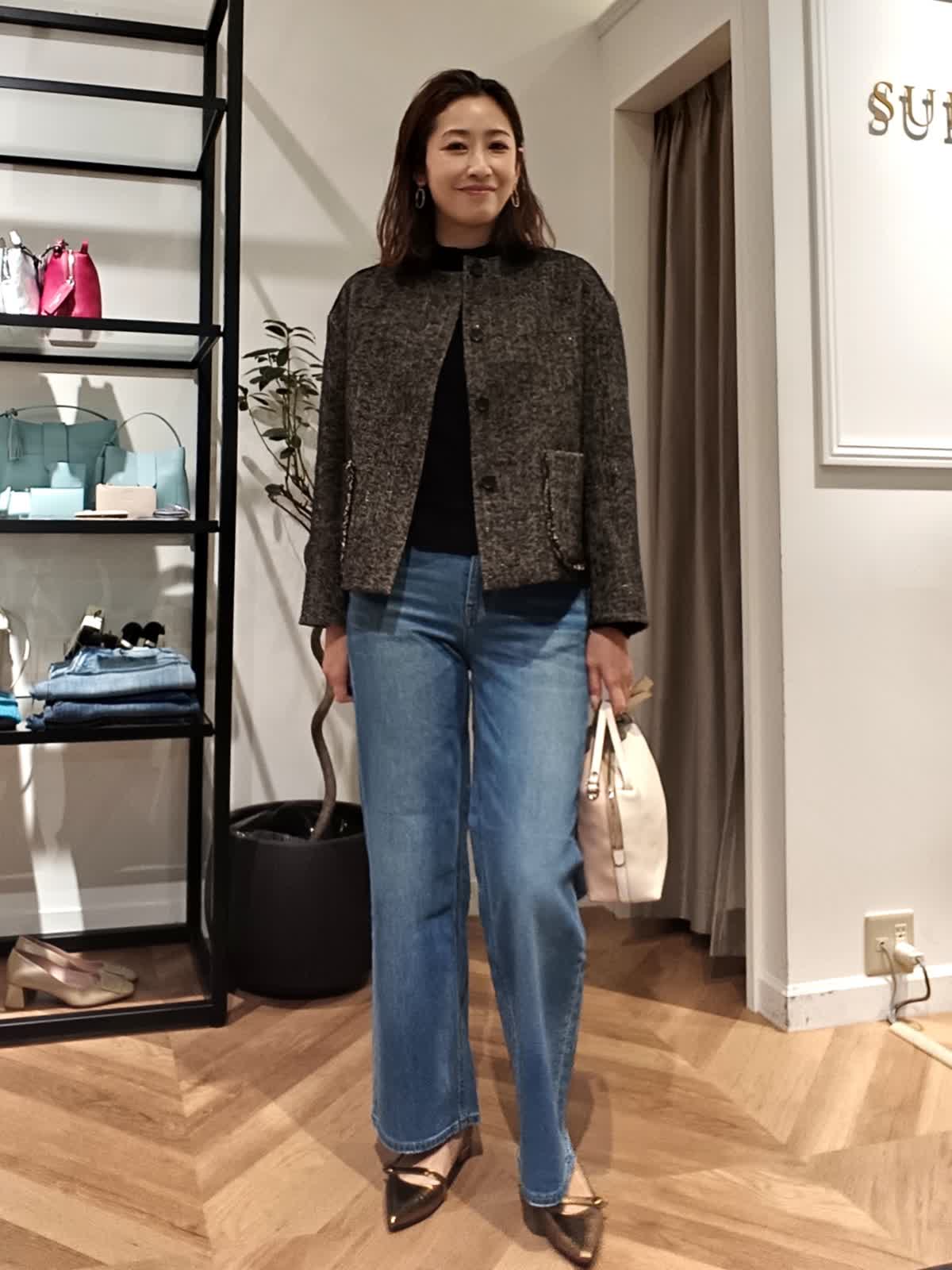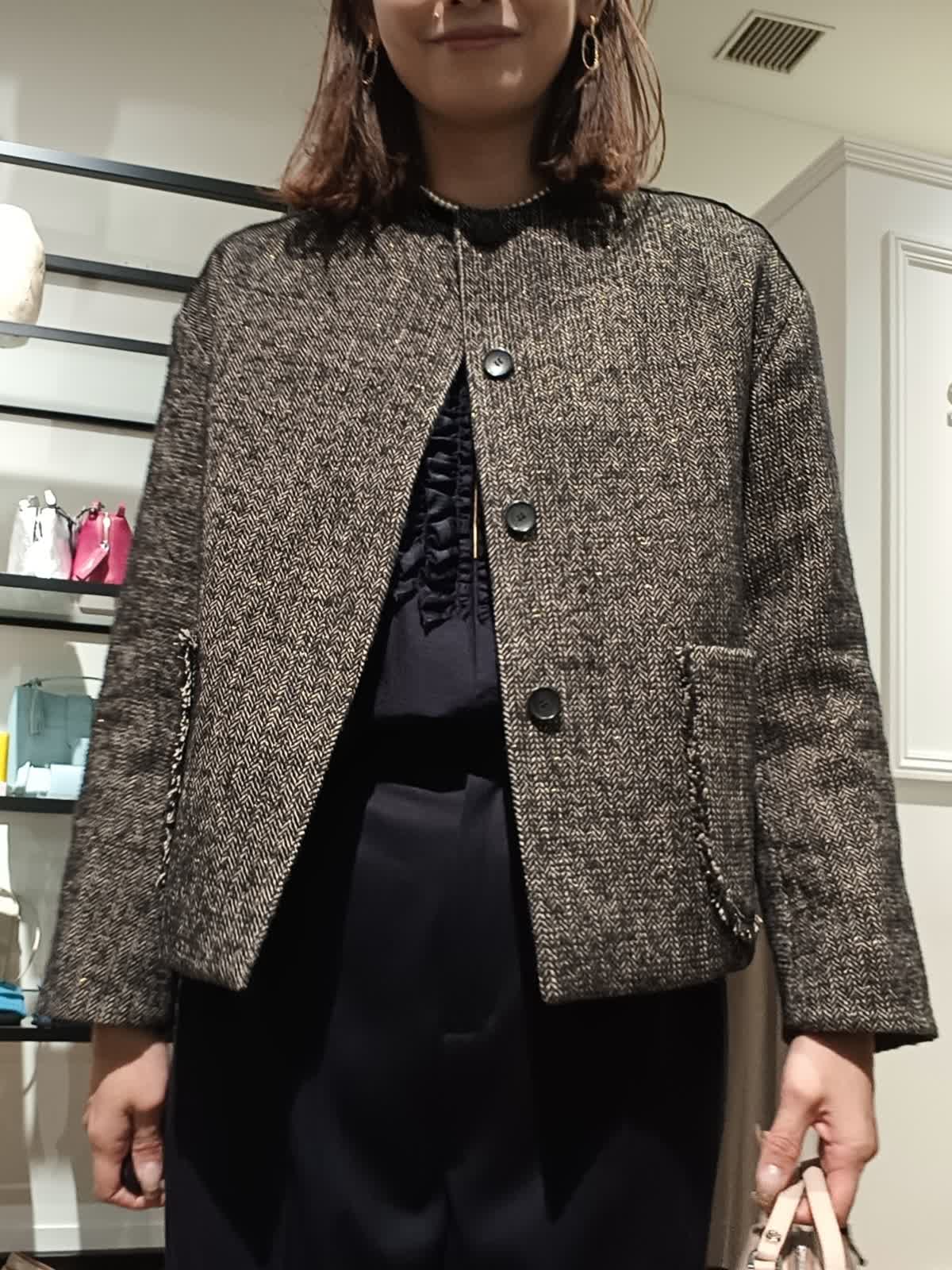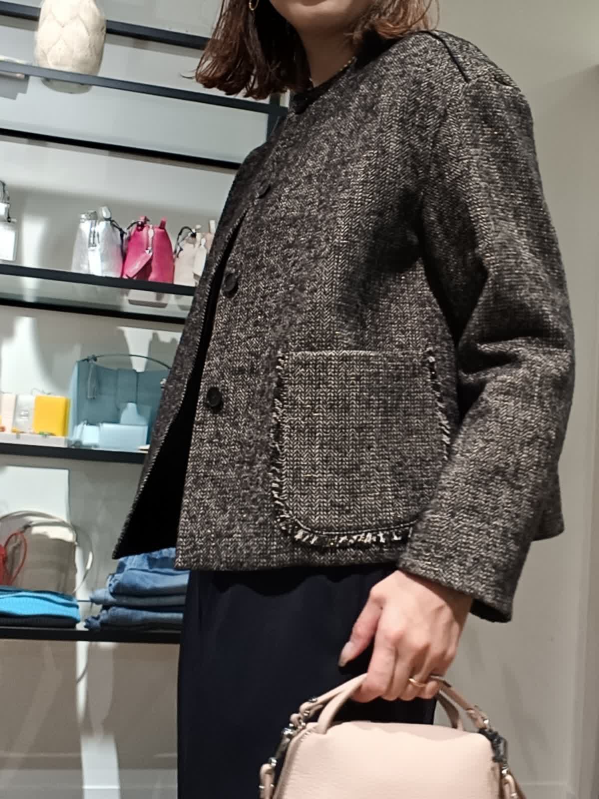 【着用サイズ:カラー】コート:9号:ブラック カットソー:9号:ブラック 少しラメ入りのツィードショートコートは、ジャケットとコートの間のような質感となっており、アウターとしてもジャケットとしても着られる1枚。オンオフ使える優秀な羽織です。 ドロップショルダーになっており、着心地も楽で、大きめのポケットもキレイめになりすぎないポイントになっています。