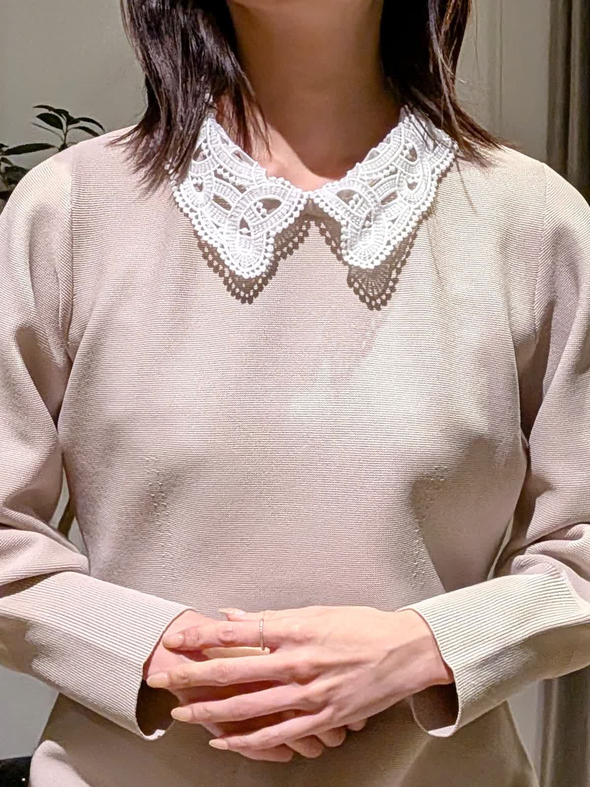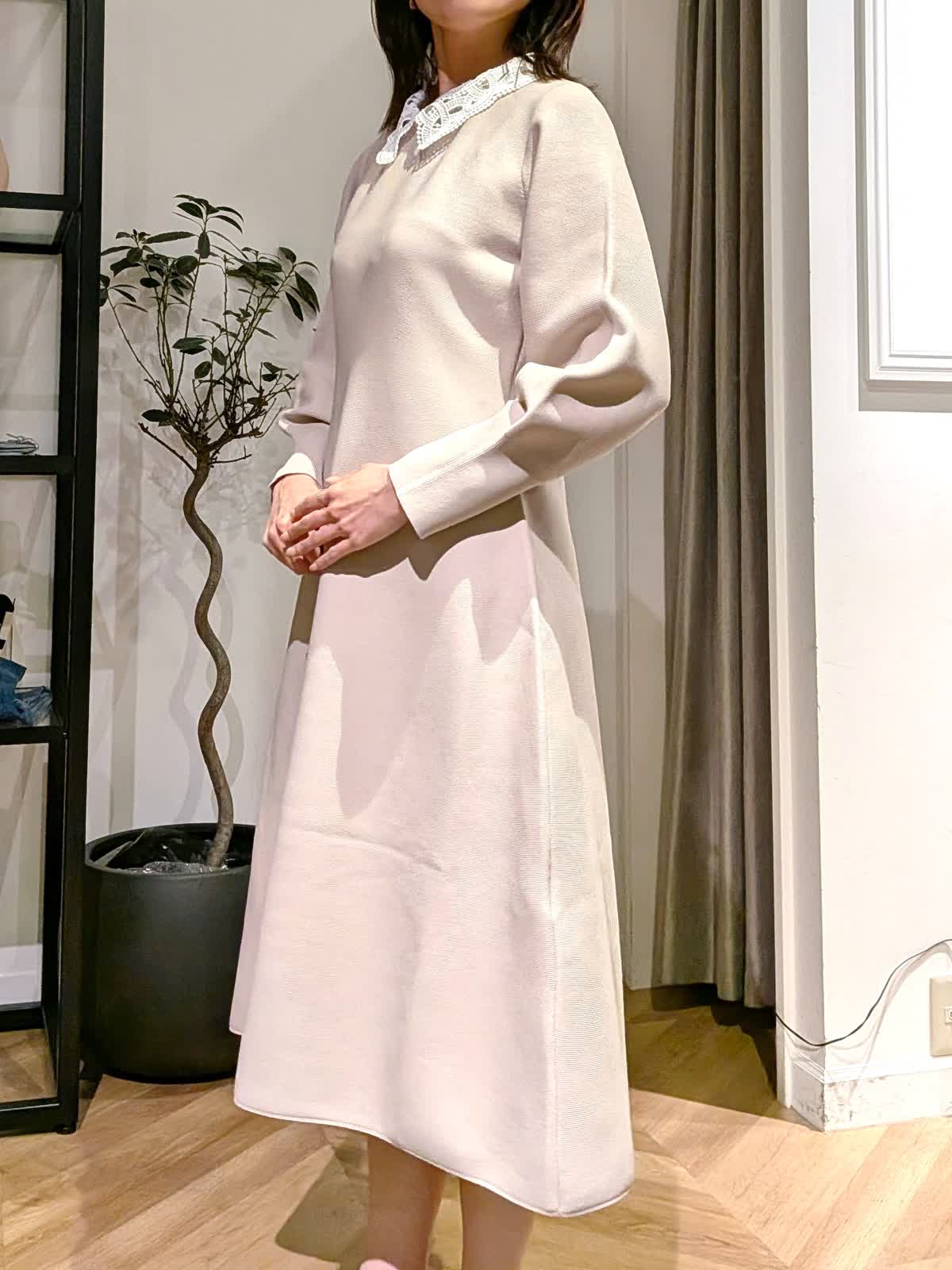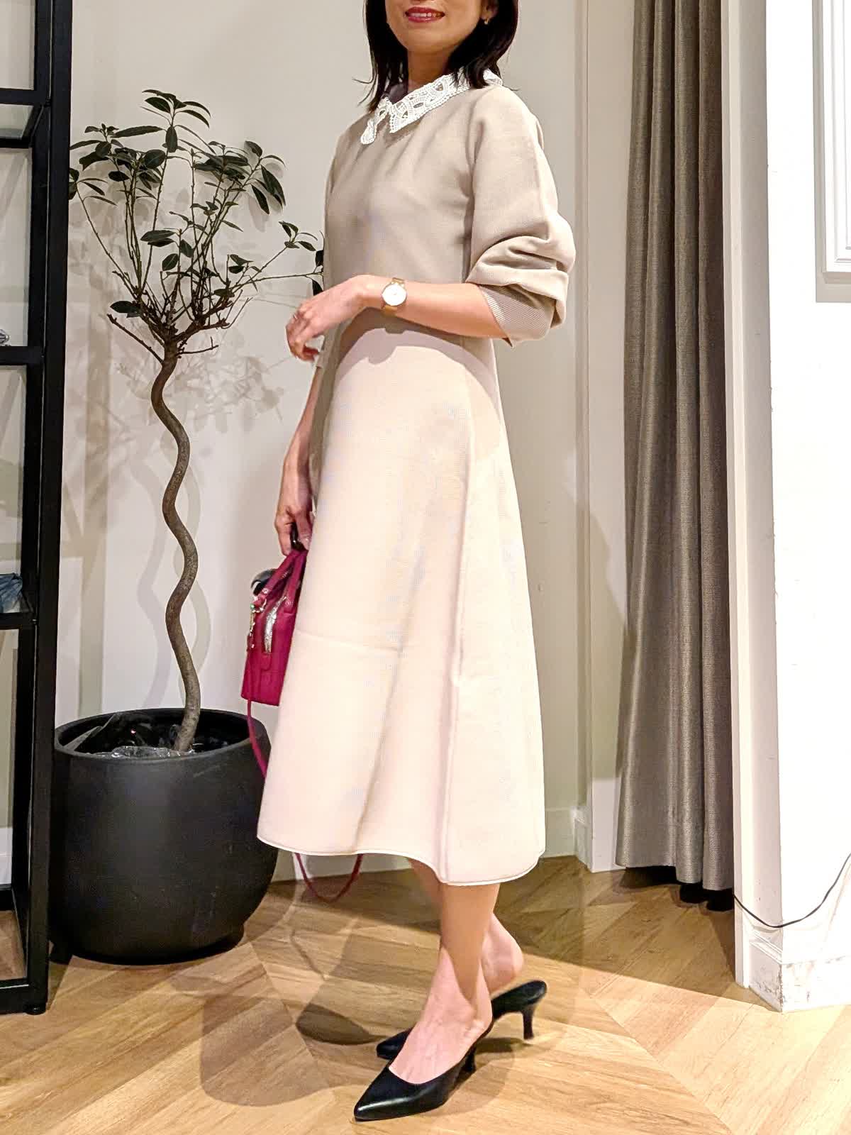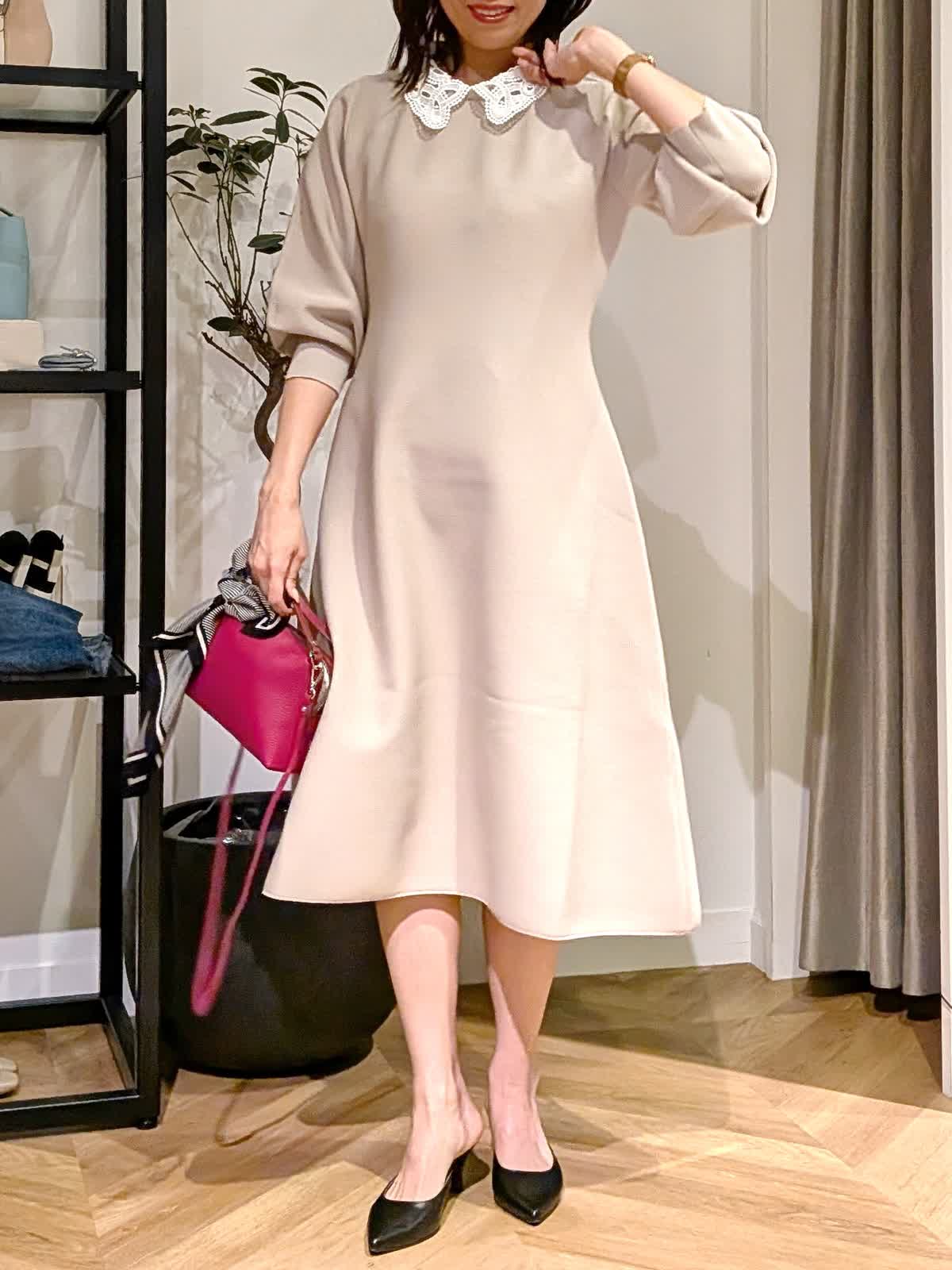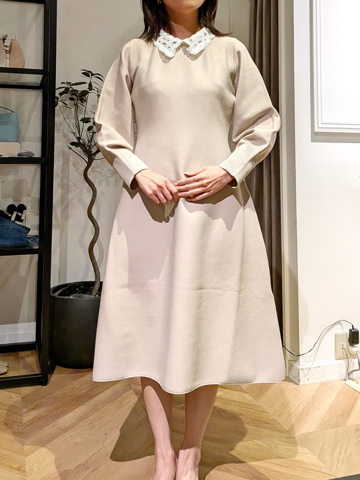 【着用サイズ】ワンピース?ベージュ?9号 襟の取り外しのできるフットアンドフレアシルエットワンピース。ニットワンピースですが生地がしっかりしているので体のラインが出にくく伸縮性も抜群。ニットとは思えない上品な表情を楽しめます。 袖口の絞りもポイントでお袖デザインのボリュームがエレガントに。 イベント事やキチンとした席でもお使いいただけます。