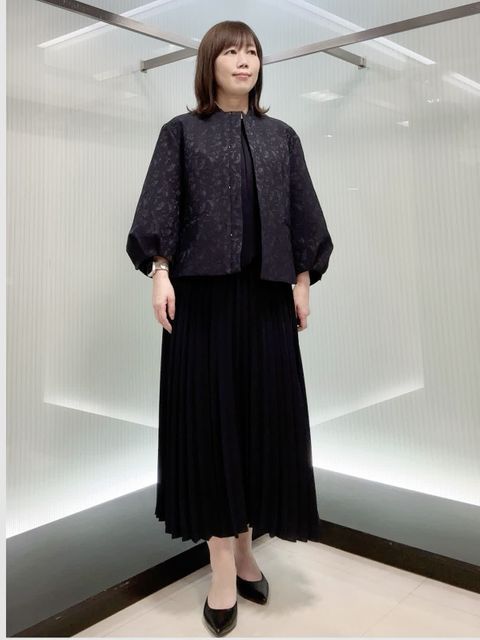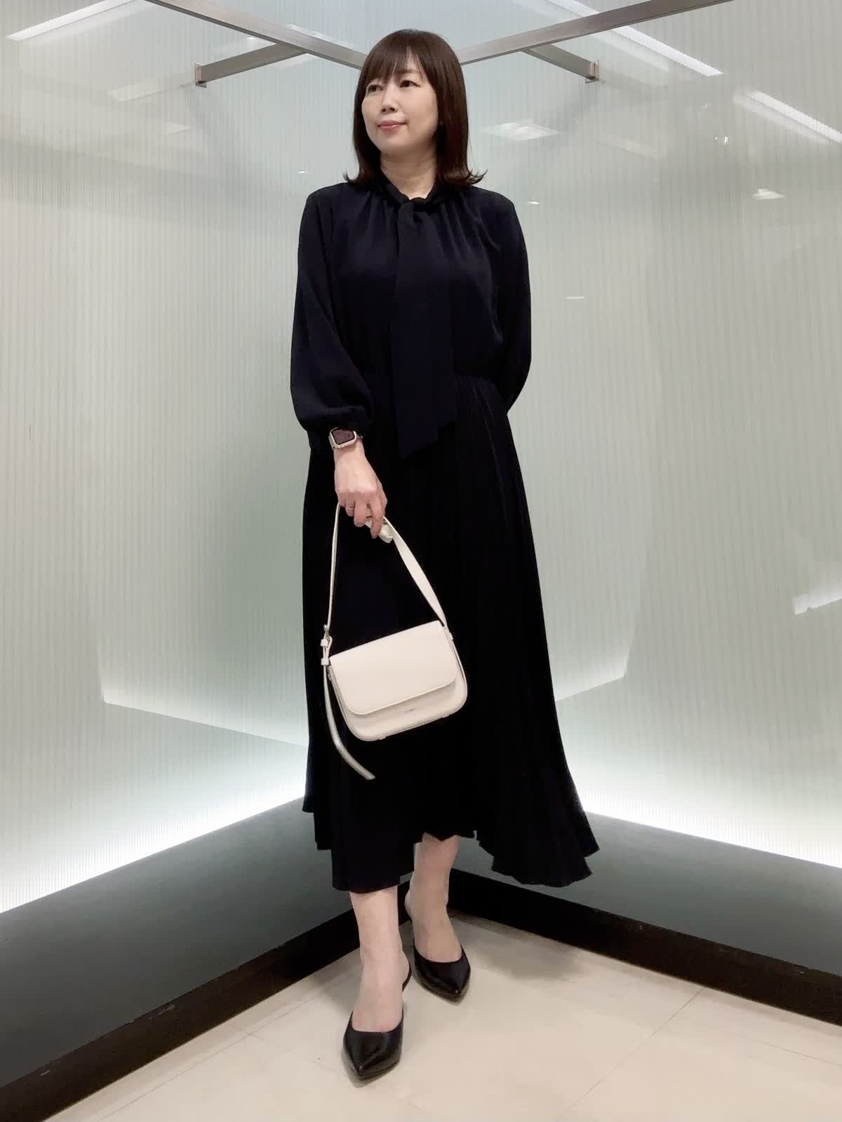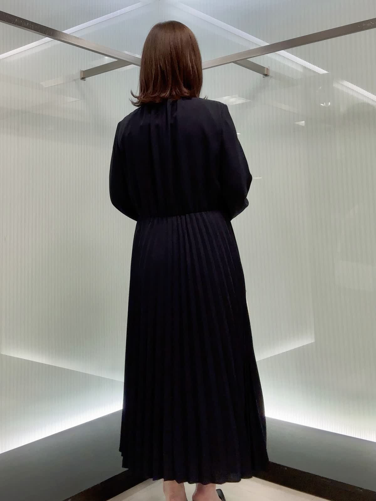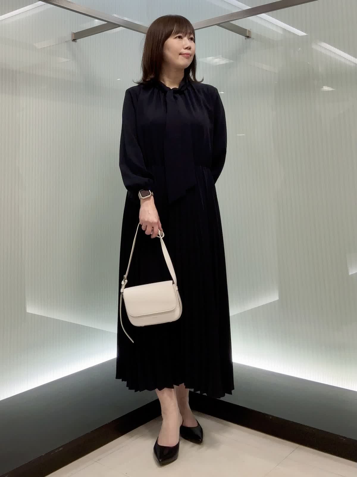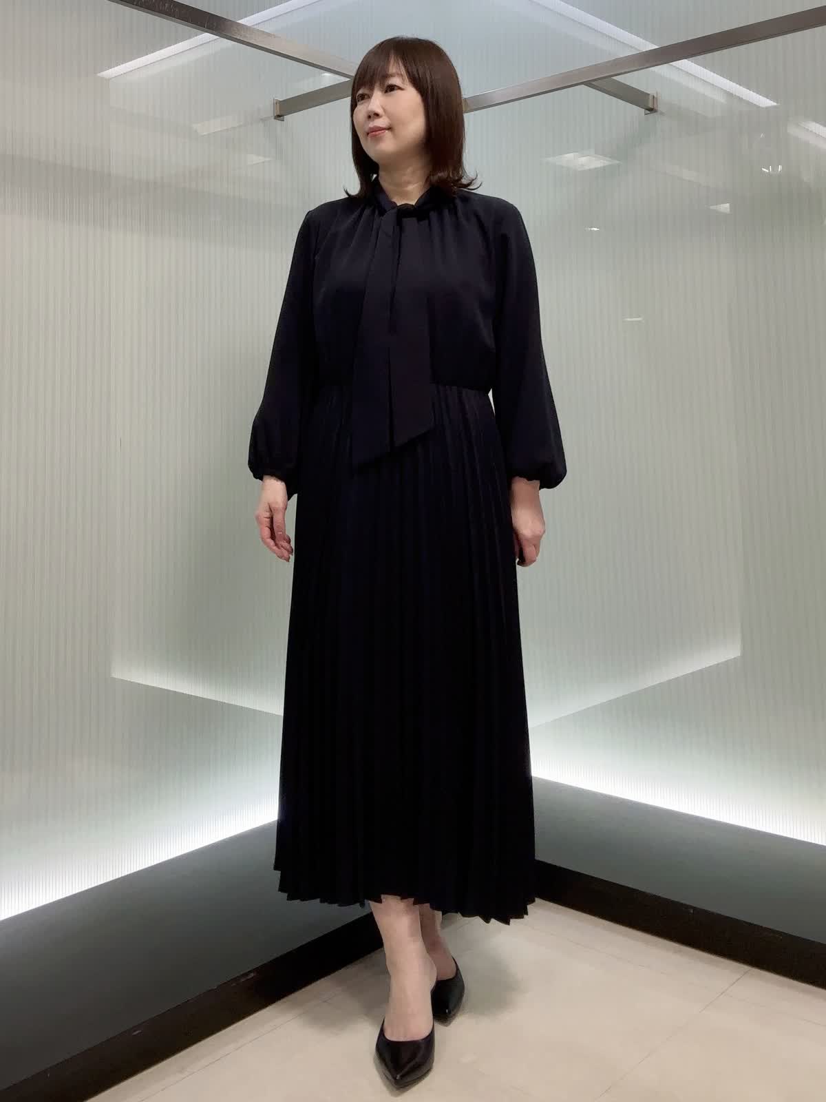 【着用サイズ】9号 上品な梨地ジョーゼットのボウタイ付きプリーツワンピース。 揺れ感のあるプリーツが華やかで、きちんと見えも◎ ウエストはゴム仕様で楽な着心地なのに、上品さはしっかりあります。 シワになりにくく、シーズンレスで活躍します。