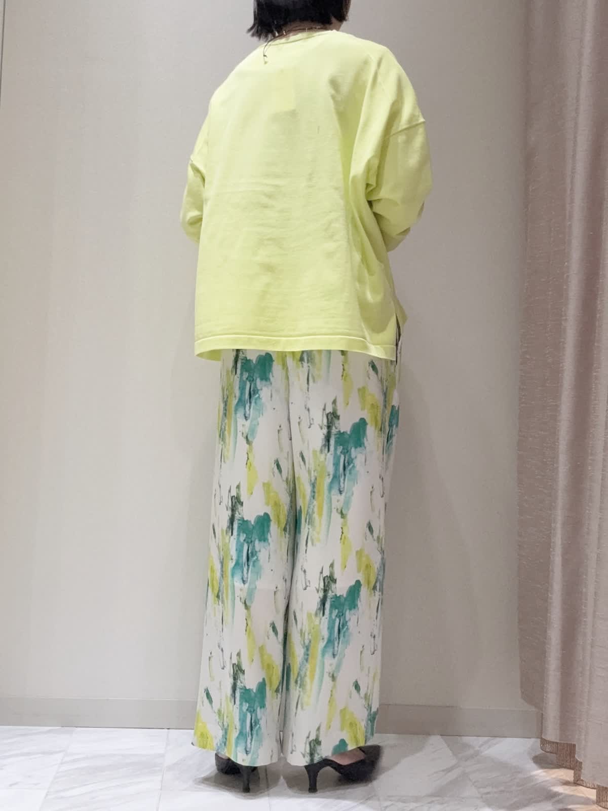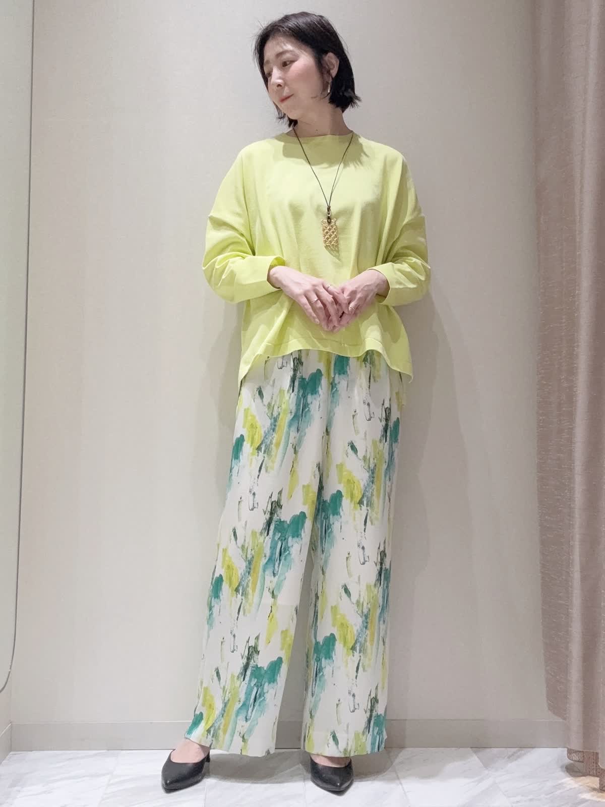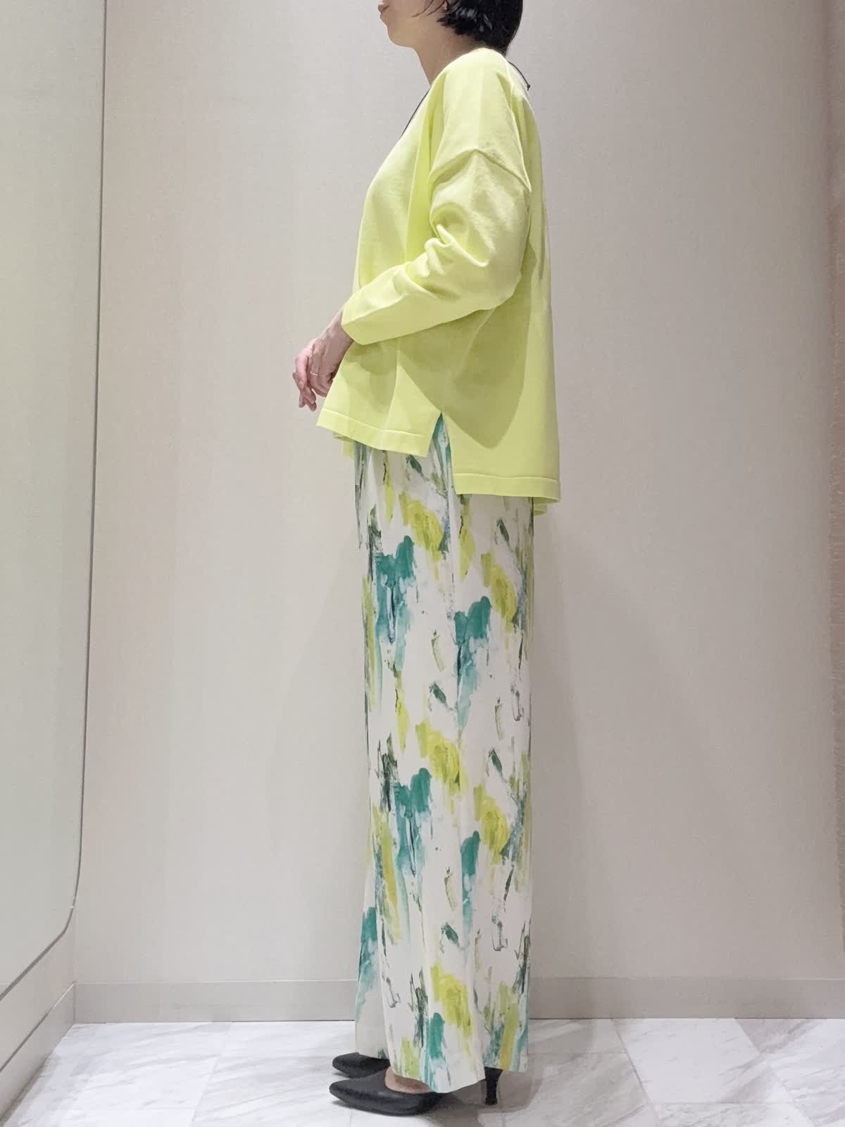 【着用サイズ】全て:9号 【着用カラー】ニット: ビビットイエロー パンツ: 柄 たっぷりとしたサイジングで一枚でもこなれ感を演出できる大人ニット。キレイ見えする表情と、ほどよい厚み、ハリ感が特徴的なニットで、オーバーサイズに袖付けをドロップショルダーにすることで抜け感を演出しています。また、サイドスリット入りのデザインなので、裾のアレンジが効き様々なコーディネートを楽しんでいただけます。