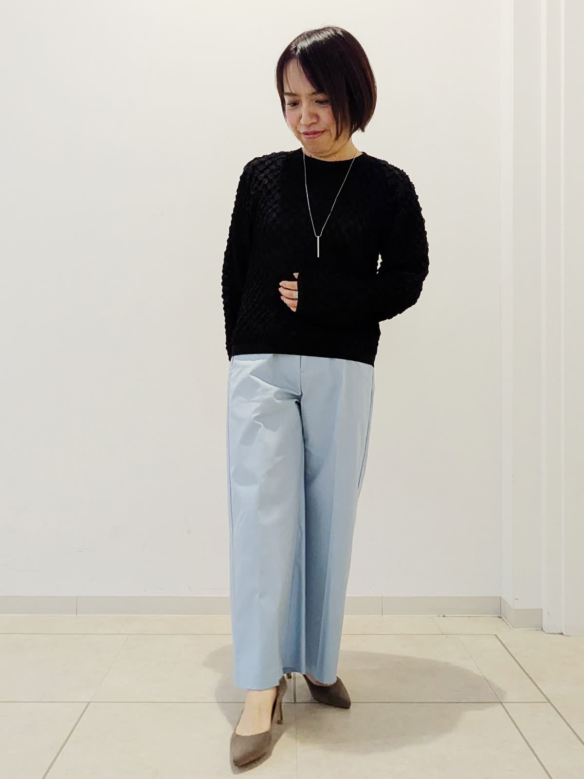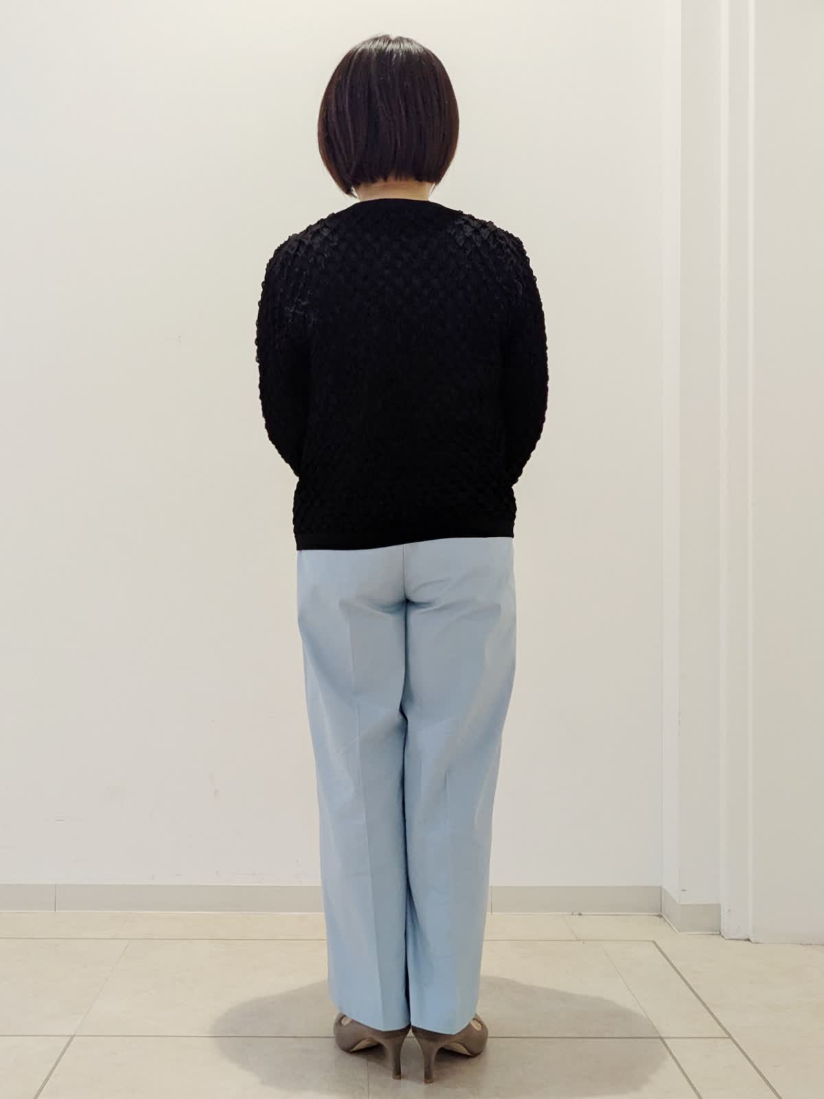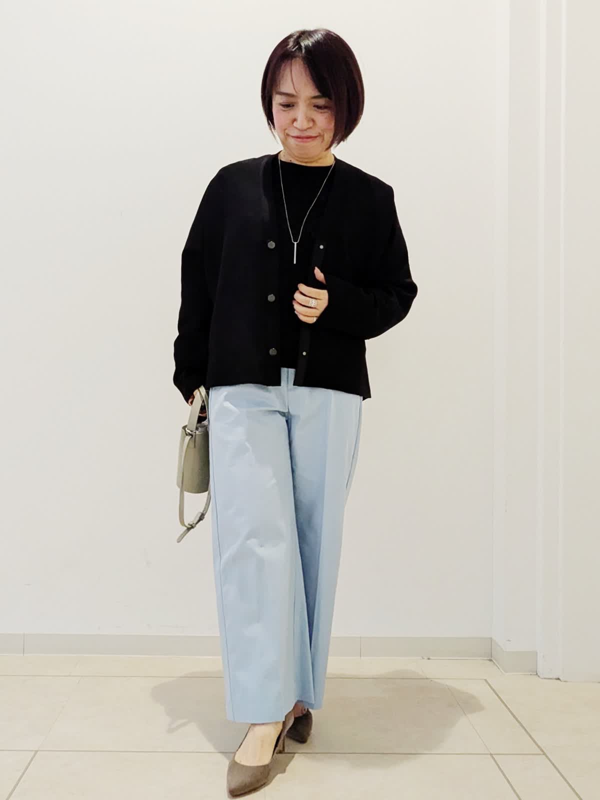 【着用サイズ】カーディガン:フリー ニット:フリー パンツ:7号【着用カラー】カーディガン:ブラック ニット:ブラック パンツ:ブルー 春の通勤コーデです。トップスは同シリーズでアンサンブルとしてお使いいただけます。カーディガンはドルマンスリーブで前のボタンがかわいい。ニットはジャガード編みで伸縮性があり、シアー感がポイントです。パンツはワイドクロップドパンツ。私の身長でもお直しなしで着用できます。