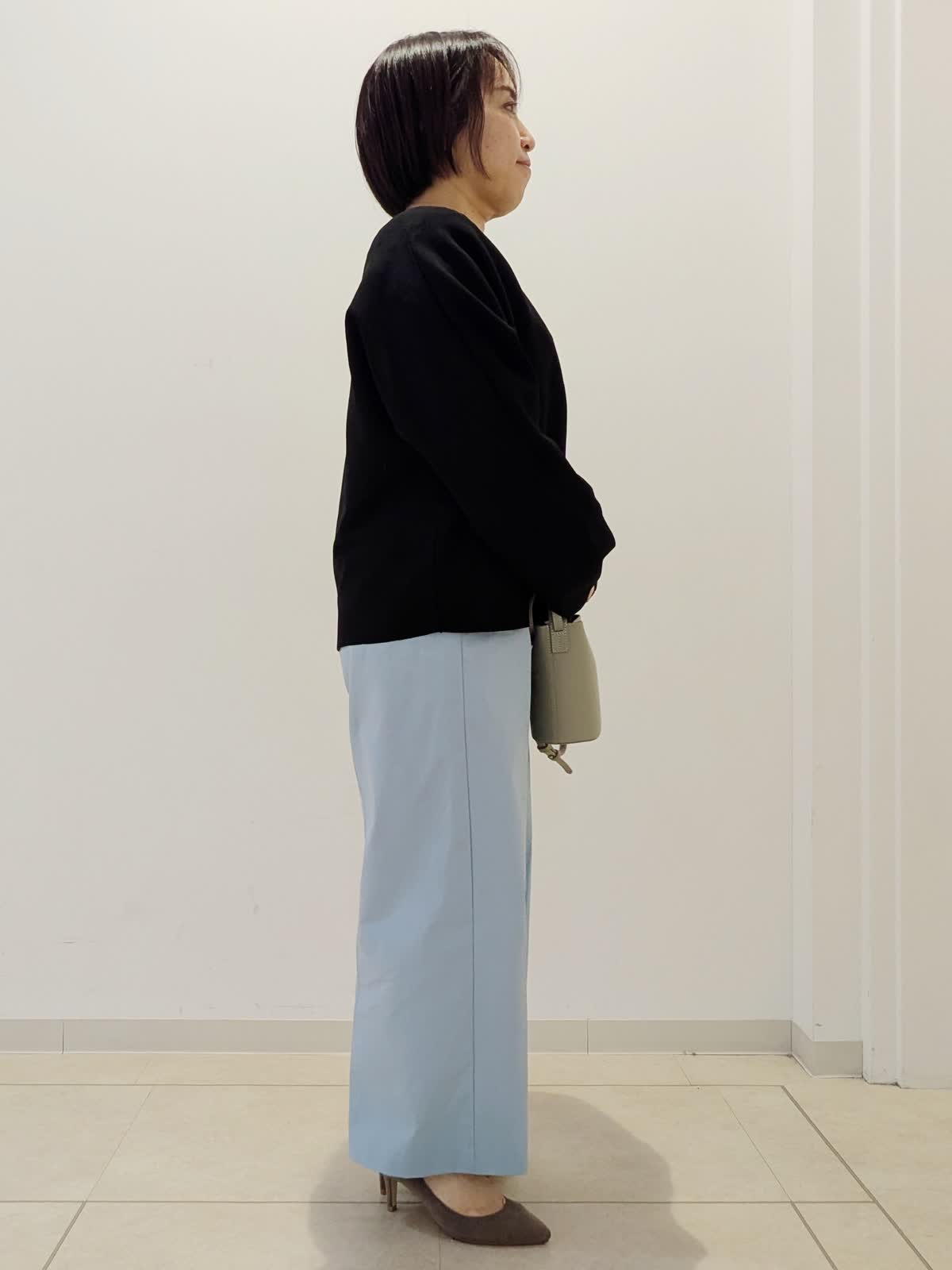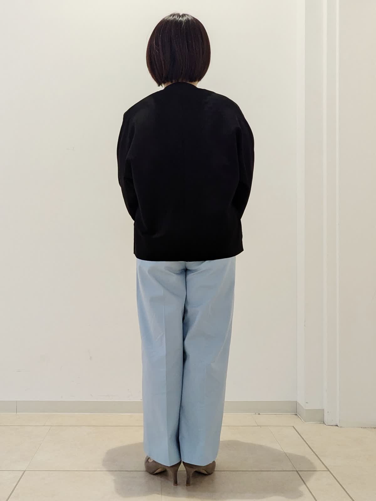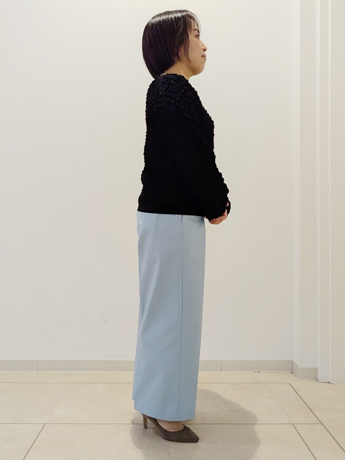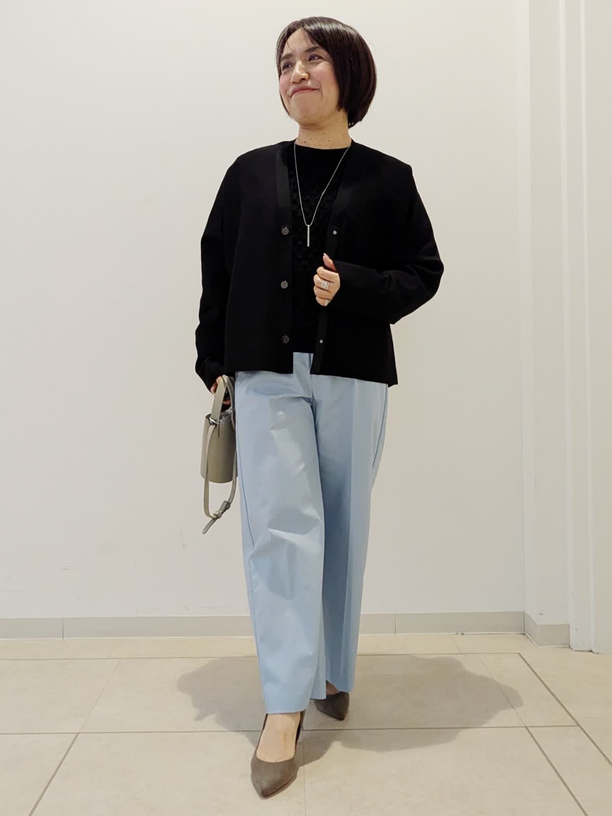 【着用サイズ】カーディガン:フリー ニット:フリー パンツ:7号【着用カラー】カーディガン:ブラック ニット:ブラック パンツ:ブルー 春の通勤コーデです。トップスは同シリーズでアンサンブルとしてお使いいただけます。カーディガンはドルマンスリーブで前のボタンがかわいい。ニットはジャガード編みで伸縮性があり、シアー感がポイントです。パンツはワイドクロップドパンツ。私の身長でもお直しなしで着用できます。