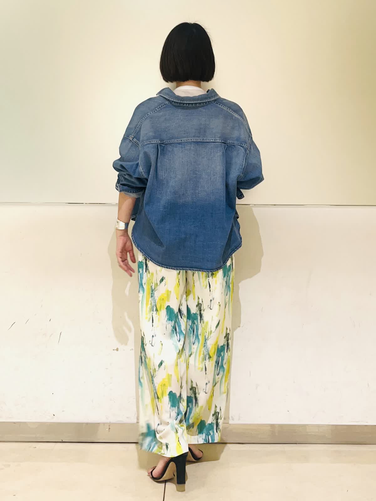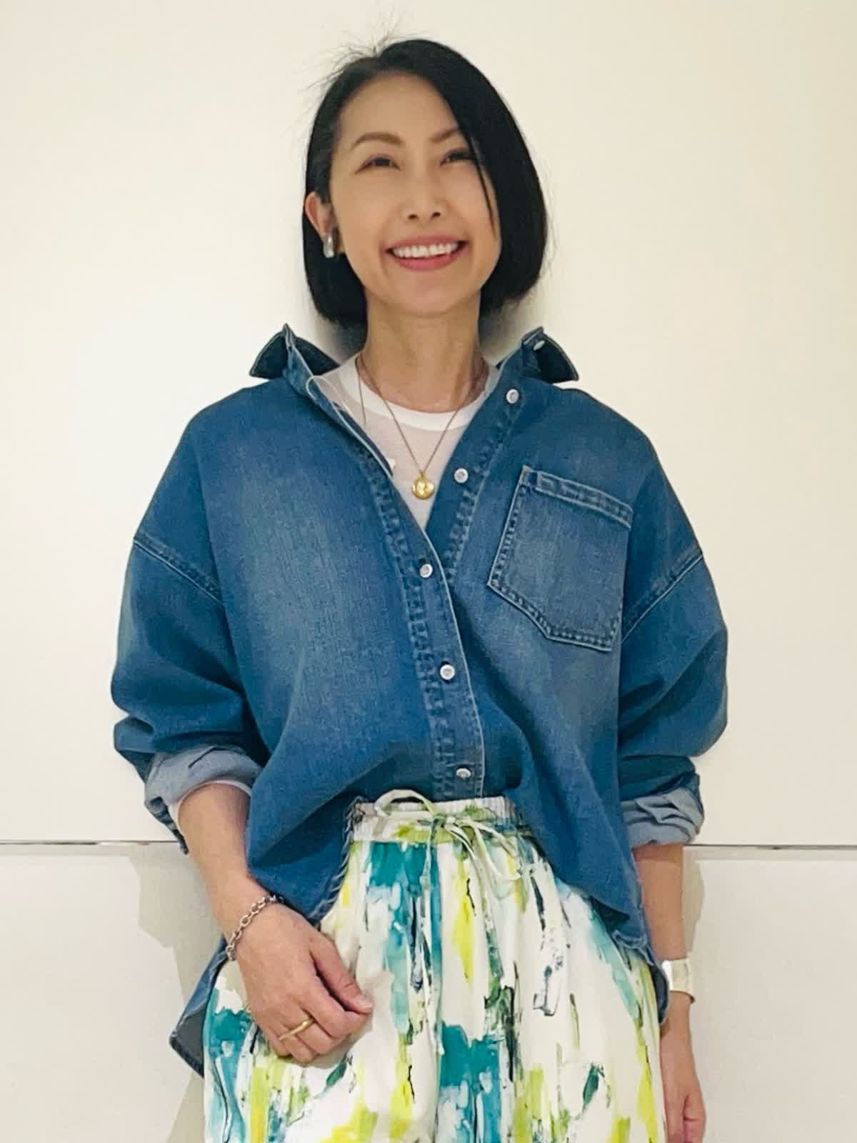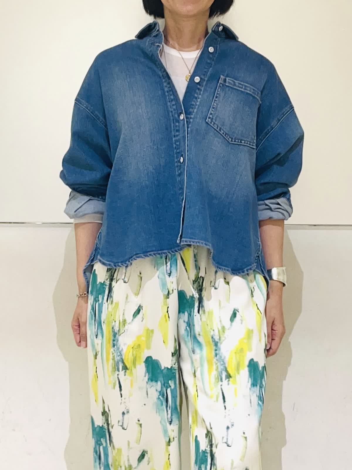 【着用アイテム】すべて9号 【着用カラー】シャツ:インディゴ カットソー:オフホワイト パンツ:ペパーミント 1枚でも羽織りにも使える万能デニムシャツ。柔らかなデニム生地でとても着心地が良いです。ややゆとりのあるオーバーサイズで、ラフに羽織りとして着ても可愛いです。短め丈なのでインしなくてもすっきりしたシルエットで着られます。