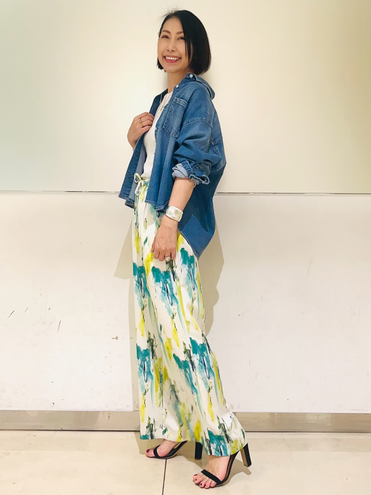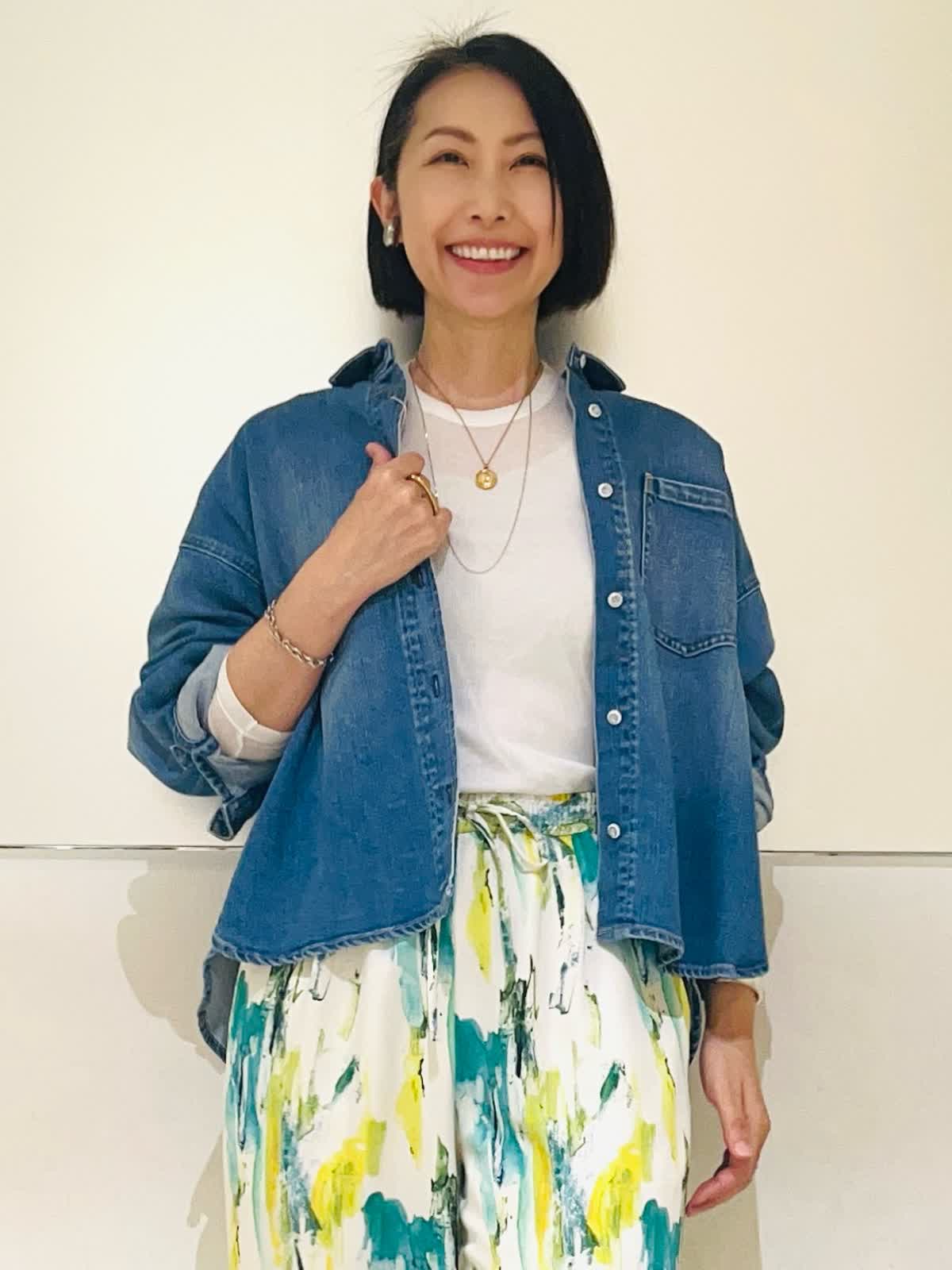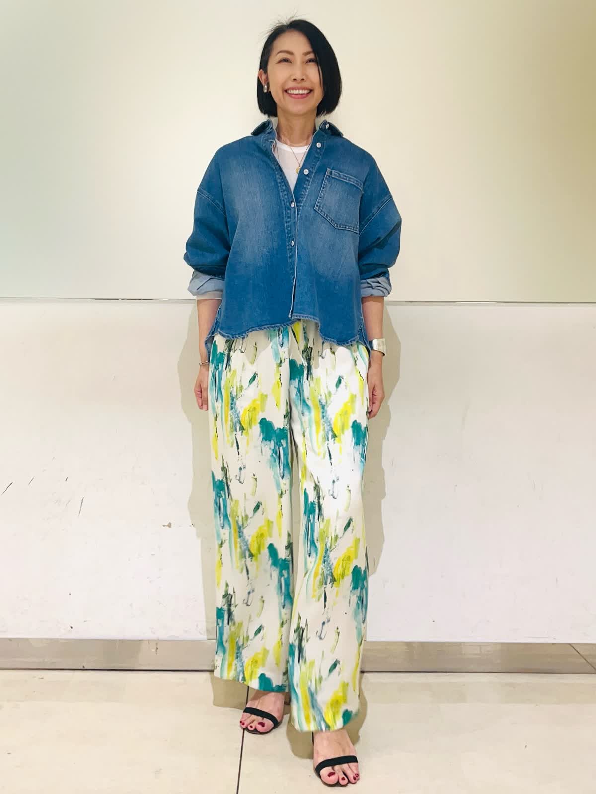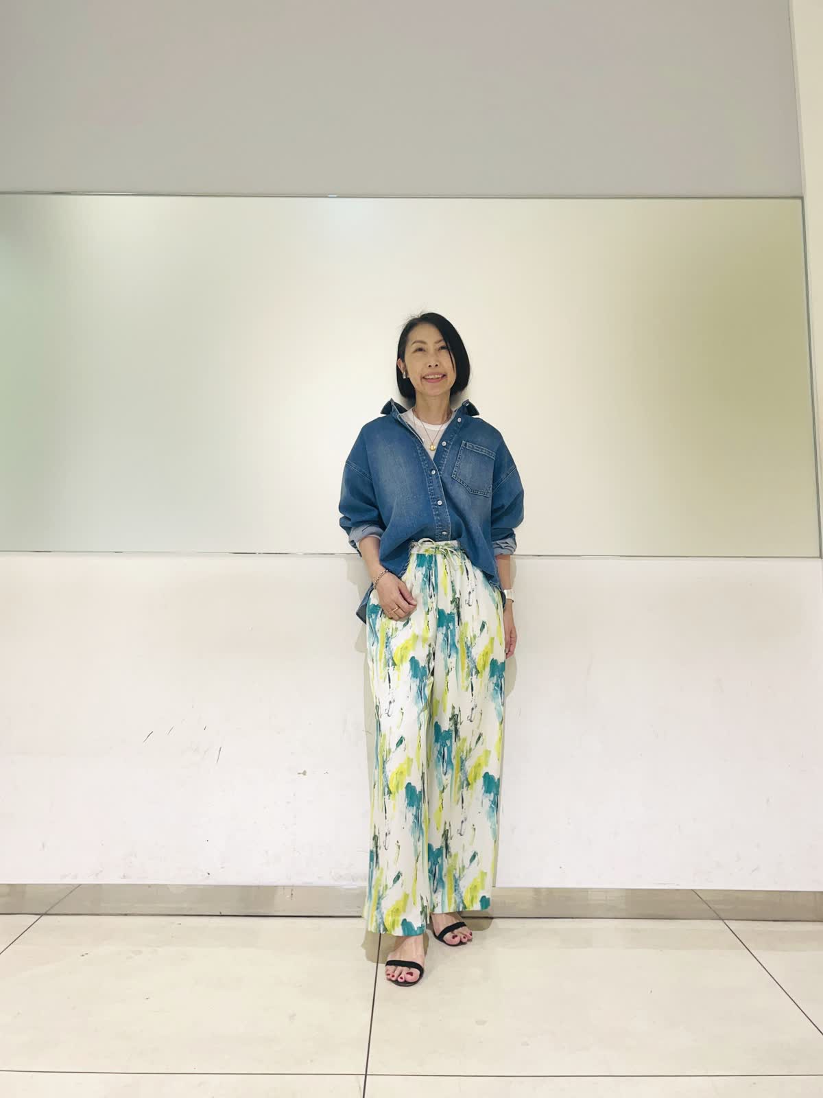 【着用アイテム】すべて9号 【着用カラー】シャツ:インディゴ カットソー:オフホワイト パンツ:ペパーミント 1枚でも羽織りにも使える万能デニムシャツ。柔らかなデニム生地でとても着心地が良いです。ややゆとりのあるオーバーサイズで、ラフに羽織りとして着ても可愛いです。短め丈なのでインしなくてもすっきりしたシルエットで着られます。