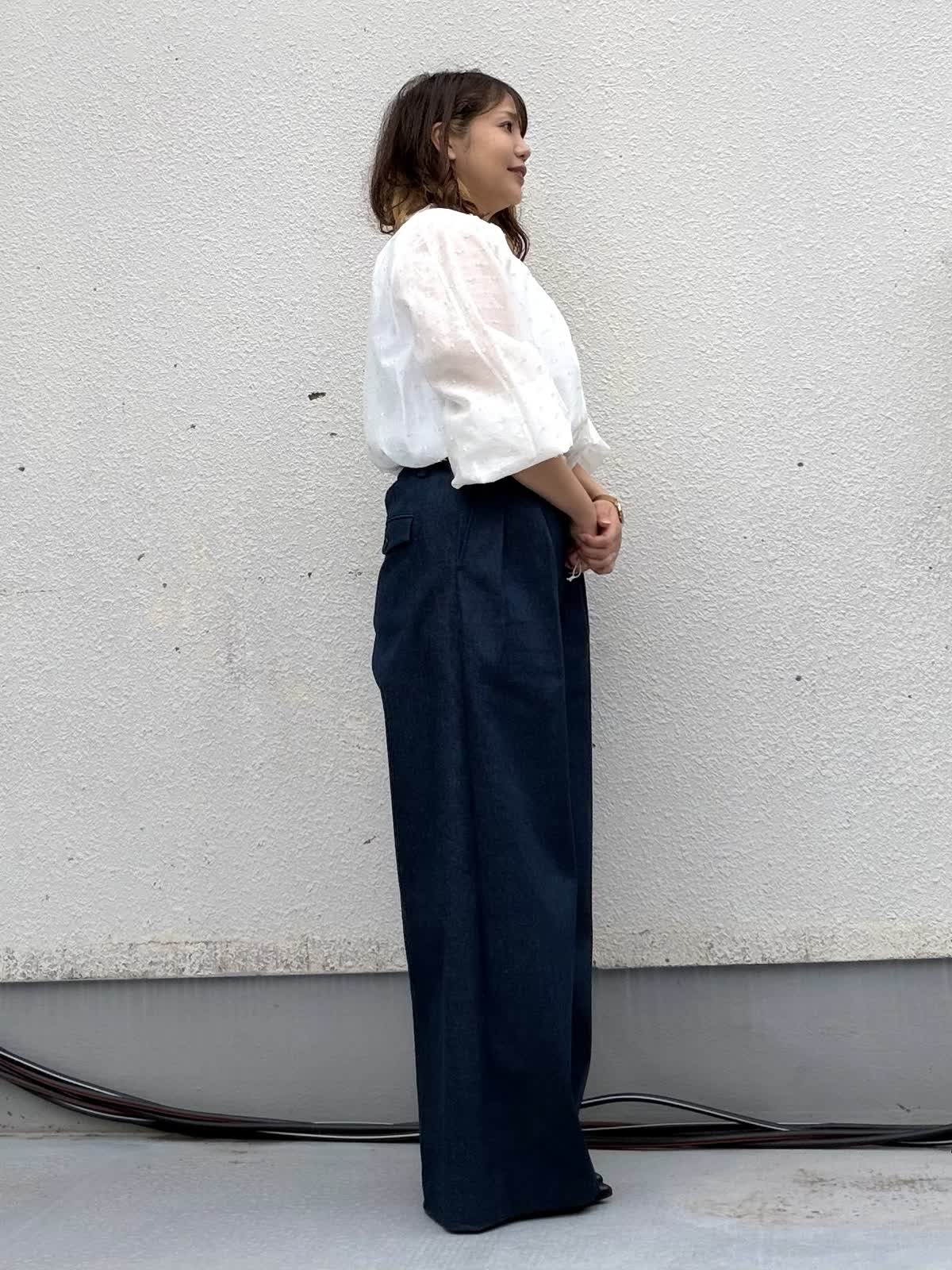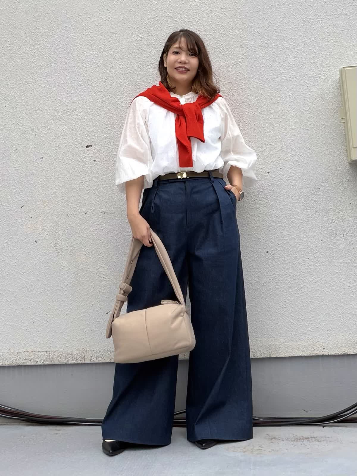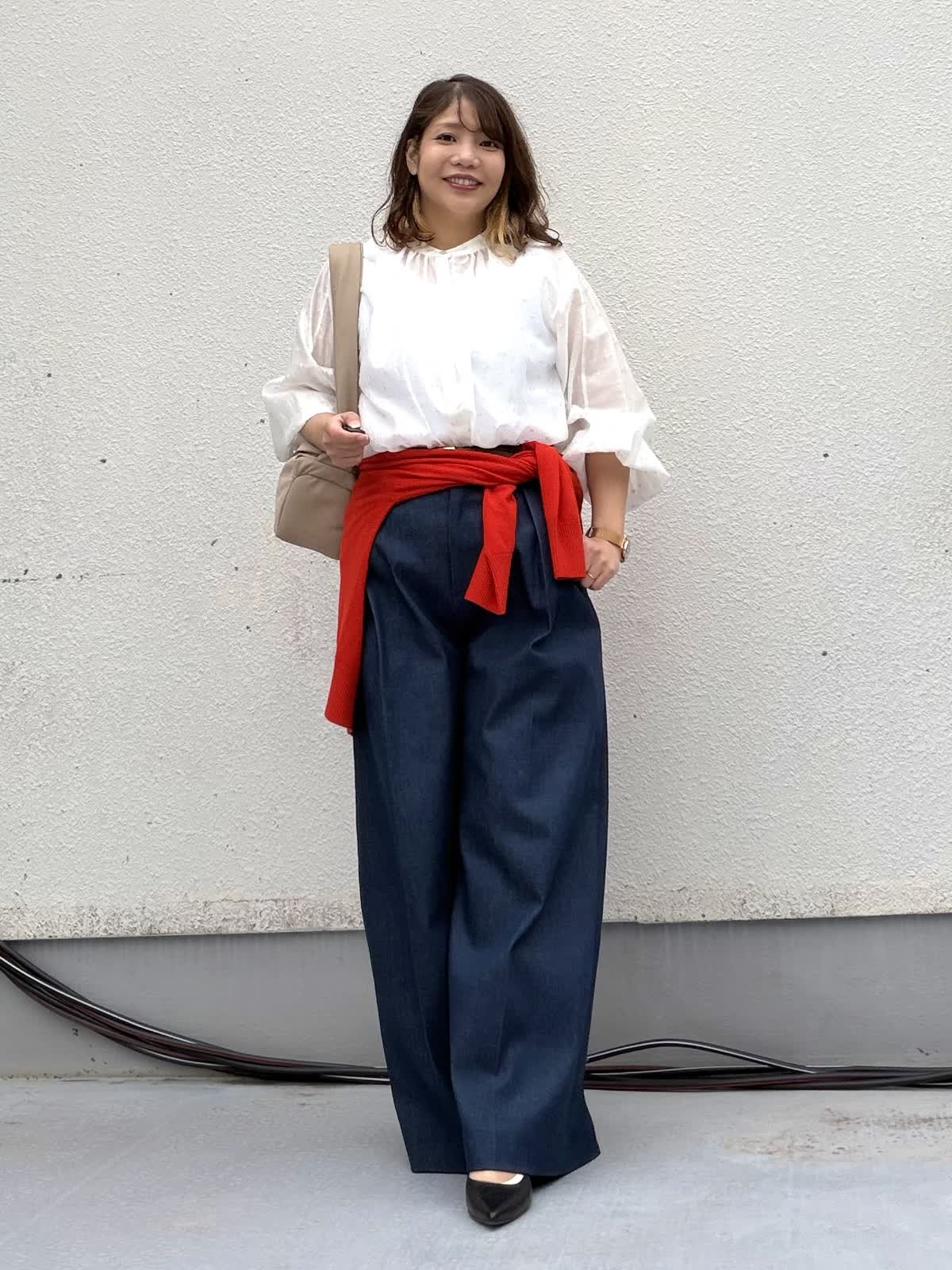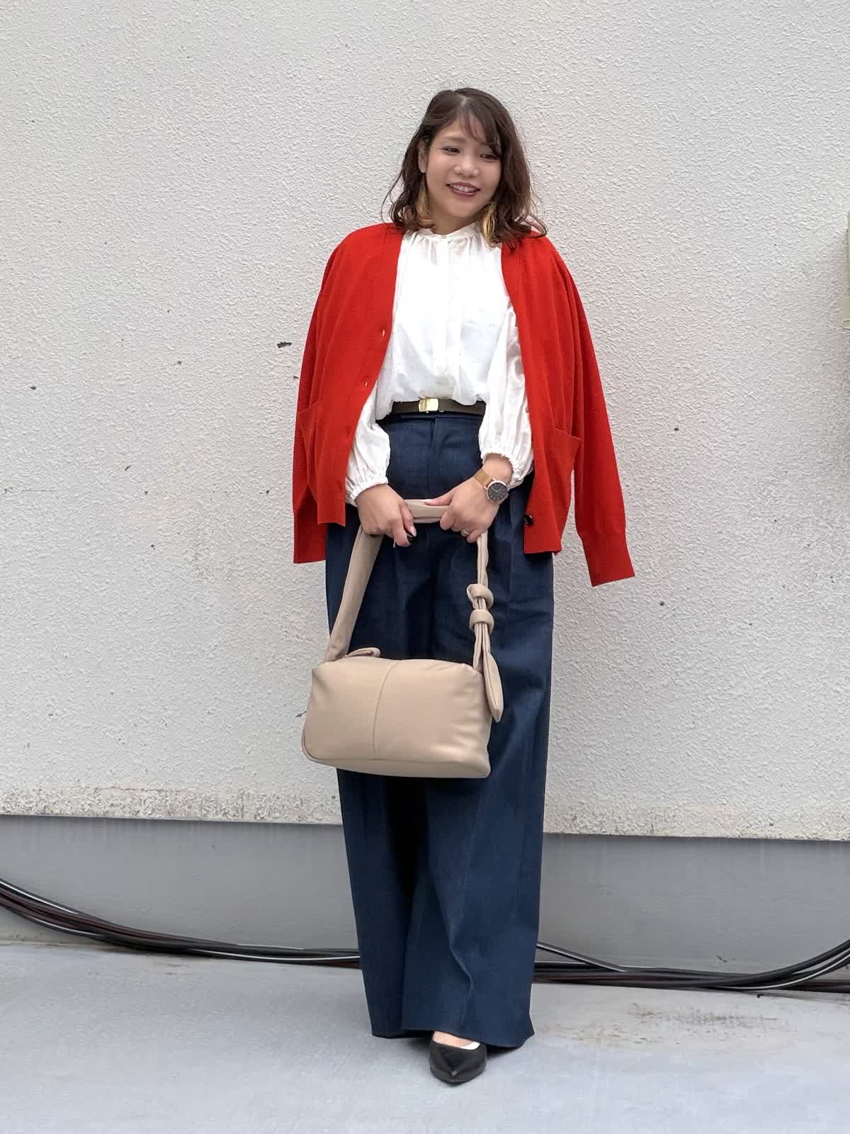 【着用アイテム:カラー/サイズ】 カーディガン:シュイロ/9号 ブラウス:オフホワイト/9号 パンツ:ダークネイビー/9号 ボリューム袖ブラウスは、程よい透け感で春らしさを演出。顔まわりを明るく見せ、女性らしい優しい印象に仕上げてくれます。 パンツはタック入りのワイドシルエット。 腰位置を高く見せてくれるハイウエストデザインで、脚長効果も抜群。ゆったりとしたラインながら、落ち感のある素材でスッキリとした印象に。 アクセントに鮮やかなレッドのニットをウエストに巻きました。