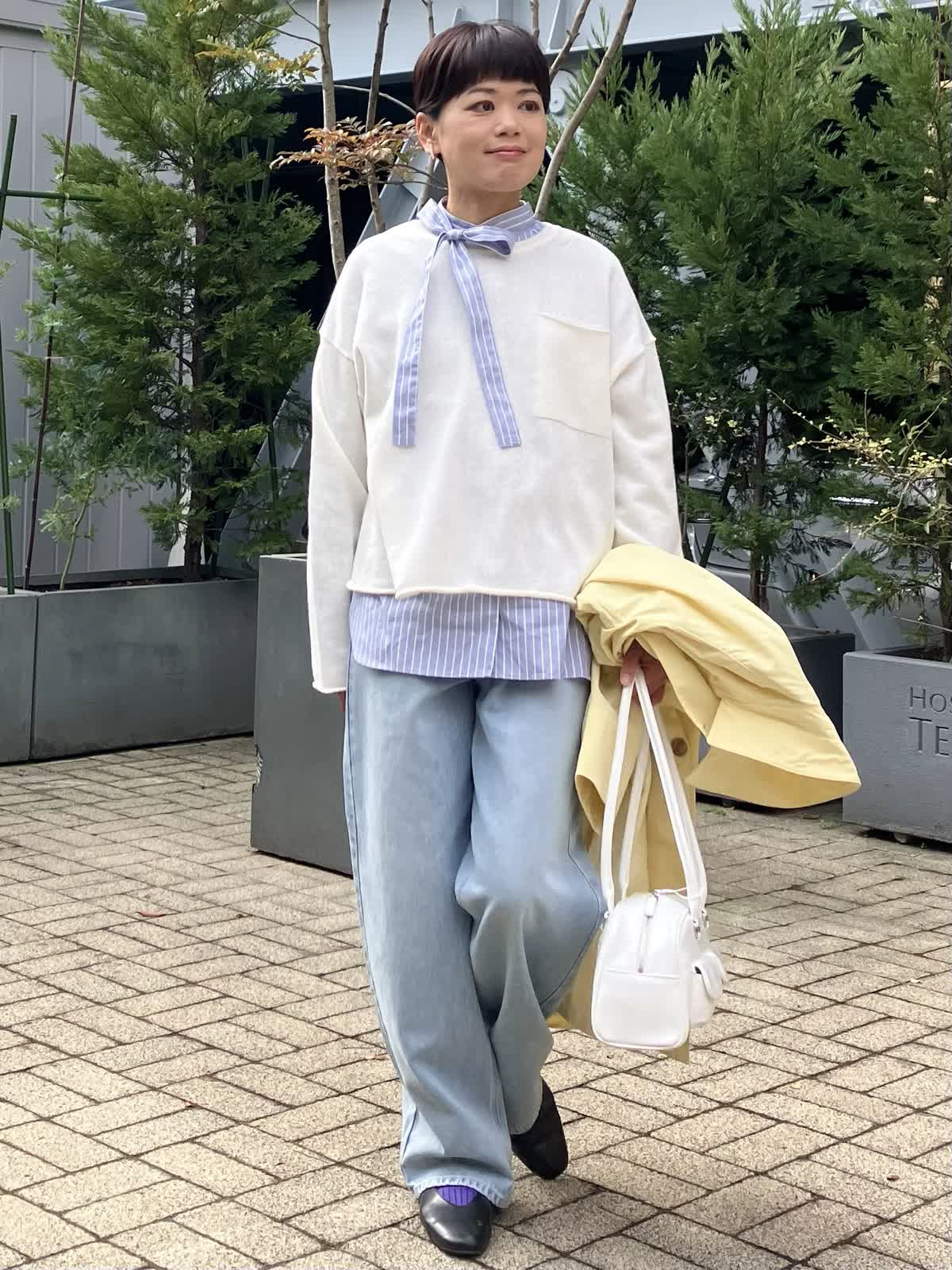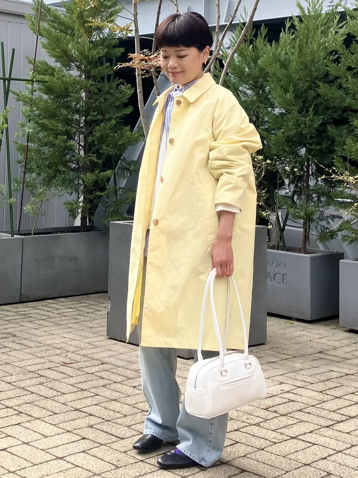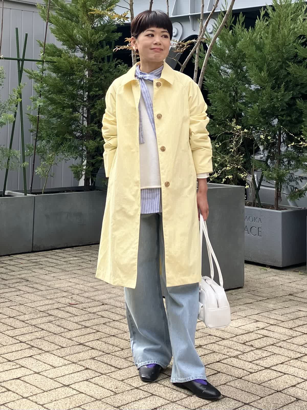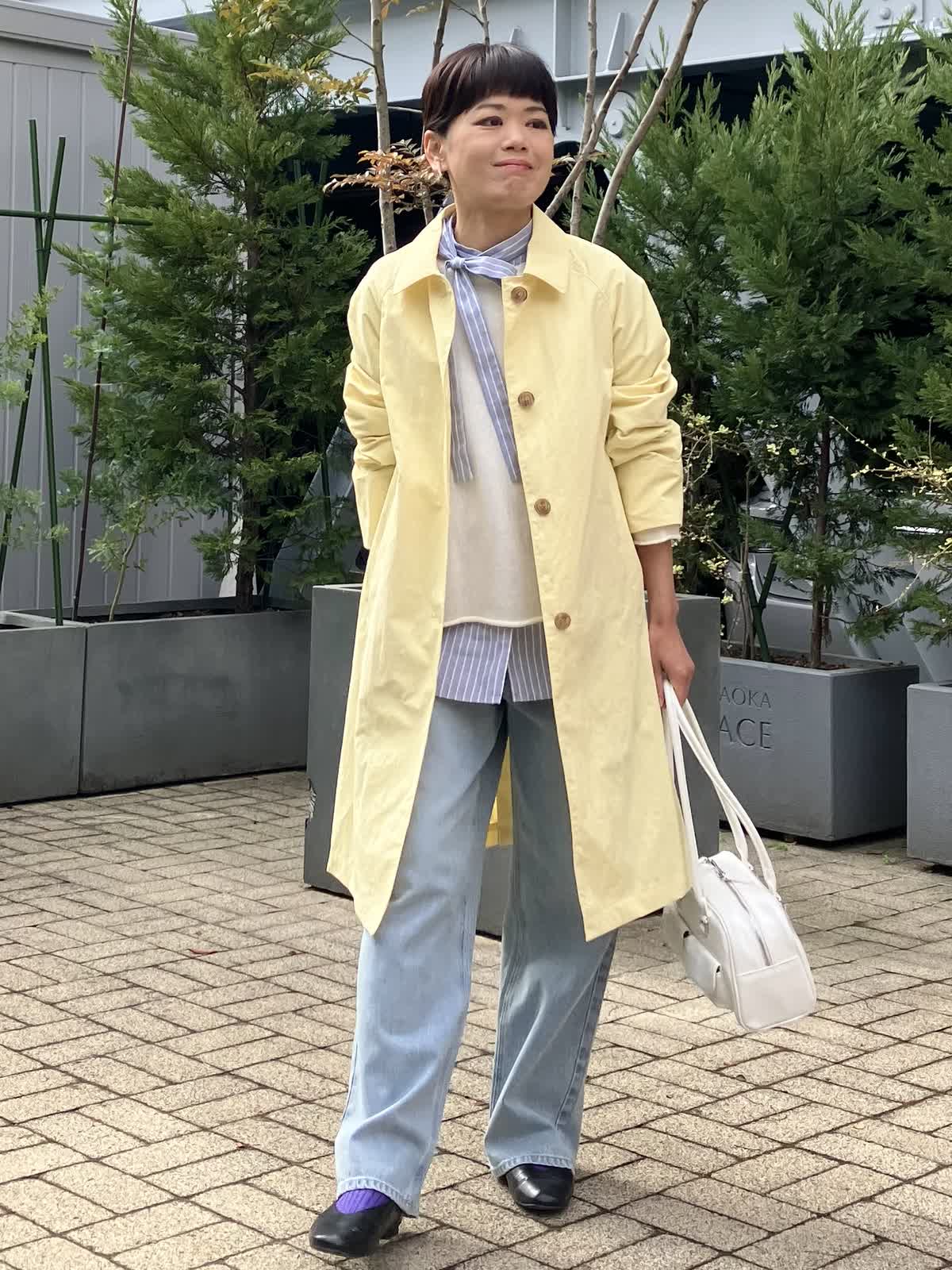 【着用サイズ/カラー】 コート:9号/イエロー ニット:フリー/オフホワイト ブラウス:フリー/ストライプ デニム:9号/サックス シャツ×ニットの重ね着は春、秋、冬と3シーズンで欠かせない定番のスタイルです。 今期のデニムはとーってもしなやかな穿き心地が優秀です。
