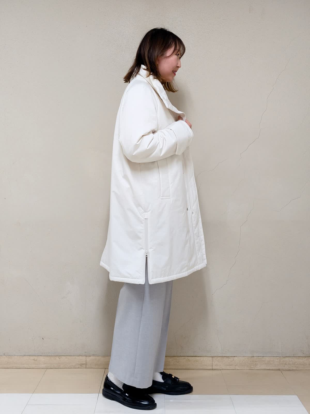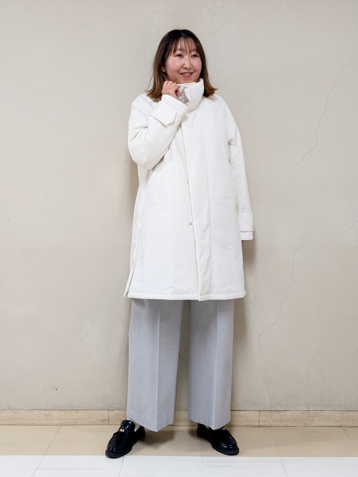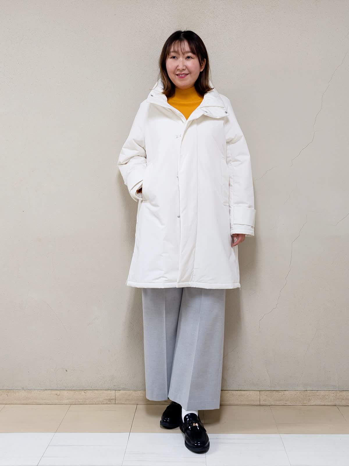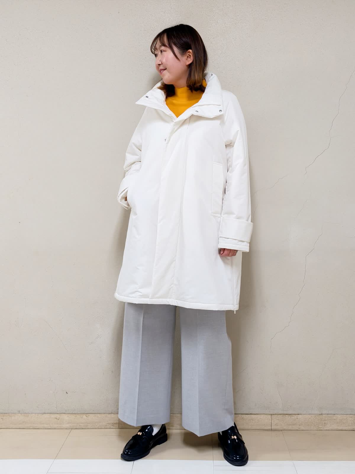 【着用サイズ】コート、ニット:フリー パンツ:11号【着用カラー】コート:アイボリー ニット:オレンジ パンツ:グレー 春先まで着られるお出掛けコーディネートです。アウターは中綿コートなので気軽に羽織れます。ジップを上まで閉めるとスタンドカラーになるので、首元まで暖かいです。中に合わせたニットはカシミヤ混で着心地が良く、差し色としてもGood!グレーベイカーパンツを合わせて明るいカラーでまとめました。