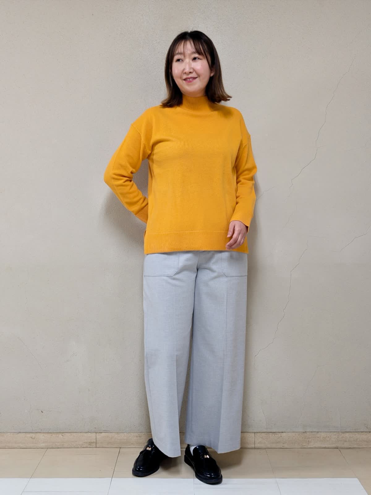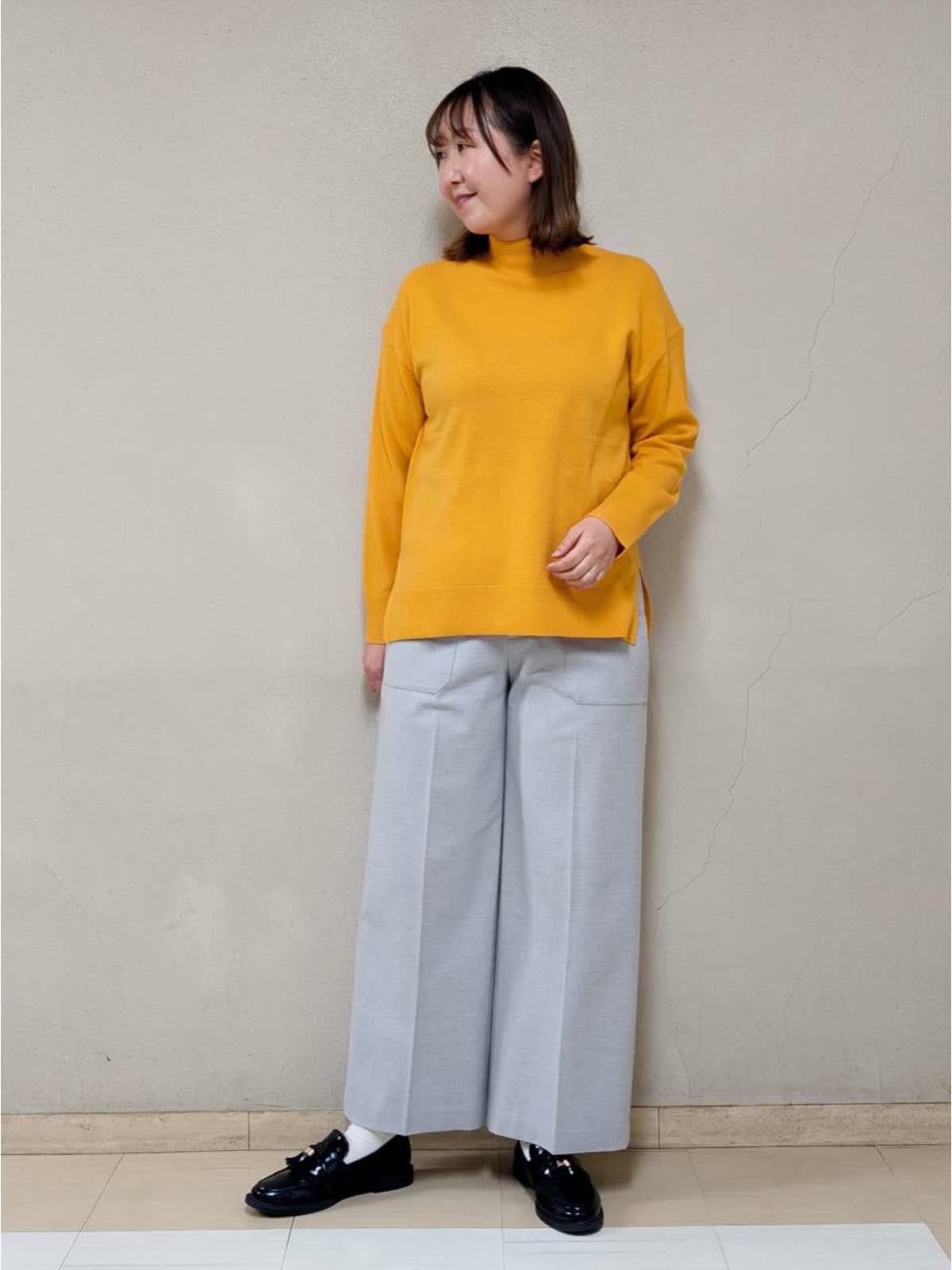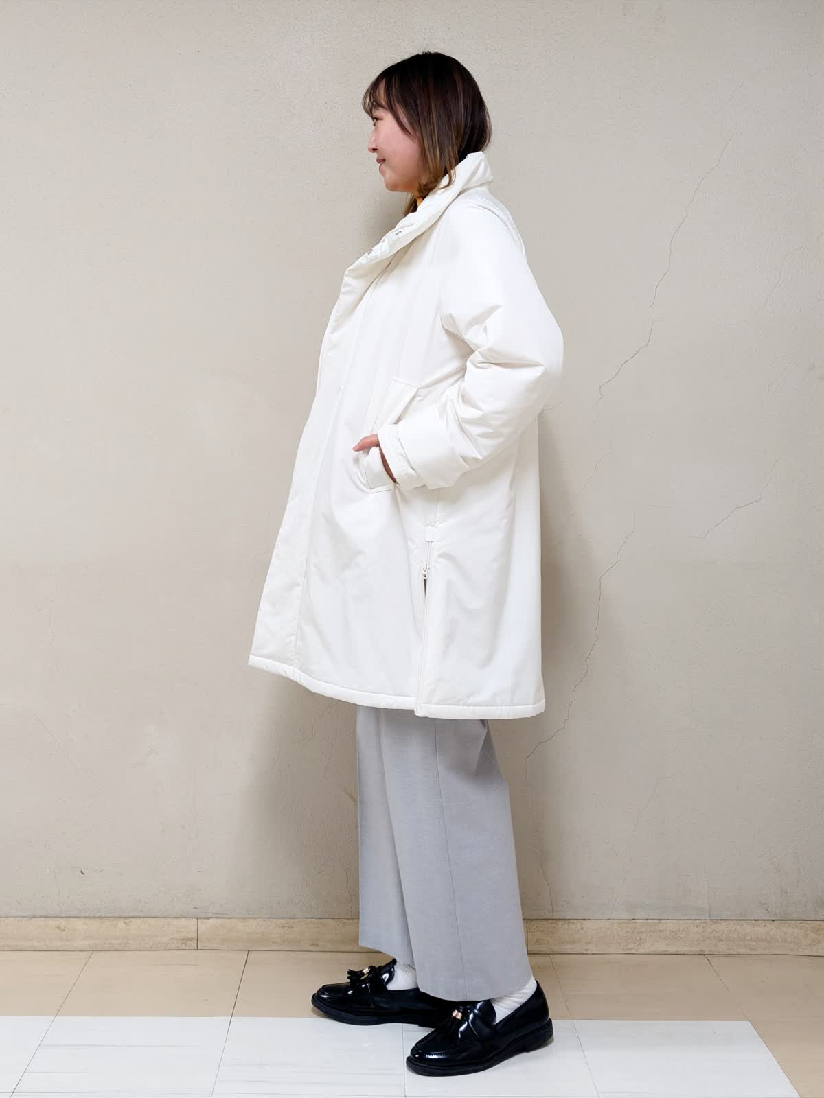 【着用サイズ】コート、ニット:フリー パンツ:11号【着用カラー】コート:アイボリー ニット:オレンジ パンツ:グレー 春先まで着られるお出掛けコーディネートです。アウターは中綿コートなので気軽に羽織れます。ジップを上まで閉めるとスタンドカラーになるので、首元まで暖かいです。中に合わせたニットはカシミヤ混で着心地が良く、差し色としてもGood!グレーベイカーパンツを合わせて明るいカラーでまとめました。