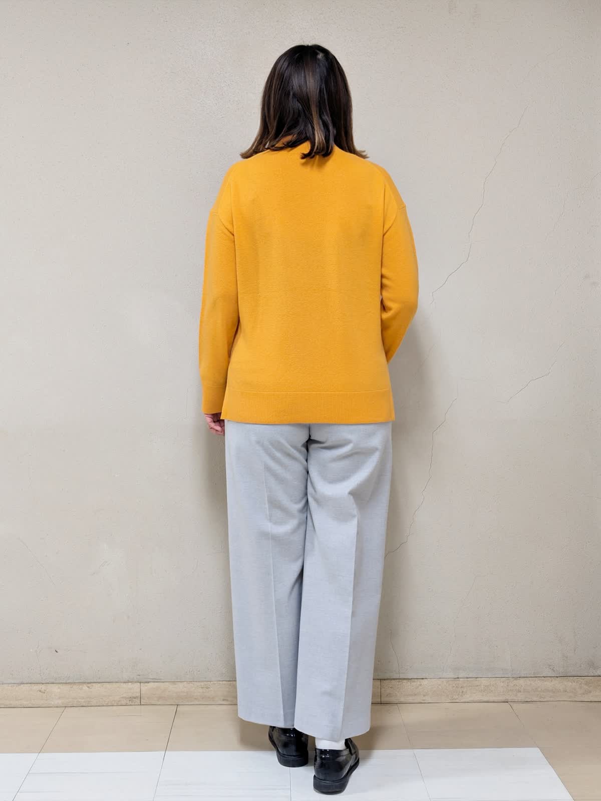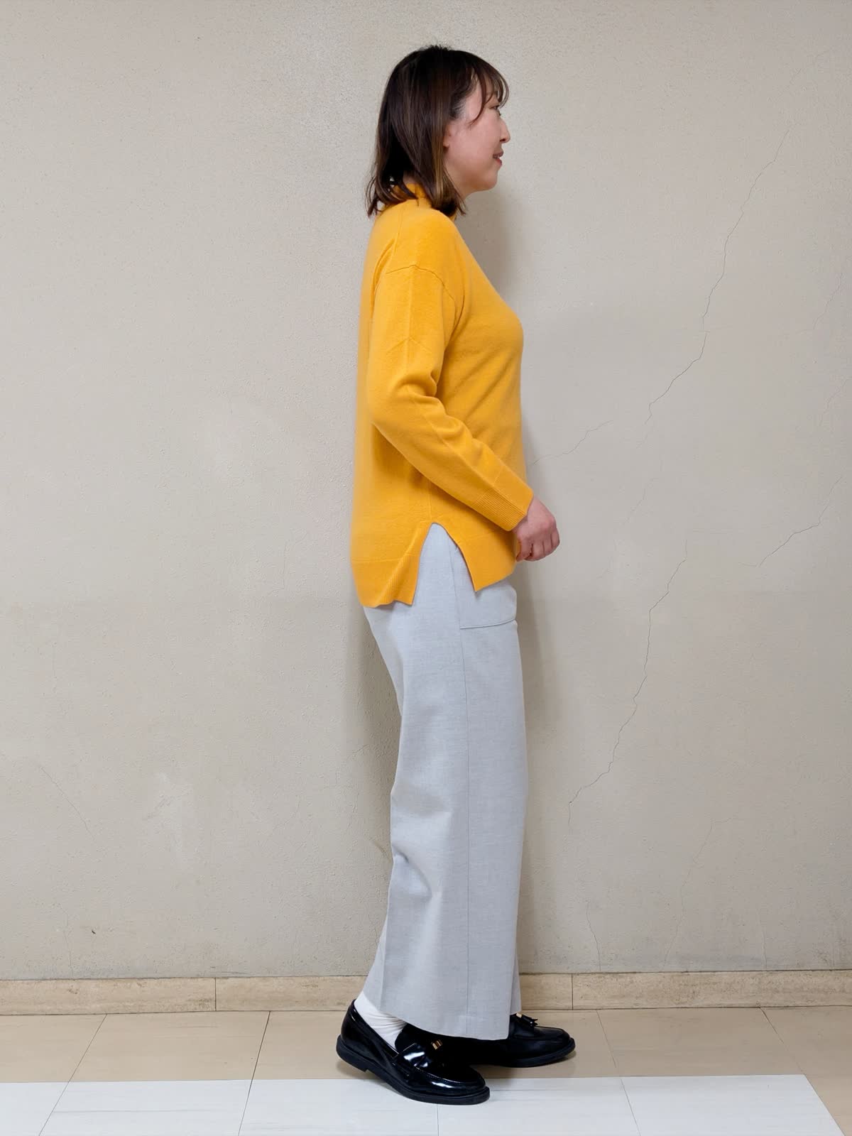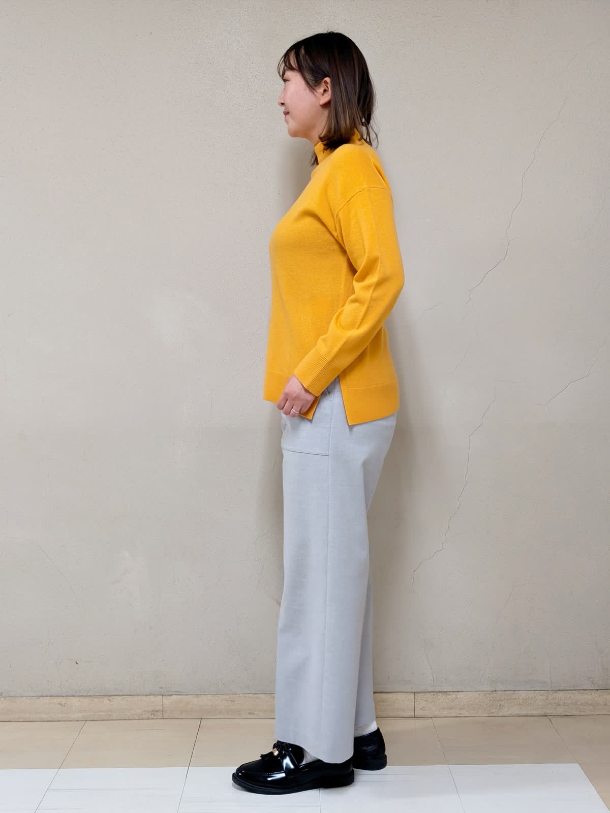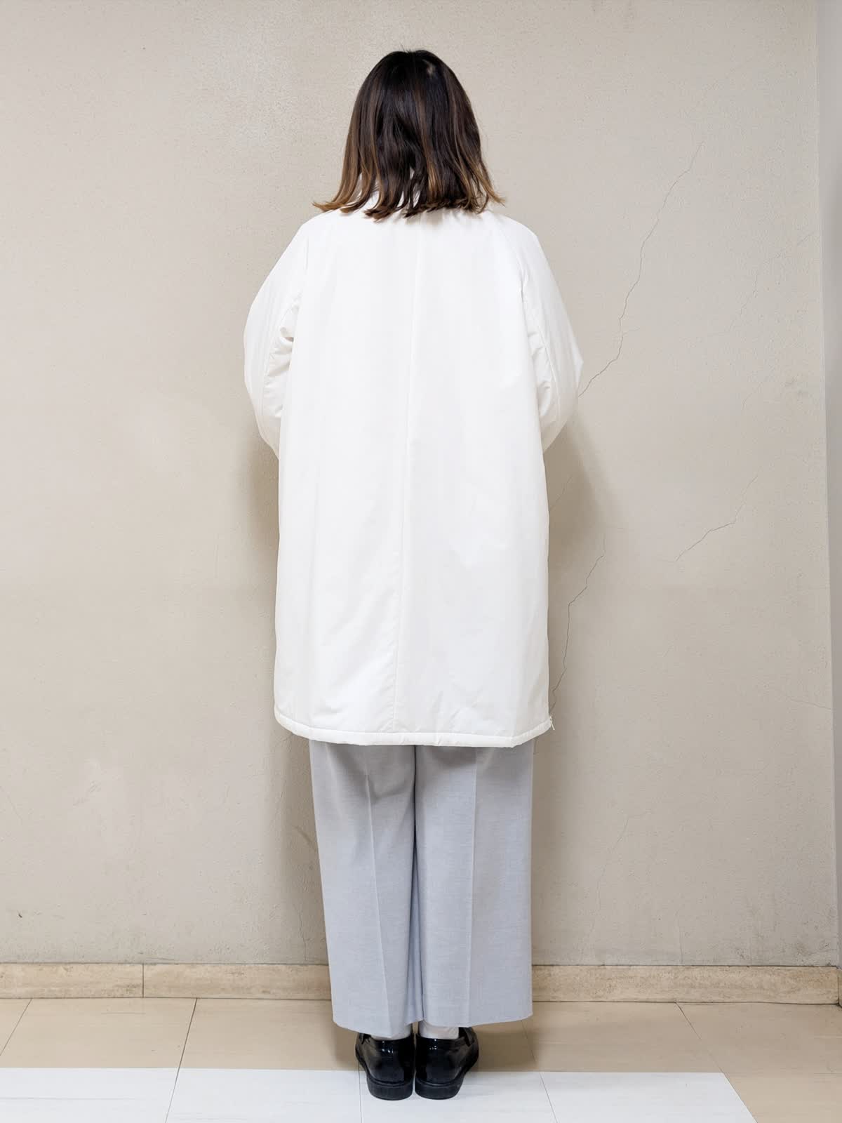 【着用サイズ】コート、ニット:フリー パンツ:11号【着用カラー】コート:アイボリー ニット:オレンジ パンツ:グレー 春先まで着られるお出掛けコーディネートです。アウターは中綿コートなので気軽に羽織れます。ジップを上まで閉めるとスタンドカラーになるので、首元まで暖かいです。中に合わせたニットはカシミヤ混で着心地が良く、差し色としてもGood!グレーベイカーパンツを合わせて明るいカラーでまとめました。