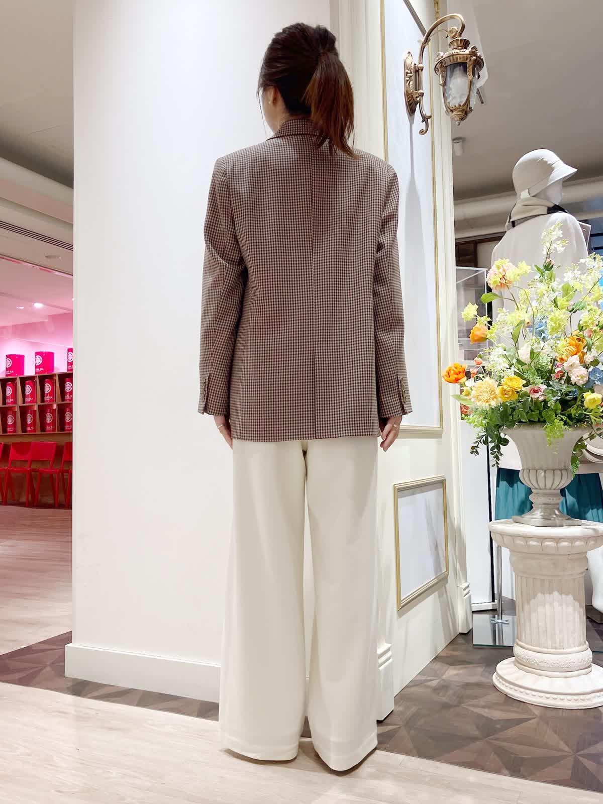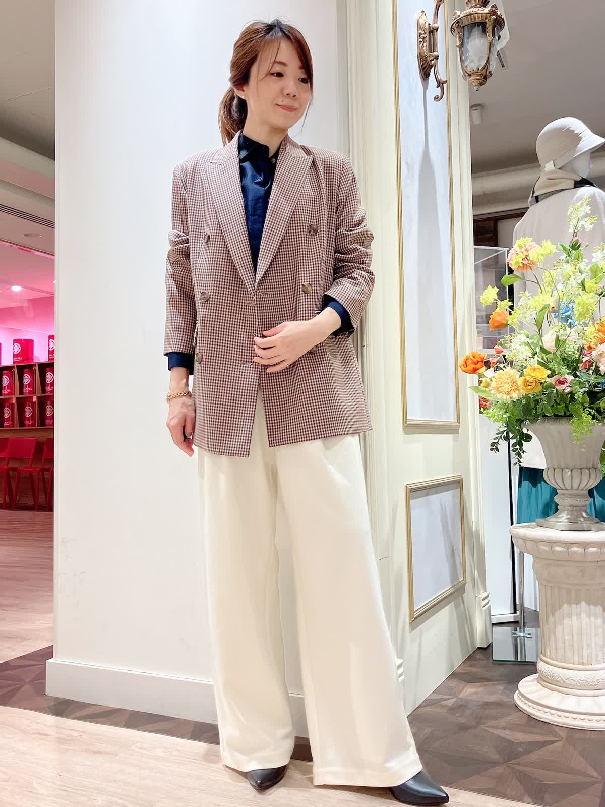 【着用サイズ】ジャケット:9号 ブラウス:9号 パンツ:7号 【着用カラー】ジャケット:柄小 ブラウス:ネイビー パンツ:アイボリー コーディネートのテーマはマニッシュな通勤スタイリングです。 ライトコートとしても着用できる、オーバーサイズのジャケットは、トレンドのチェック柄で。アイボリーのパンツで軽さを出して、これからの時期の通勤コーデにぴったりです。