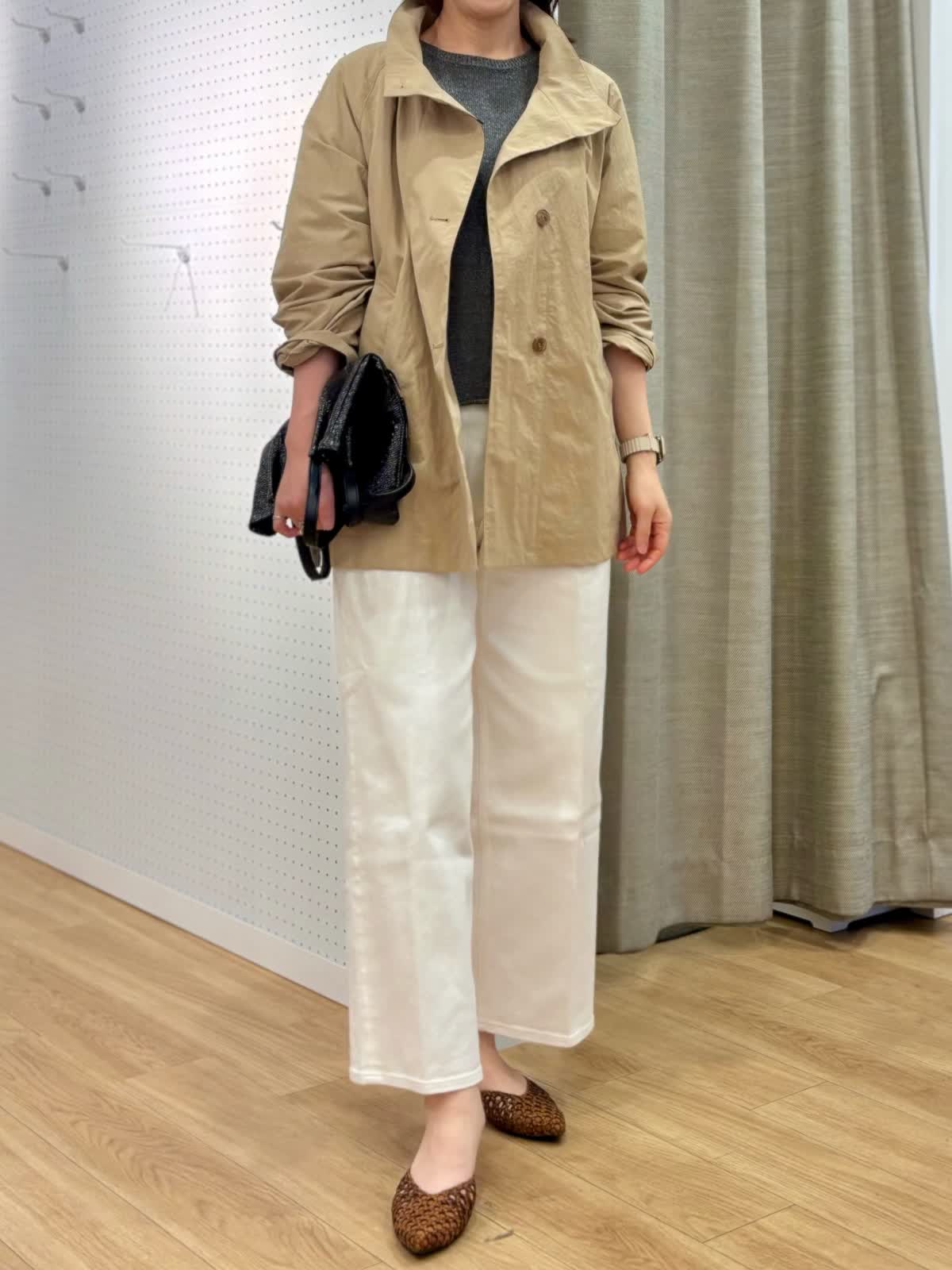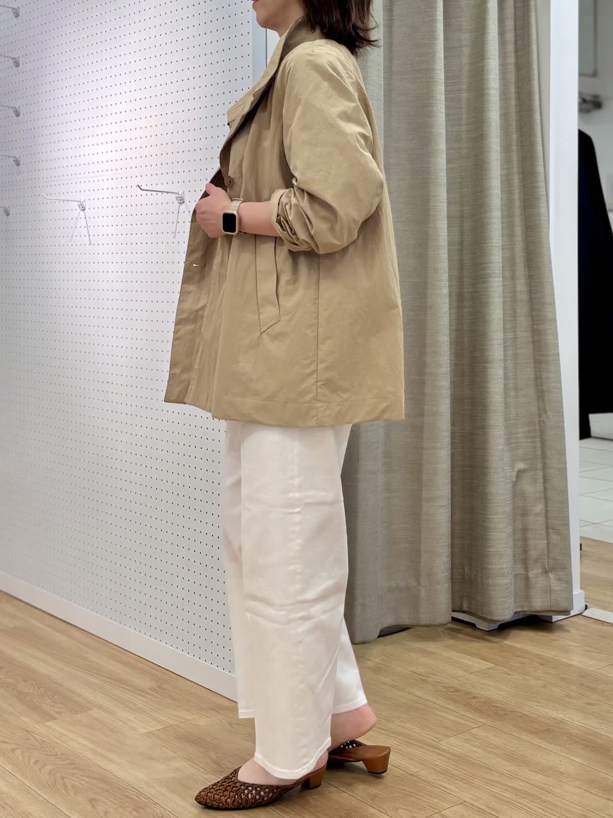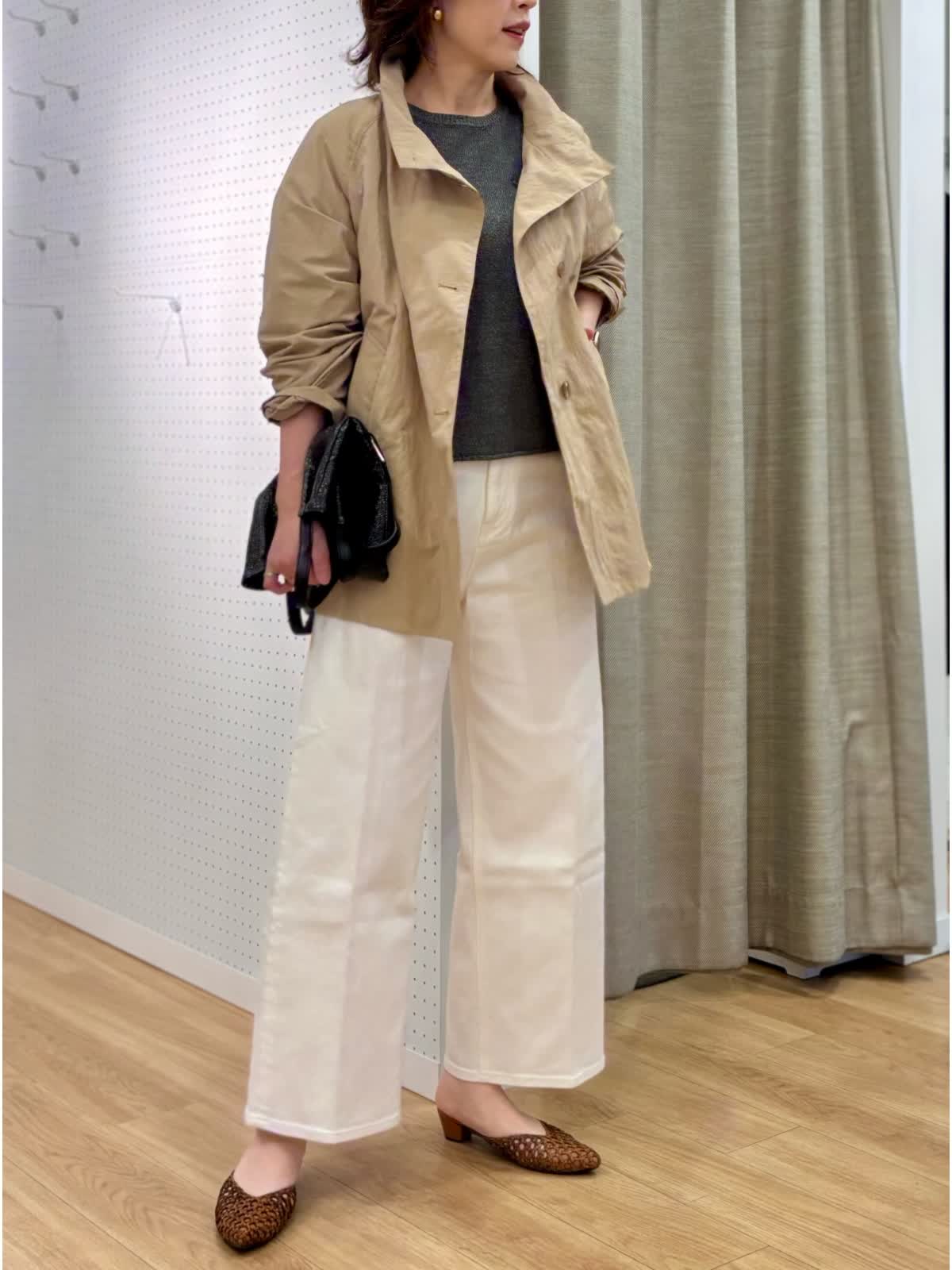 【着用カラー/サイズ】 コート:キャメル/フリー ニット:ミディアムグレー/フリー パンツ:ホワイト/11号 春へスイッチ!テントコートでお出掛けコーデ。少しハリ感のあるコートは緩やかなAラインになったシルエットが可愛いです。とっても軽く ヒップ丈なのでお車や自転車などにも小回りきいて便利です。リラックス感のあるニットは1枚でもロンTなどレイヤードしてもおしゃれを楽しめます。