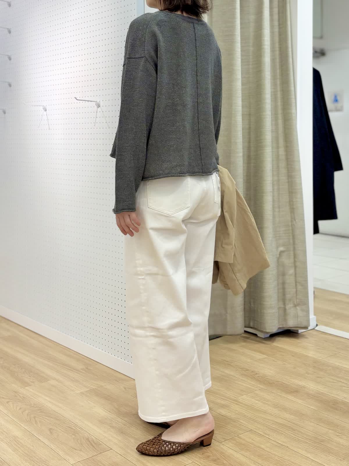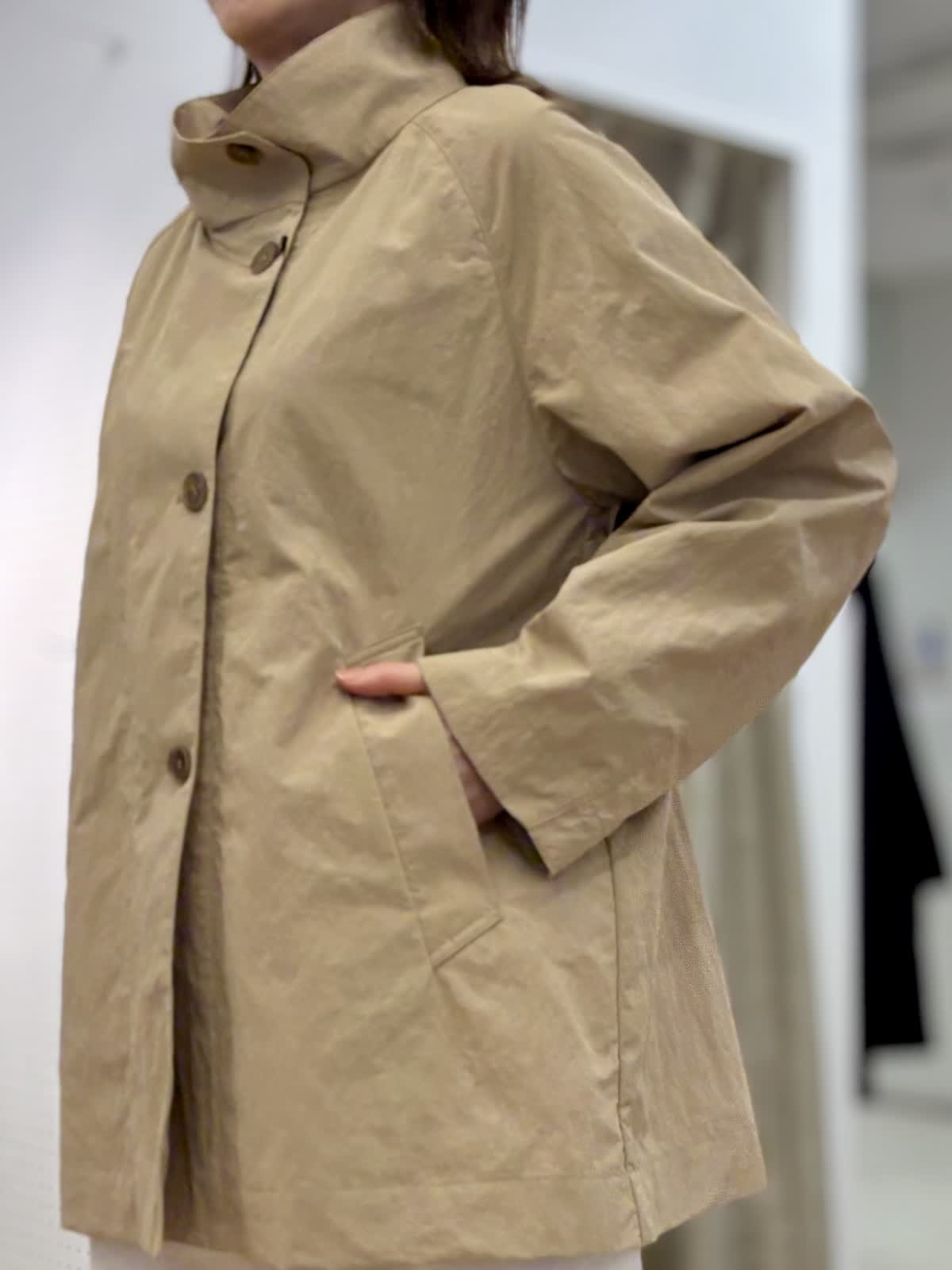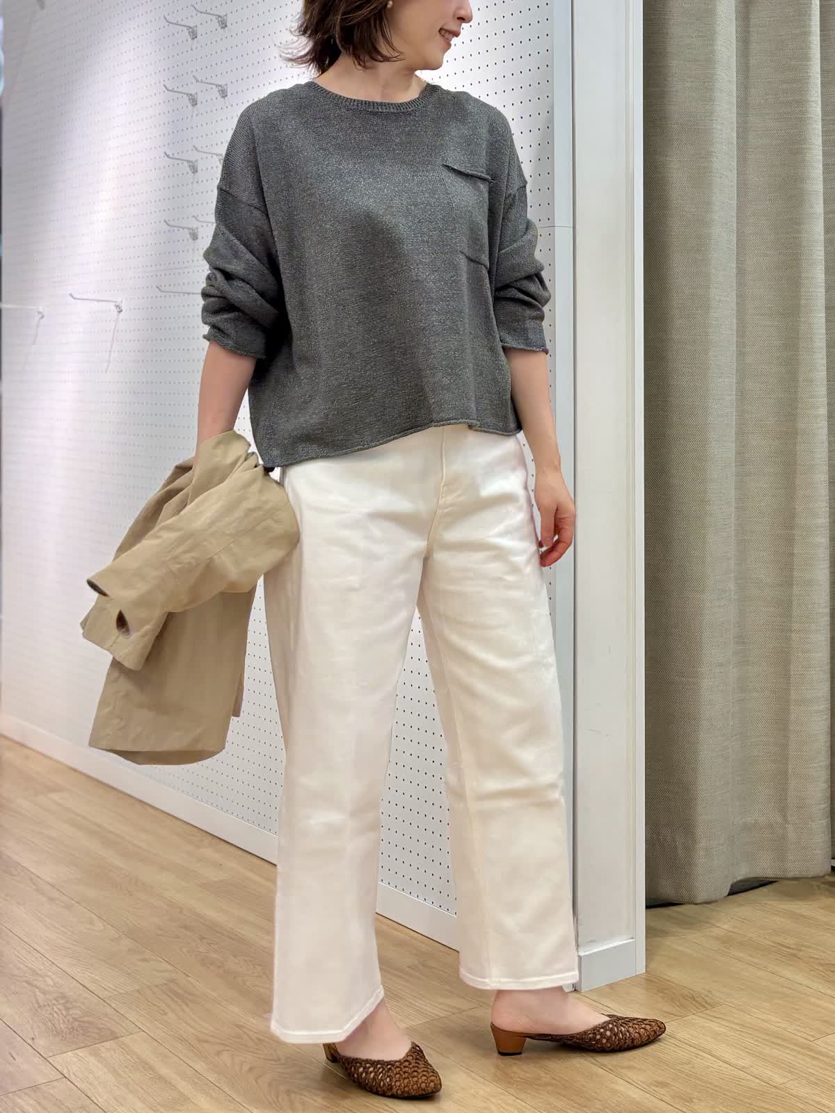 【着用カラー/サイズ】 コート:キャメル/フリー ニット:ミディアムグレー/フリー パンツ:ホワイト/11号 春へスイッチ!テントコートでお出掛けコーデ。少しハリ感のあるコートは緩やかなAラインになったシルエットが可愛いです。とっても軽く ヒップ丈なのでお車や自転車などにも小回りきいて便利です。リラックス感のあるニットは1枚でもロンTなどレイヤードしてもおしゃれを楽しめます。