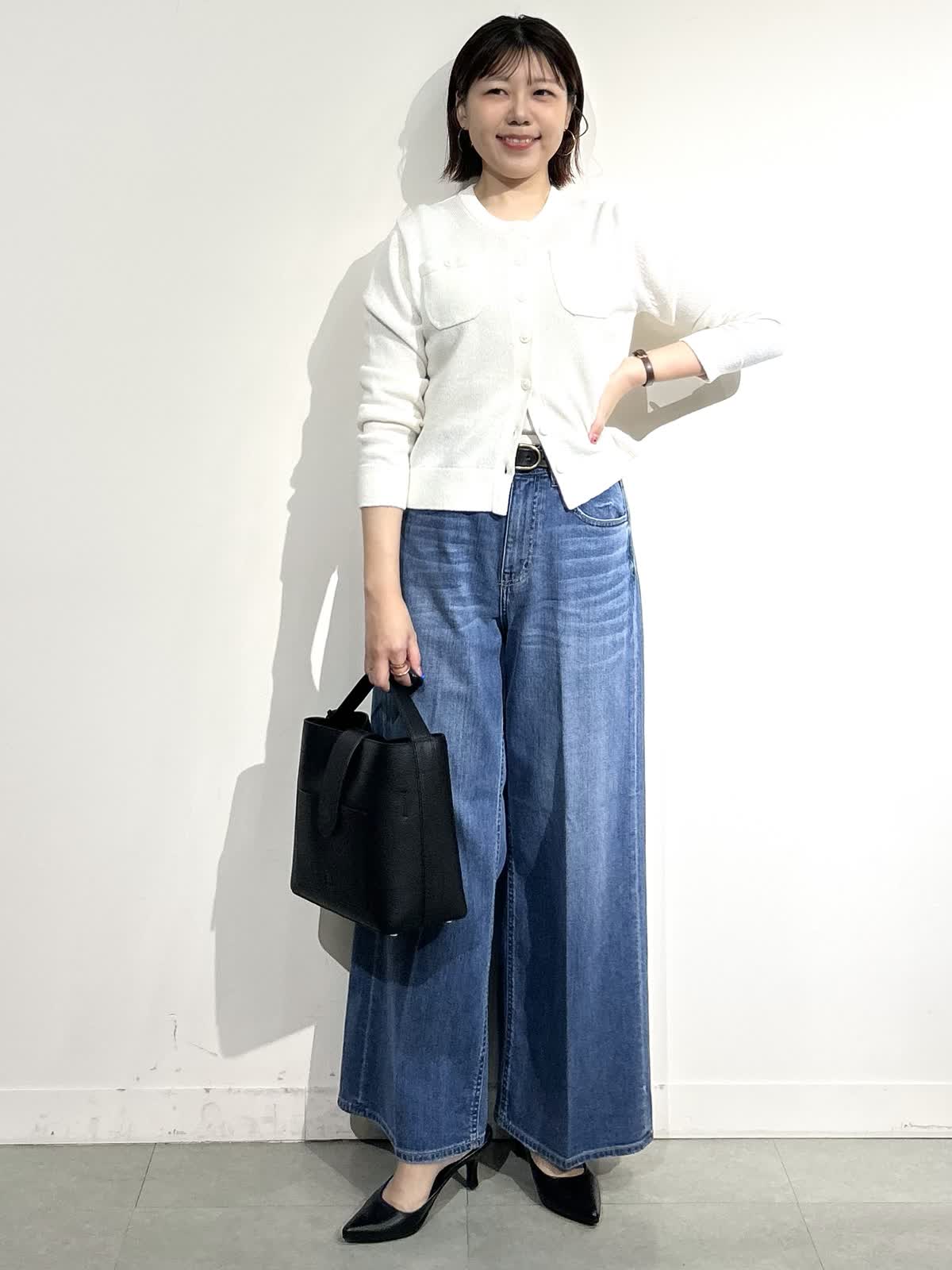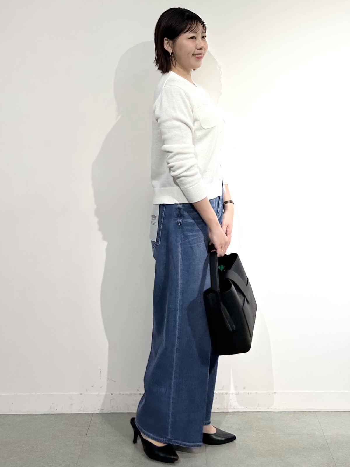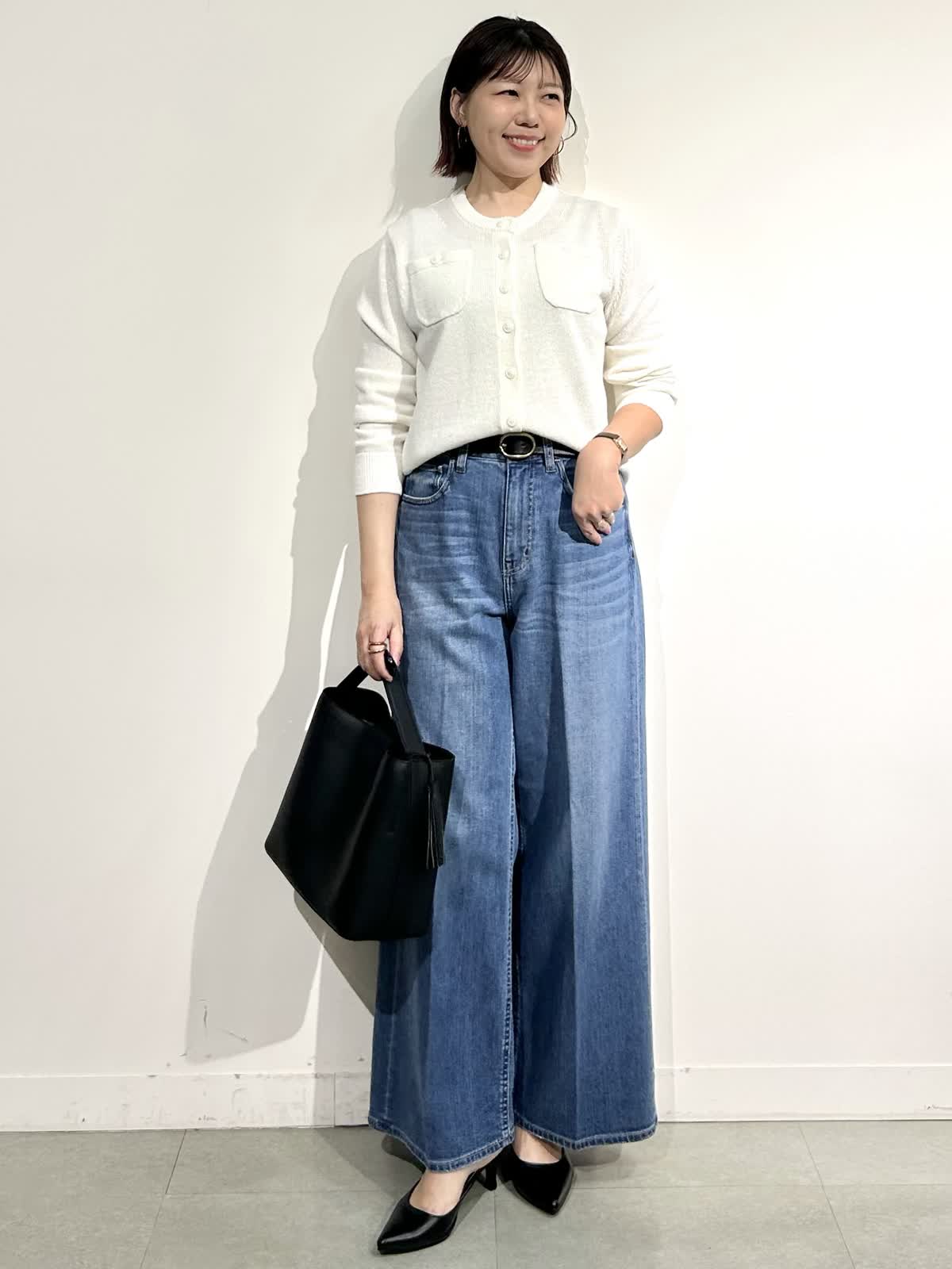 【着用カラー】カーデ:オフホワイト デニムシャツ・パンツ:インディゴ バッグ:ブラック
