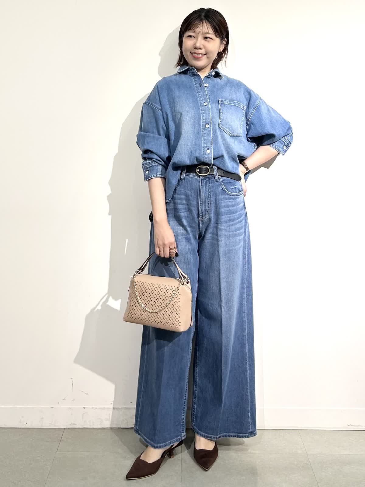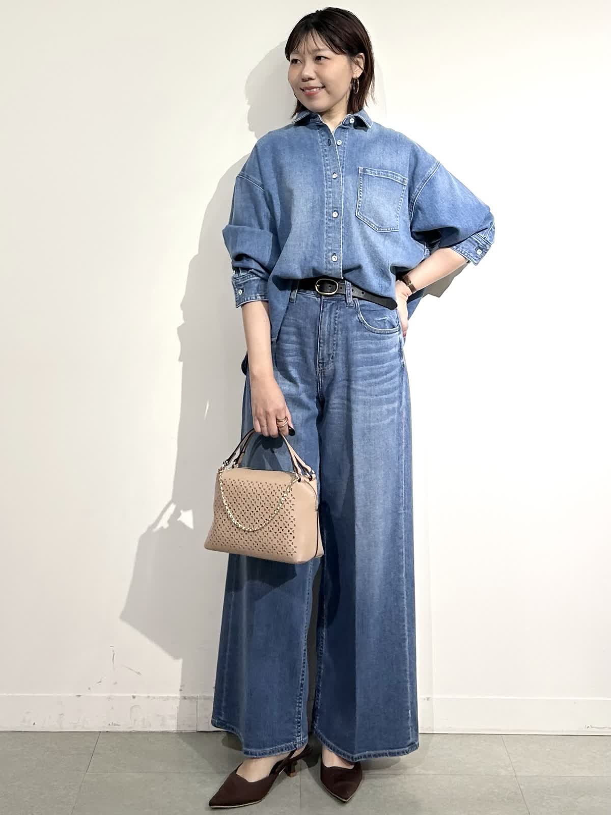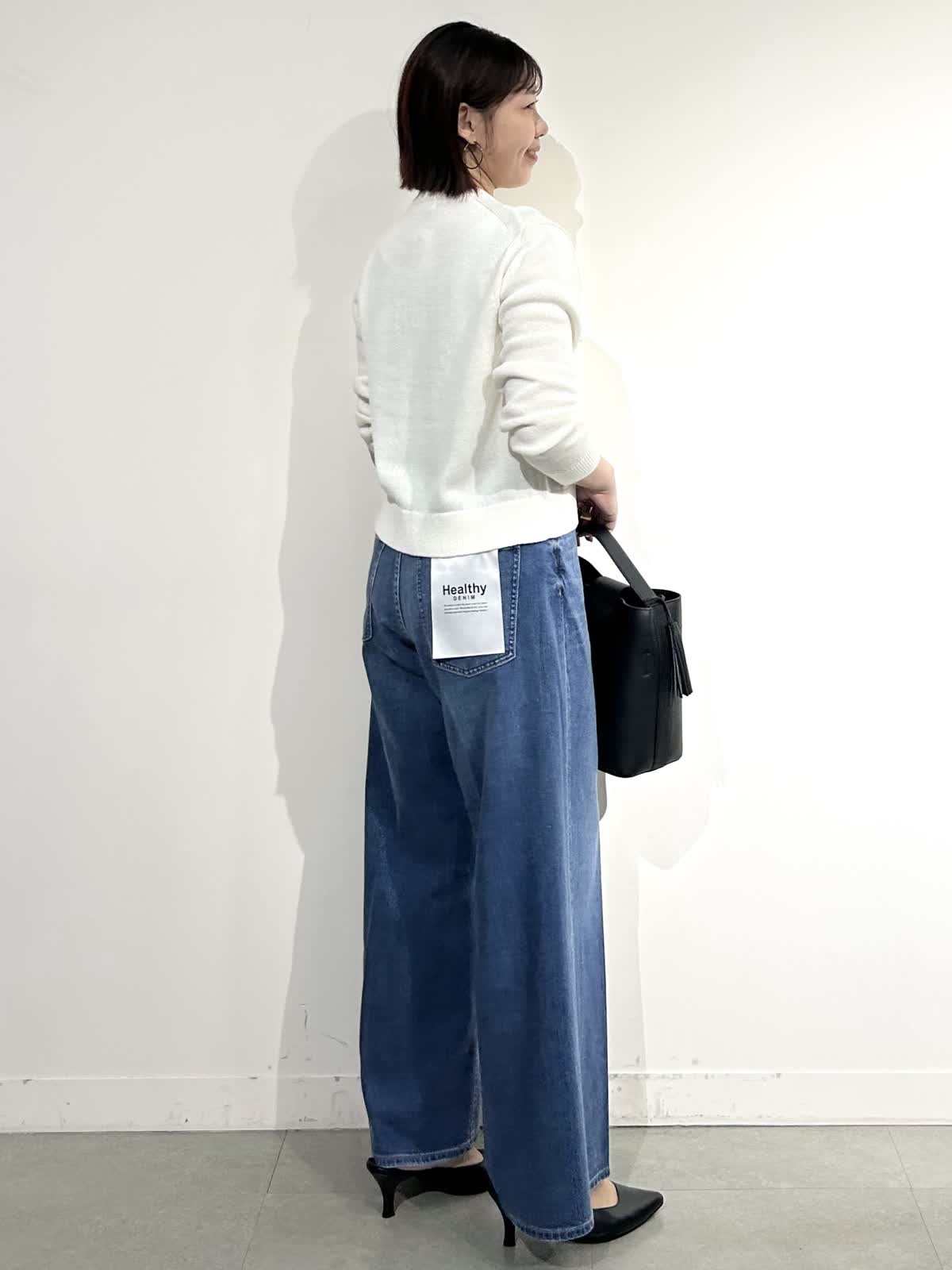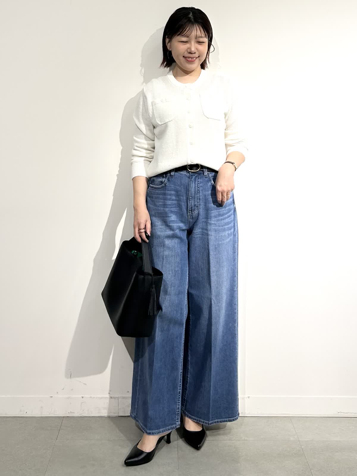 【着用カラー】カーデ:オフホワイト デニムシャツ・パンツ:インディゴ バッグ:ブラック