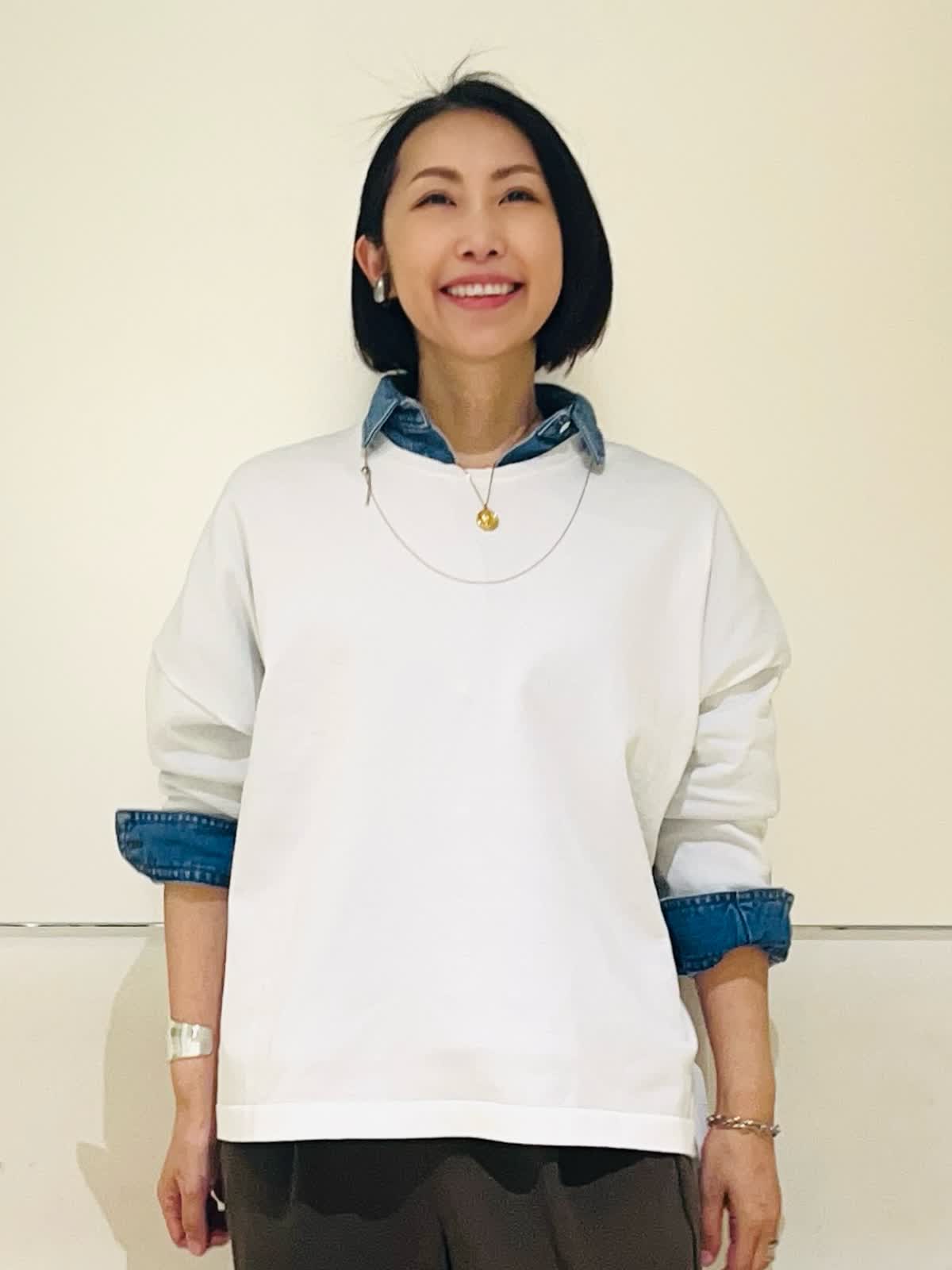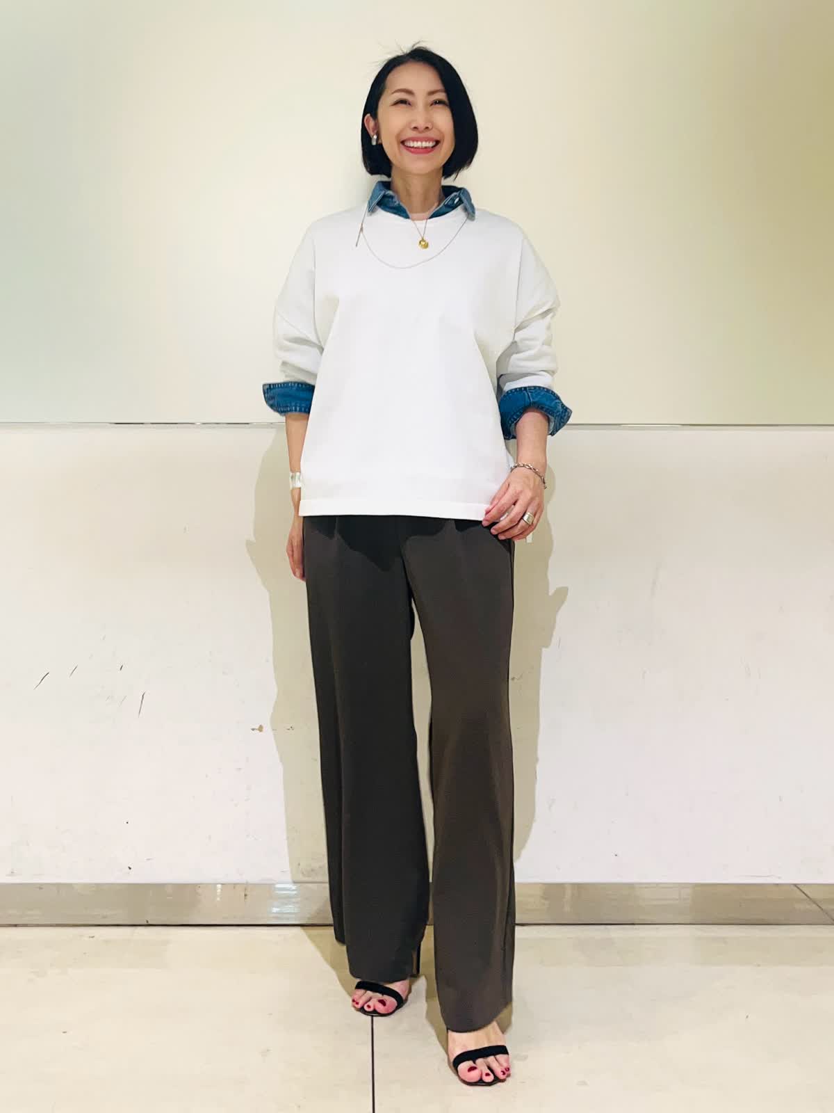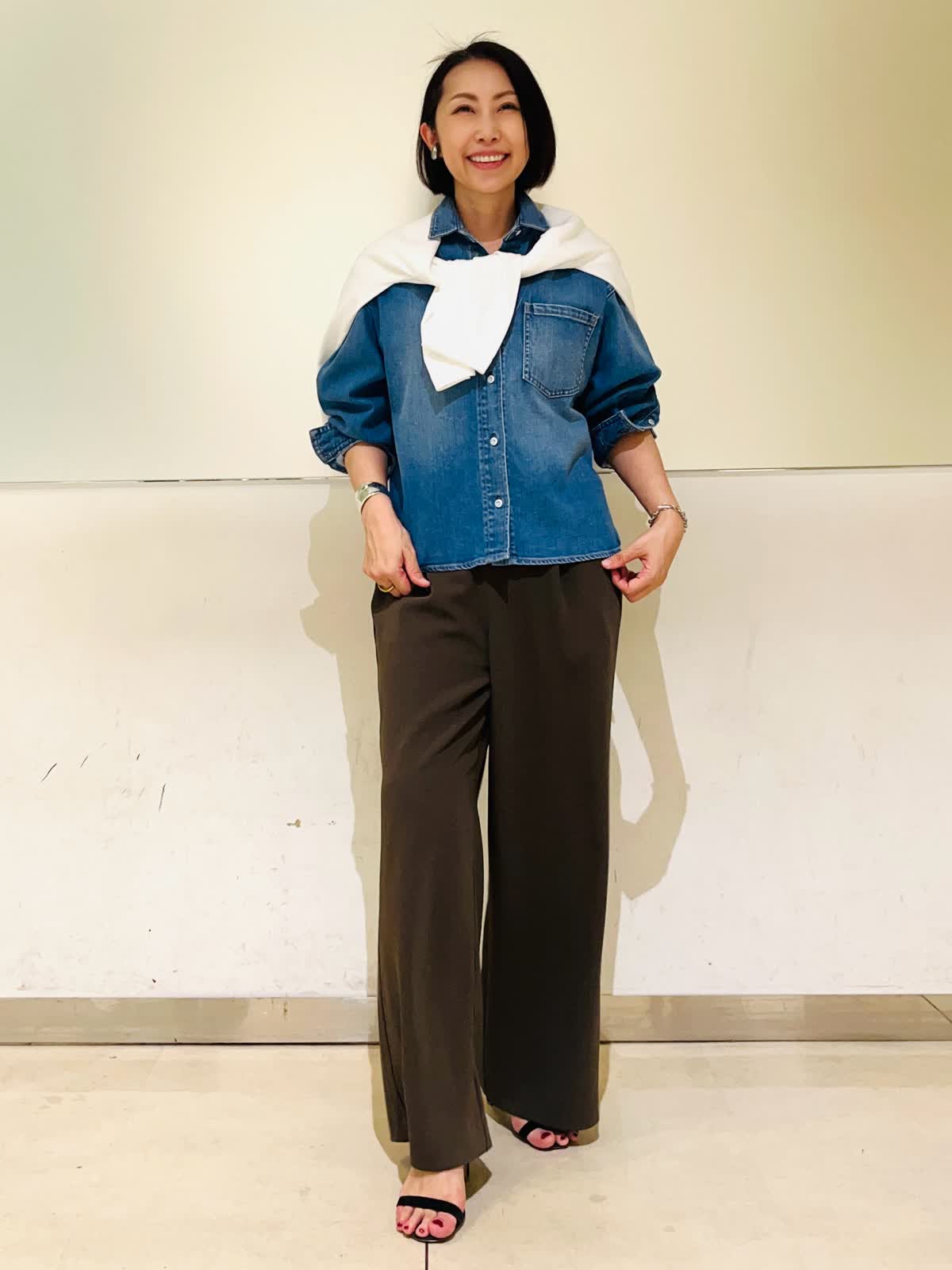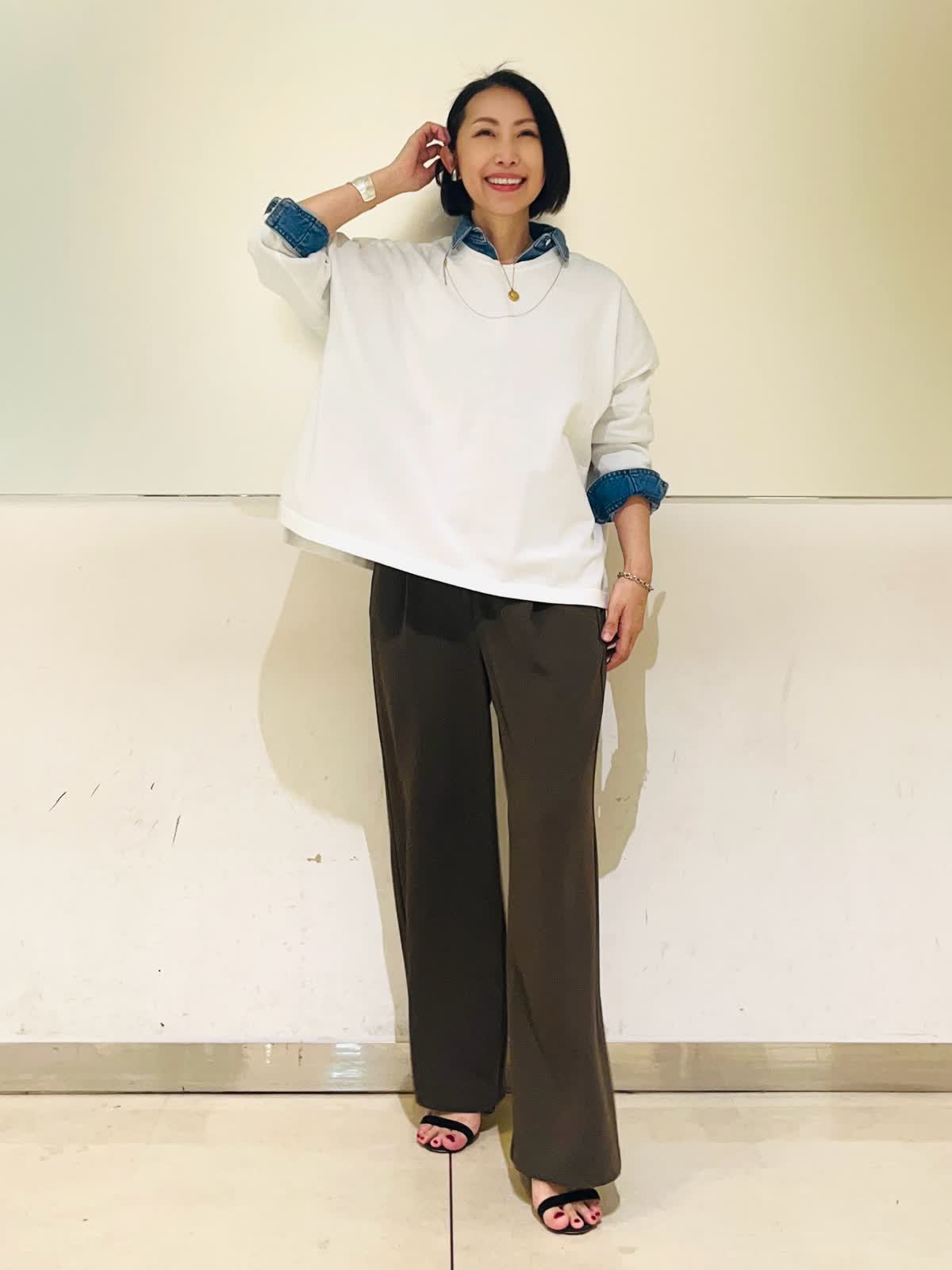 【着用アイテム】すべて9号 【着用カラー】シャツ:インディゴ ニット:オフホワイト パンツ:カーキ 春のお出かけコーディネート。大好きなシャツ×ニットのレイヤード。ヘルシーデニムのコラボシャツに白のニットをレイヤードして爽やかな春らしい雰囲気に仕上げました。デニムシャツはBIGシルエットなので、オーバーサイズのニットをレイヤード。暖かくなったら、ニットを肩がけしても可愛いです。