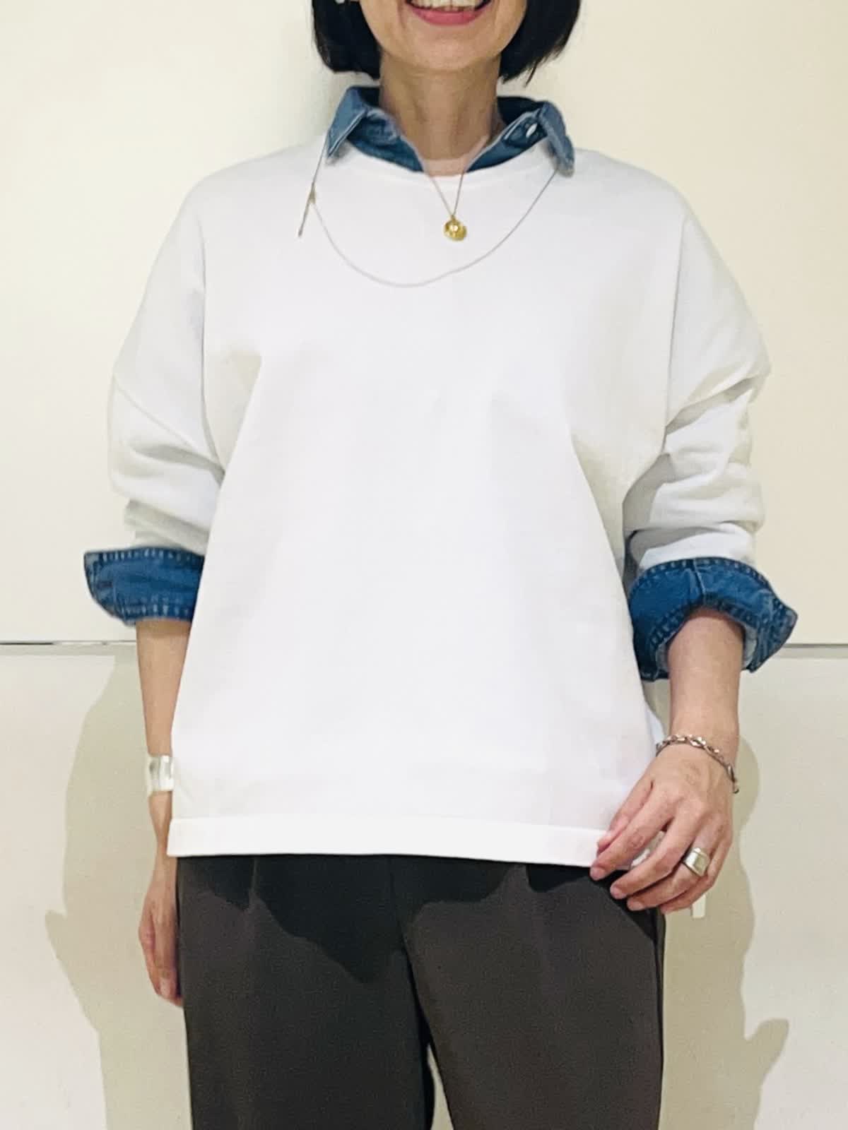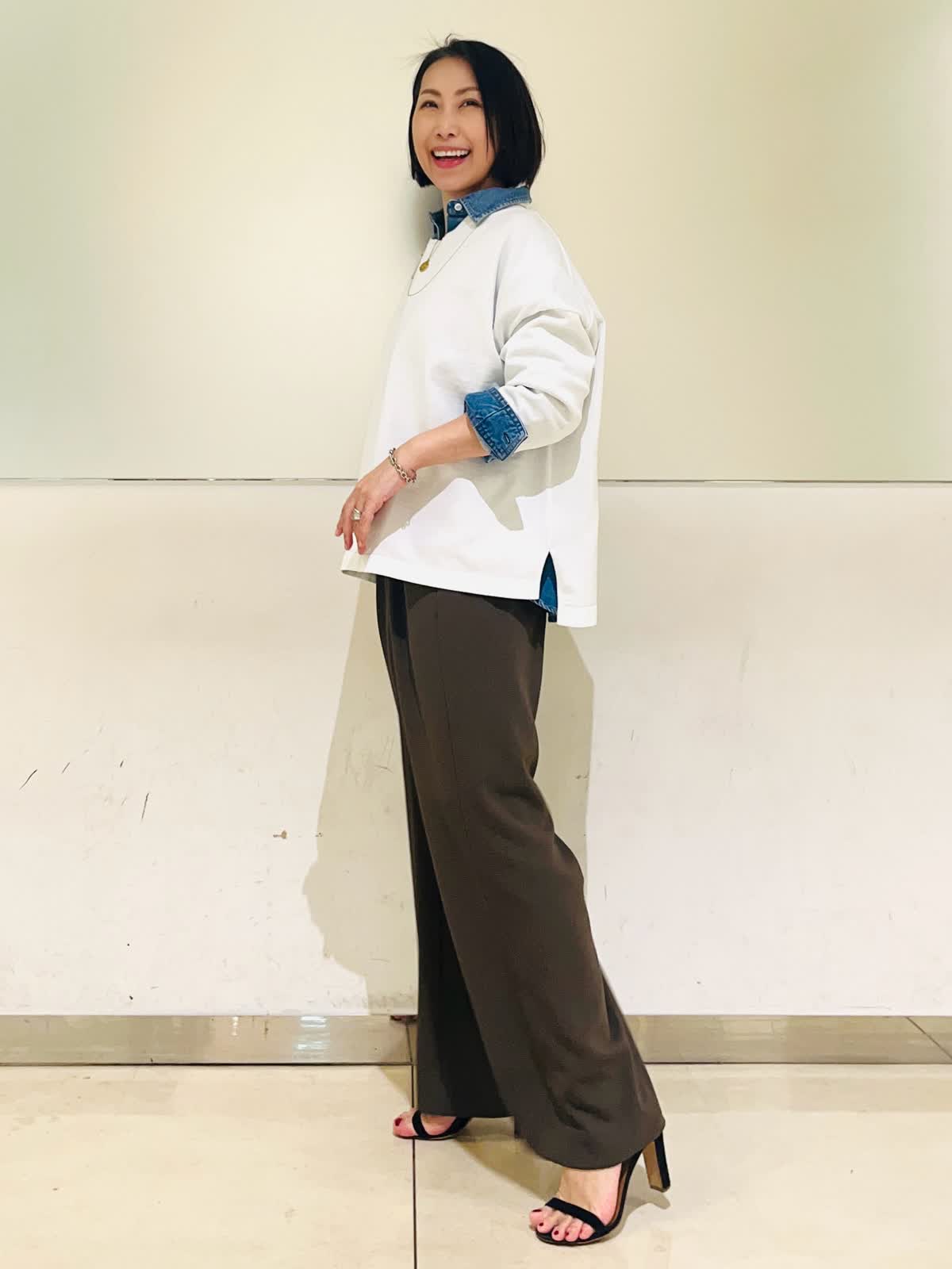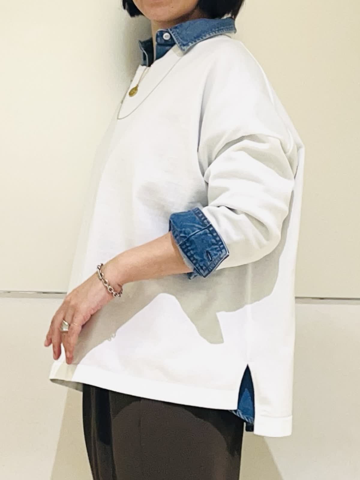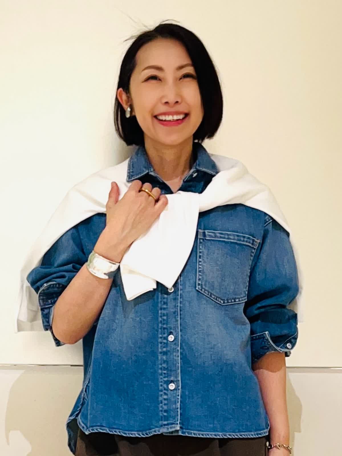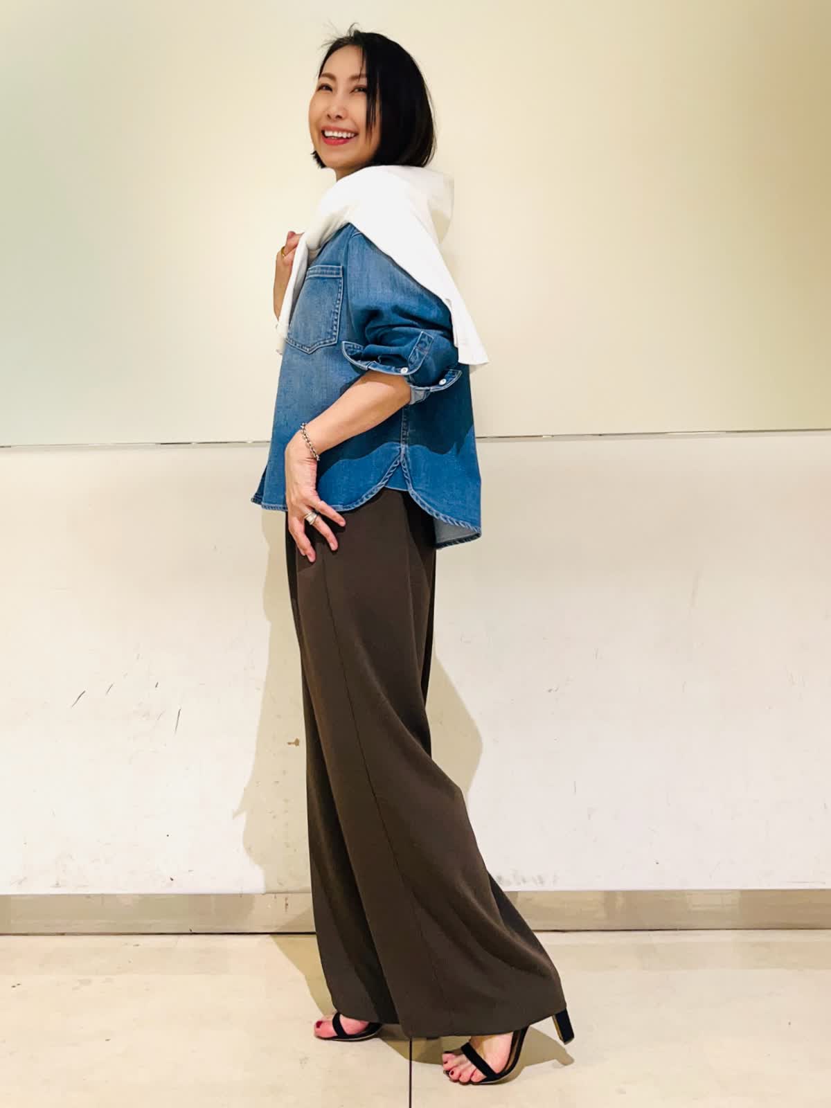 【着用アイテム】すべて9号 【着用カラー】シャツ:インディゴ ニット:オフホワイト パンツ:カーキ 春のお出かけコーディネート。大好きなシャツ×ニットのレイヤード。ヘルシーデニムのコラボシャツに白のニットをレイヤードして爽やかな春らしい雰囲気に仕上げました。デニムシャツはBIGシルエットなので、オーバーサイズのニットをレイヤード。暖かくなったら、ニットを肩がけしても可愛いです。
