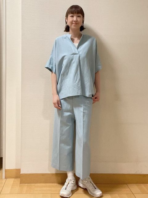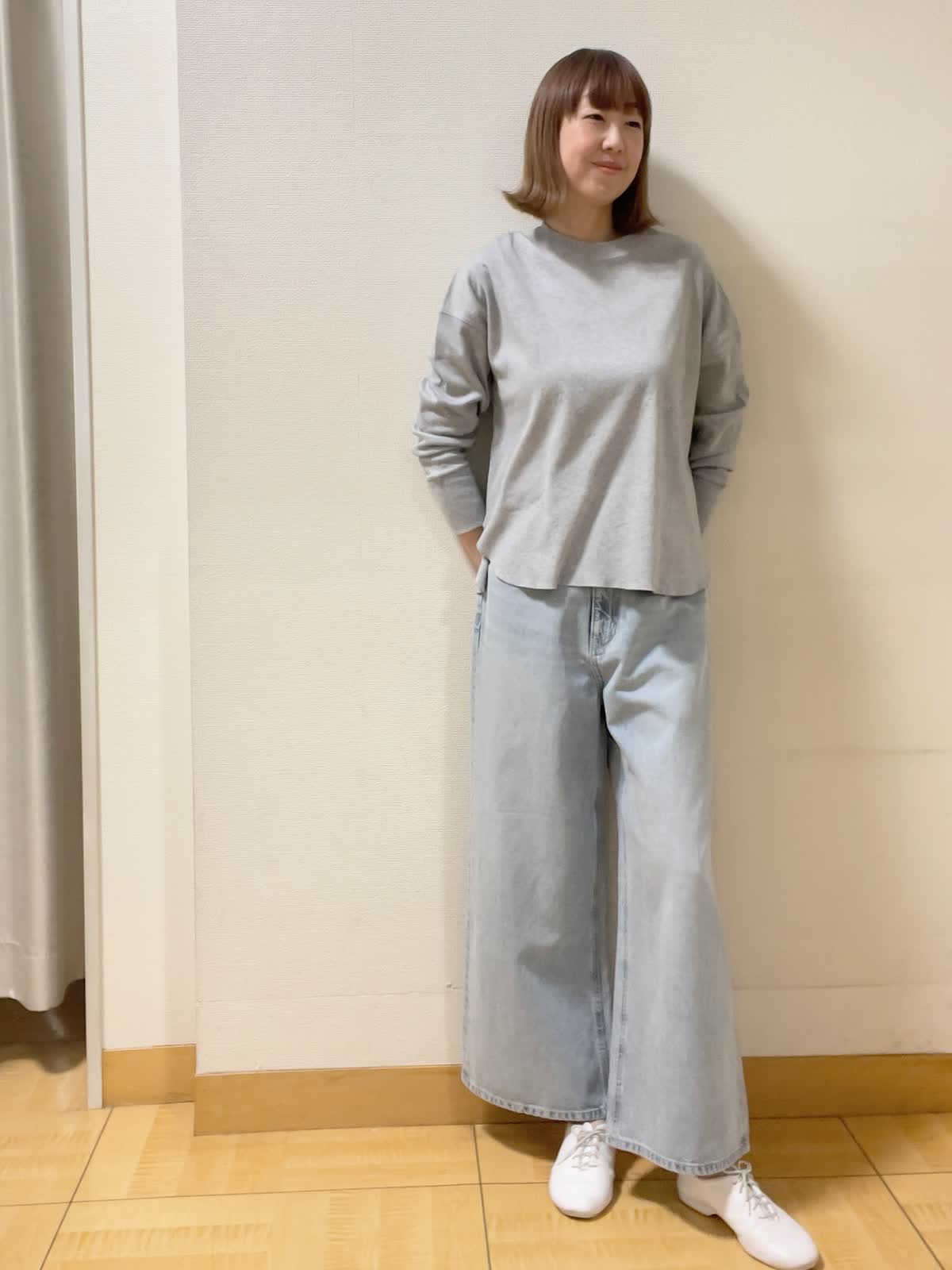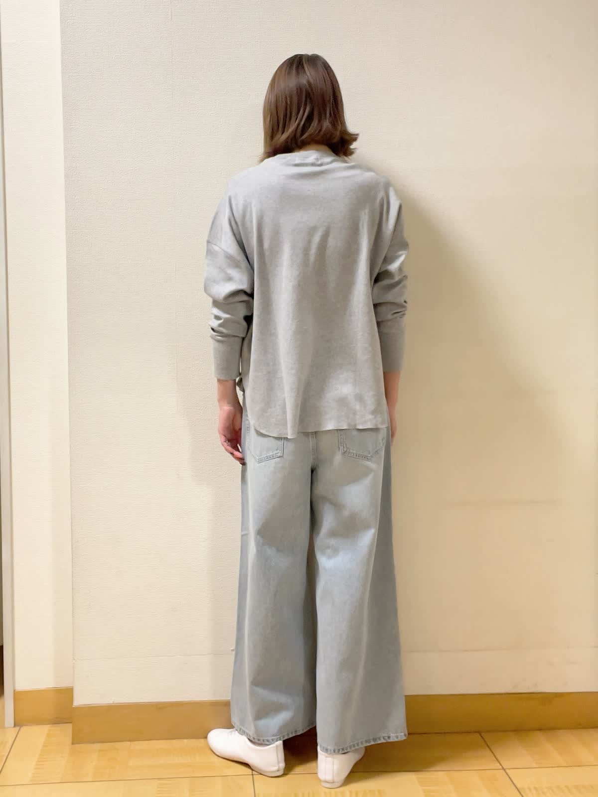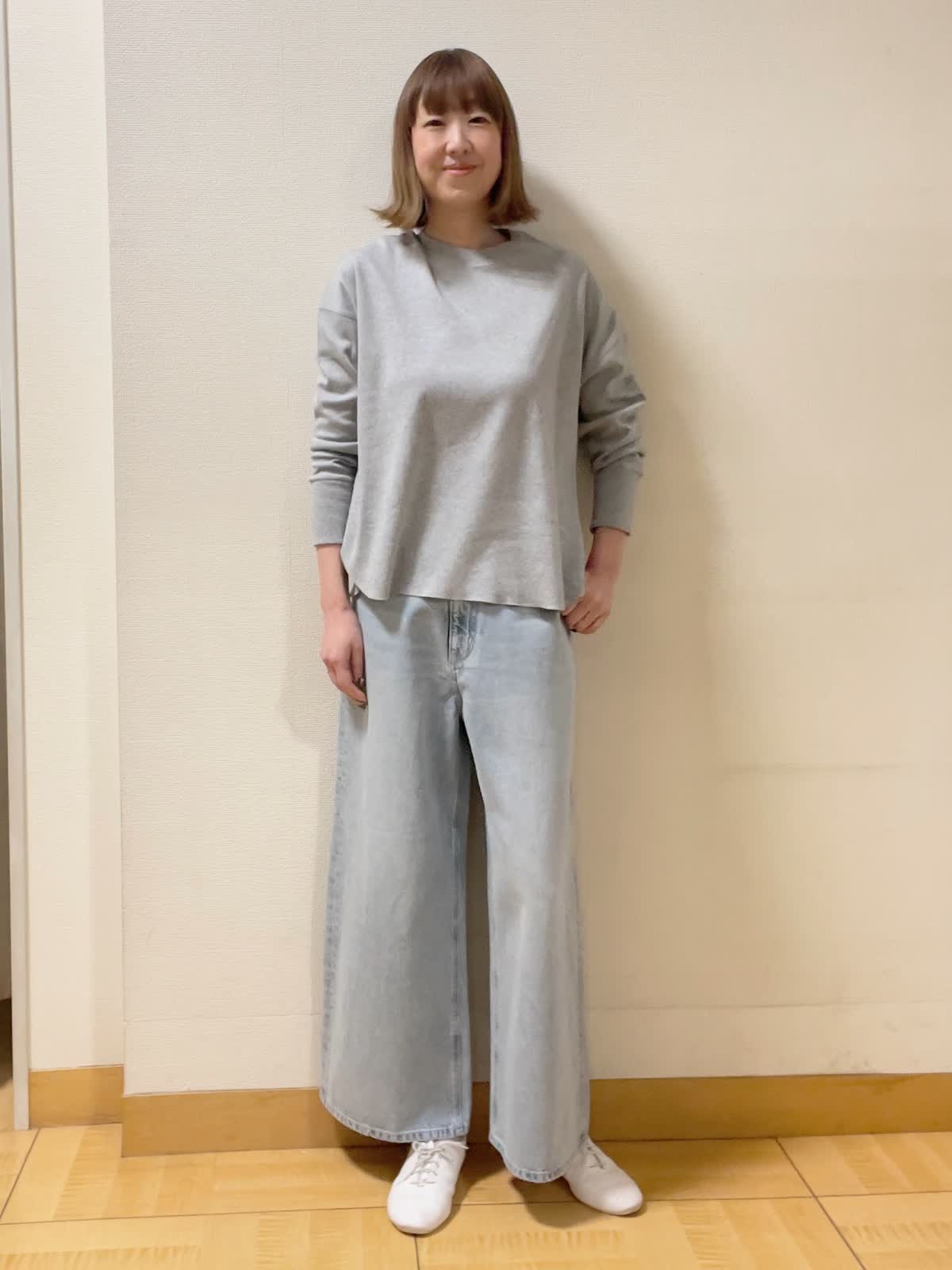 【着用サイズ】ニット:フリー パンツ:9号【着用カラー】ニット:グレー パンツ:サックス 休日スタイル ゆったりとしたサイズ感で軽やかな着心地のクルーネックニット。オーガニックコットン使用で洗える素材で、真夏以外使えるので重宝します。
