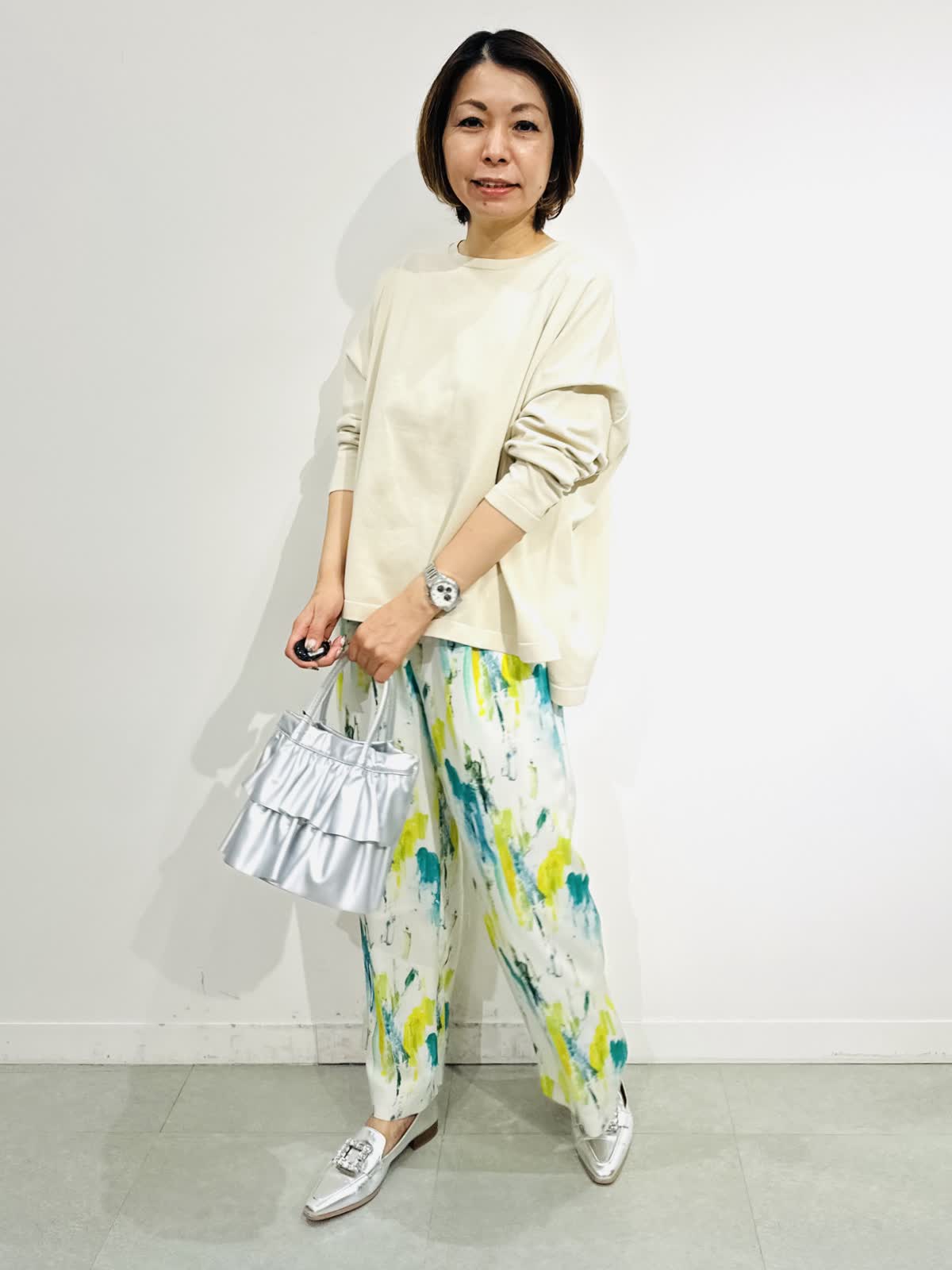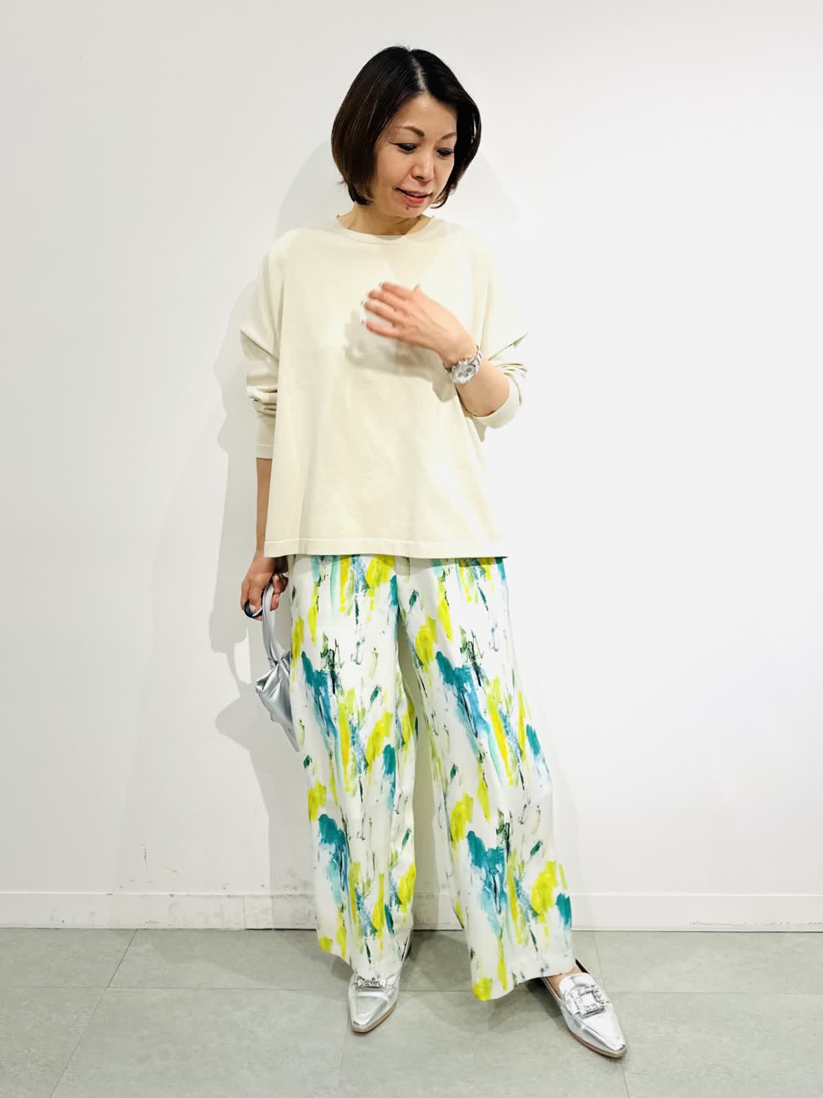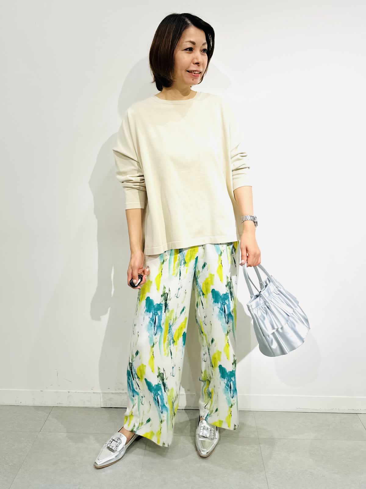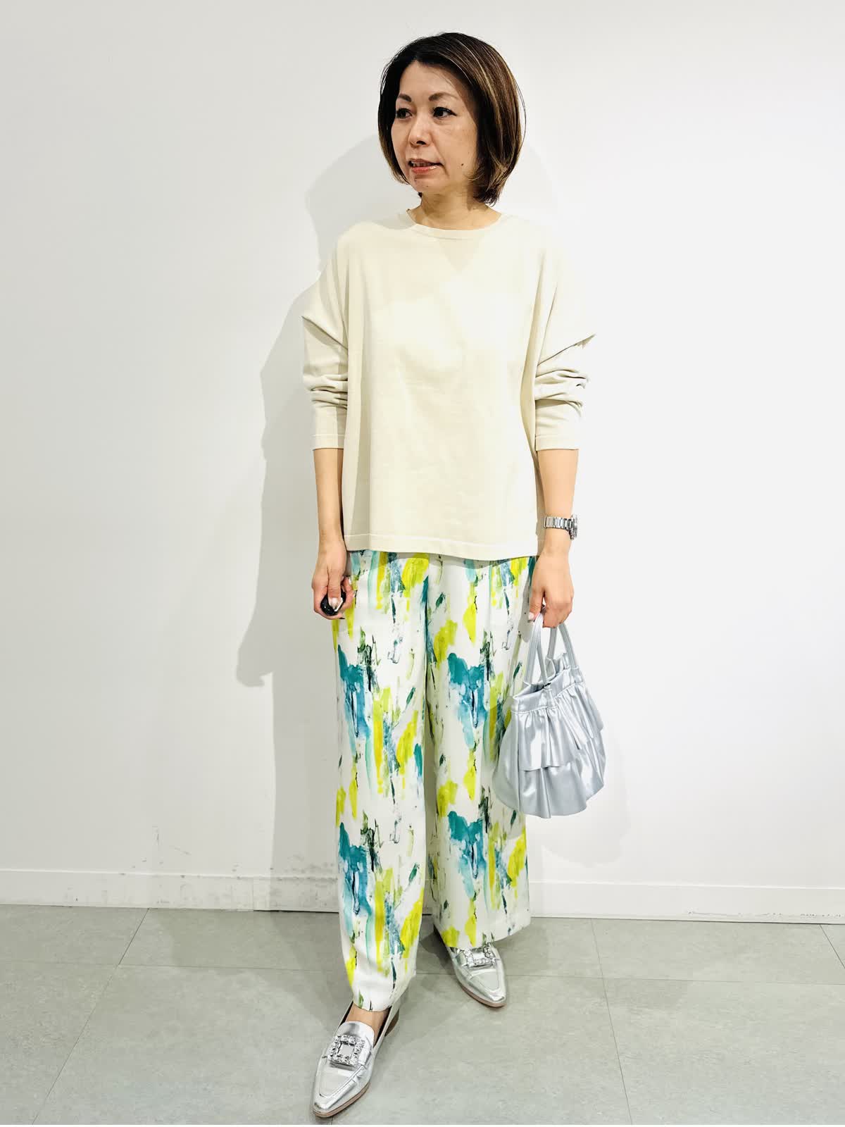 【着用サイズ】全て9号 【着用カラー】ニット:ベージュ パンツ:ペパーミント 春夏ピッタリ!休日コーデ。ニットは軽く膨らみがありハリ感があります。サラッとした上質コットンなので着心地が◎サイドスリット入りなので横から見てもオシャレ。パンツは、INEDオリジナルプリントでサラッとした肌触りとシワになりにくい素材。ウエスト調整可能なので楽ちんパンツです。着映えするプリントパンツで休日お出かけコーデおすすめです。
